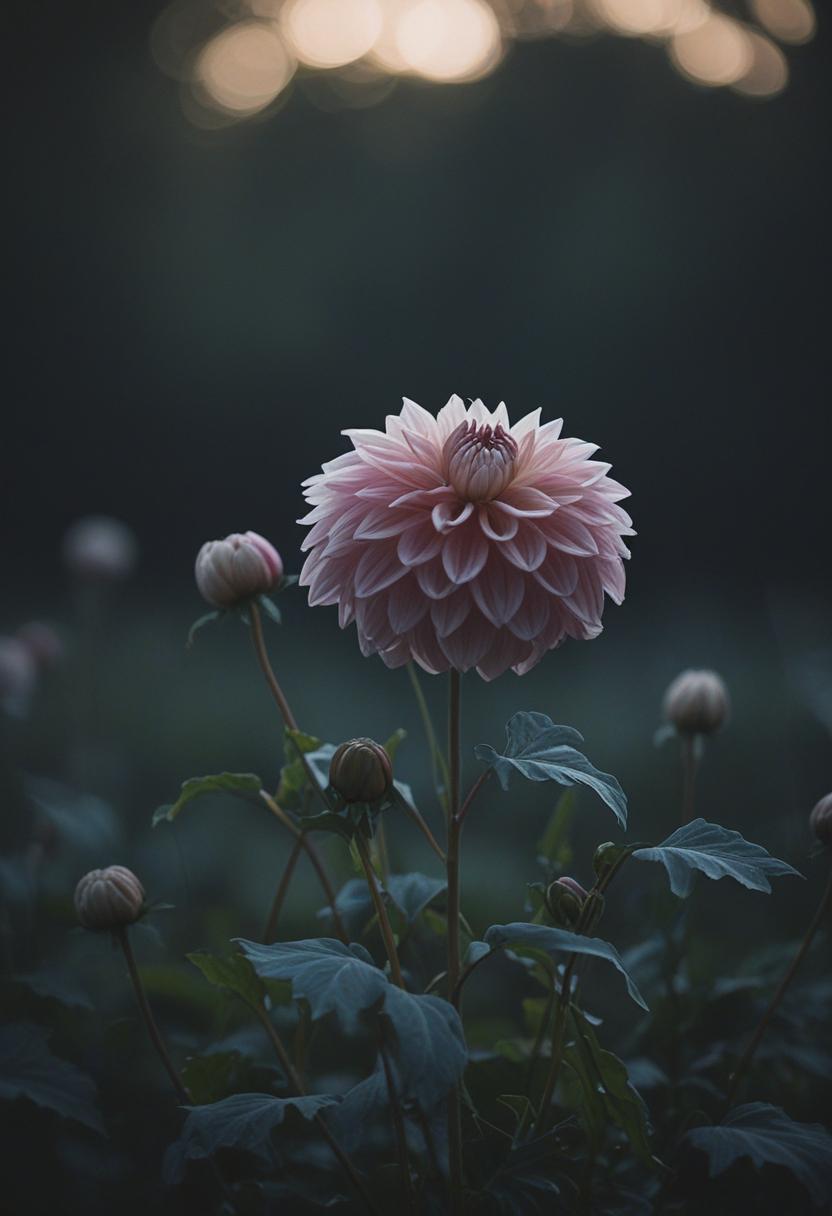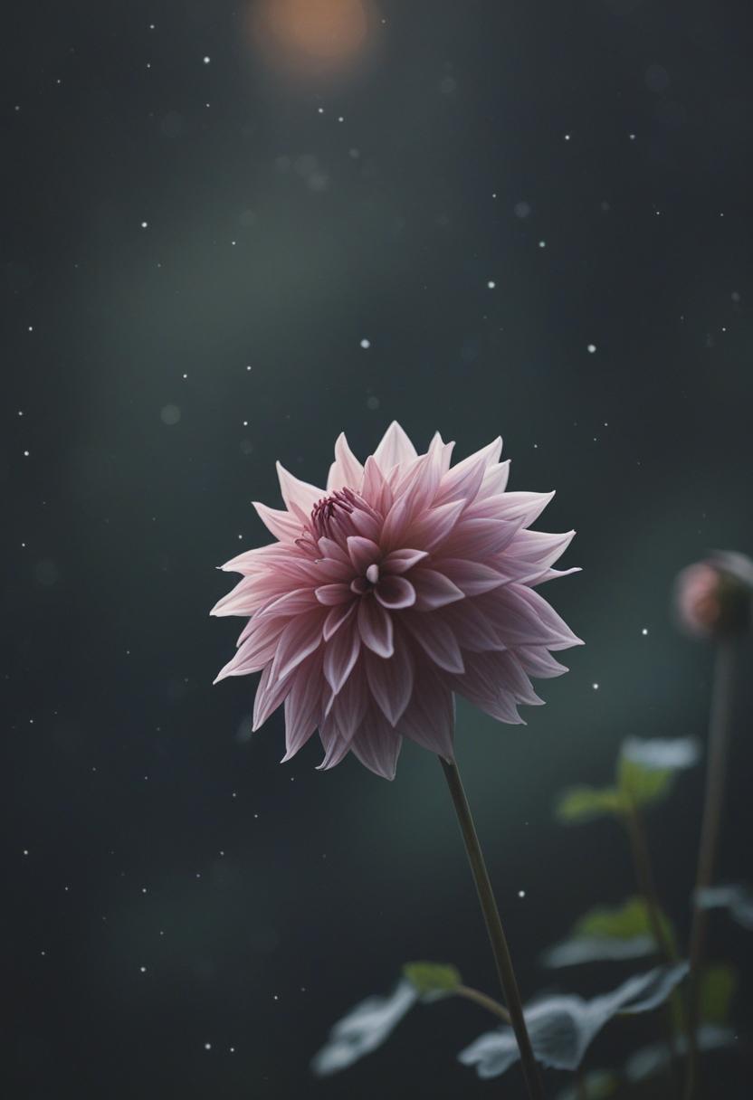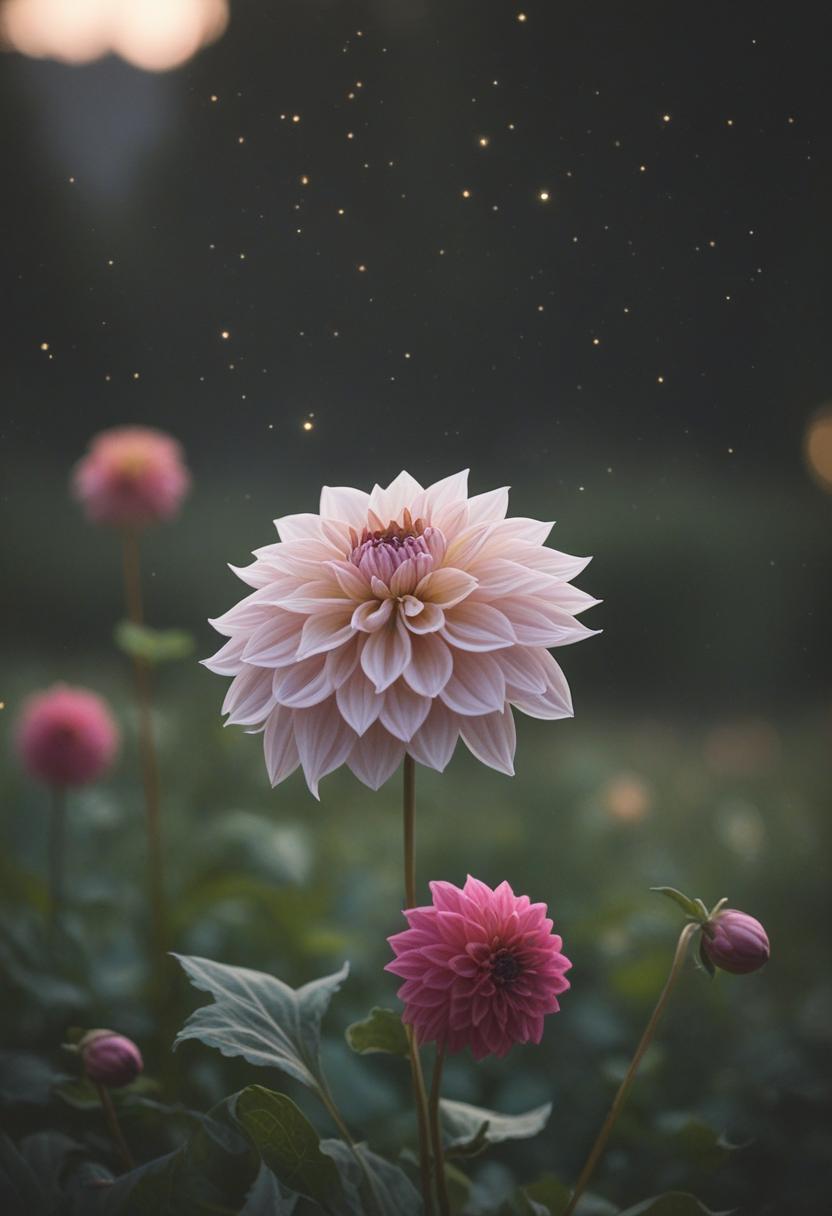 14. A wide-angle shot of a dahlia under starlight, evoking a nostalgic, dreamy atmosphere with soft lighting and a serene, romantic vibe.