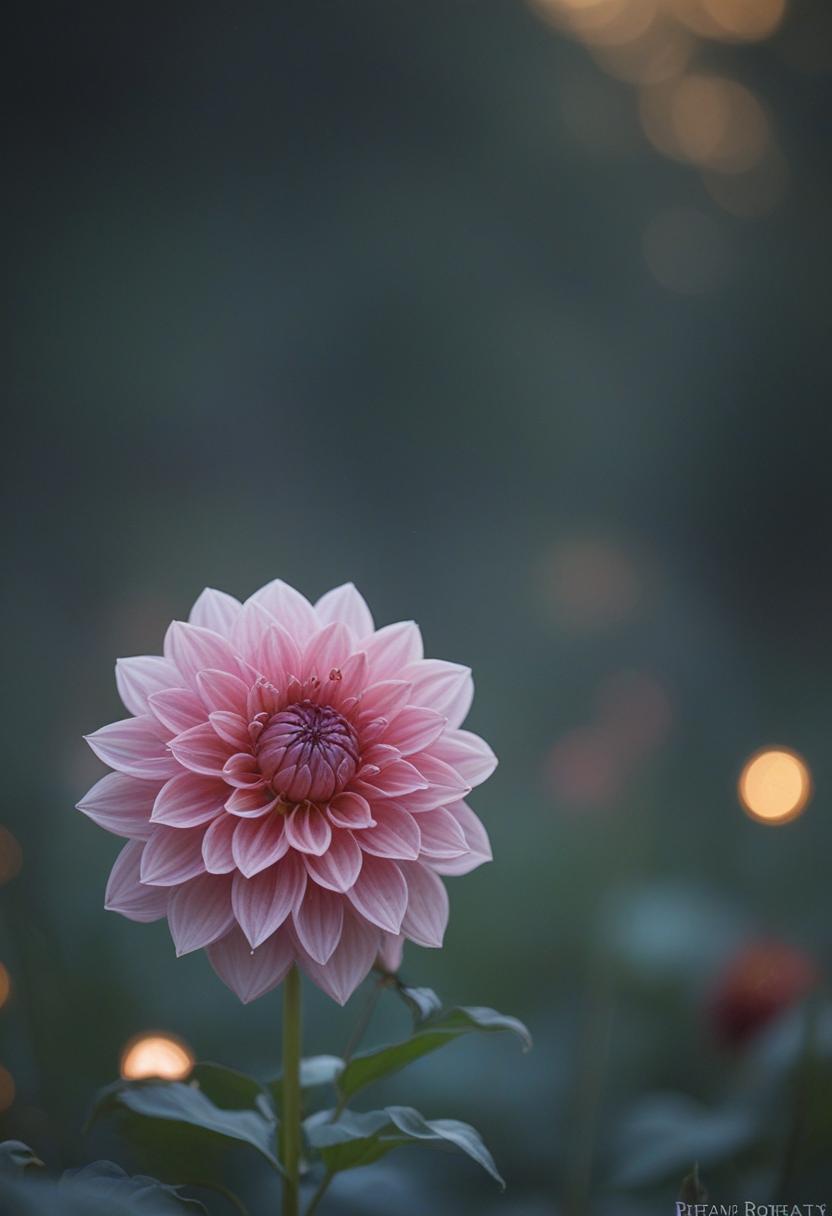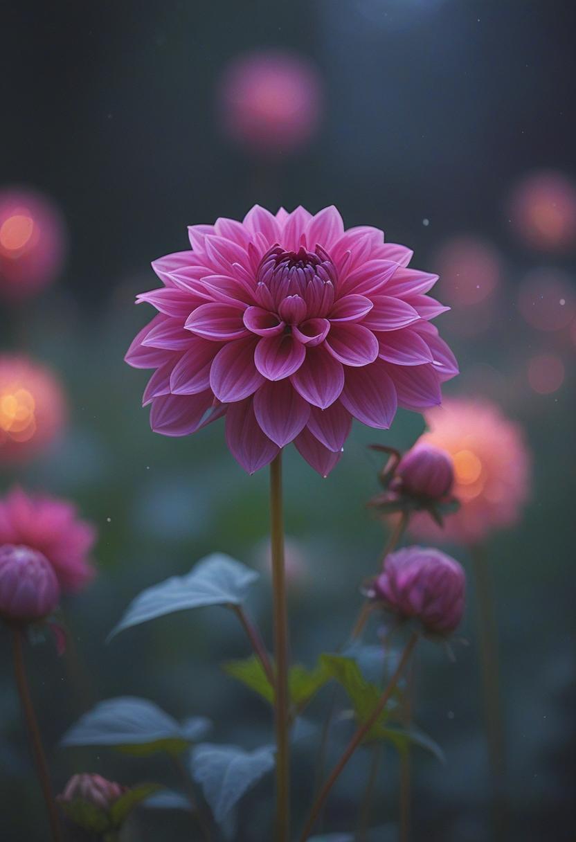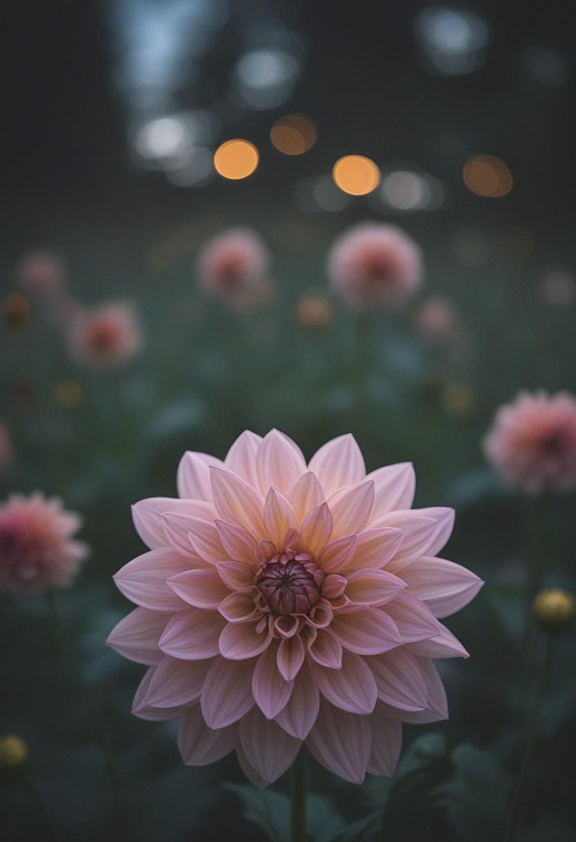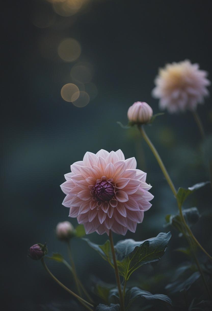 14. A wide-angle shot of a dahlia under starlight, evoking a nostalgic, dreamy atmosphere with soft lighting and a serene, romantic vibe.