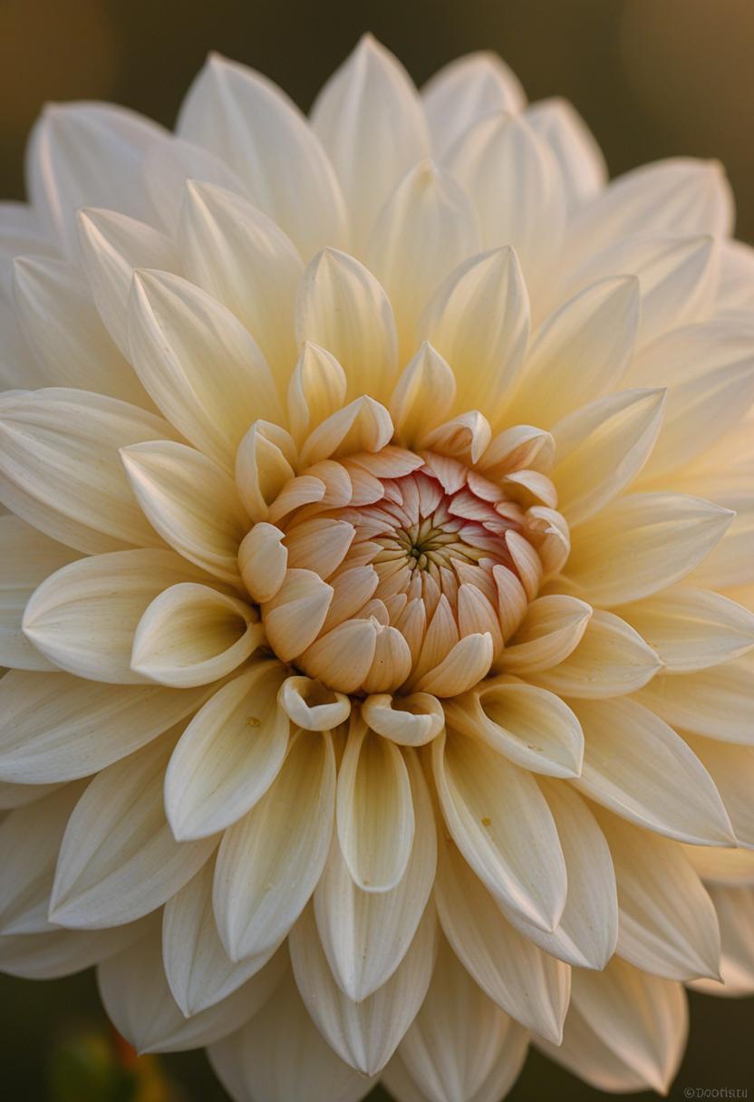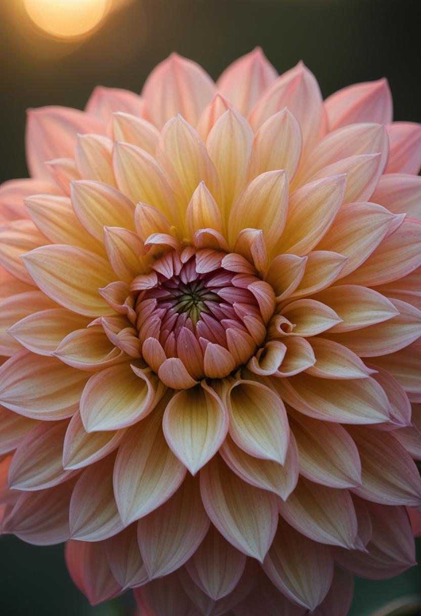 18. A surreal top-down view of a dahlia in golden hour light, glowing with soft hues, creating a dreamy, ethereal dahlia aesthetic.