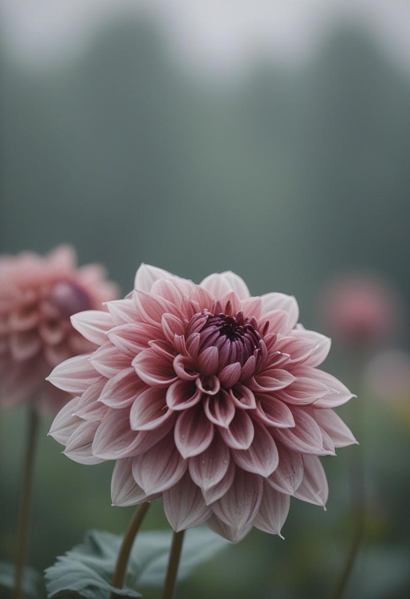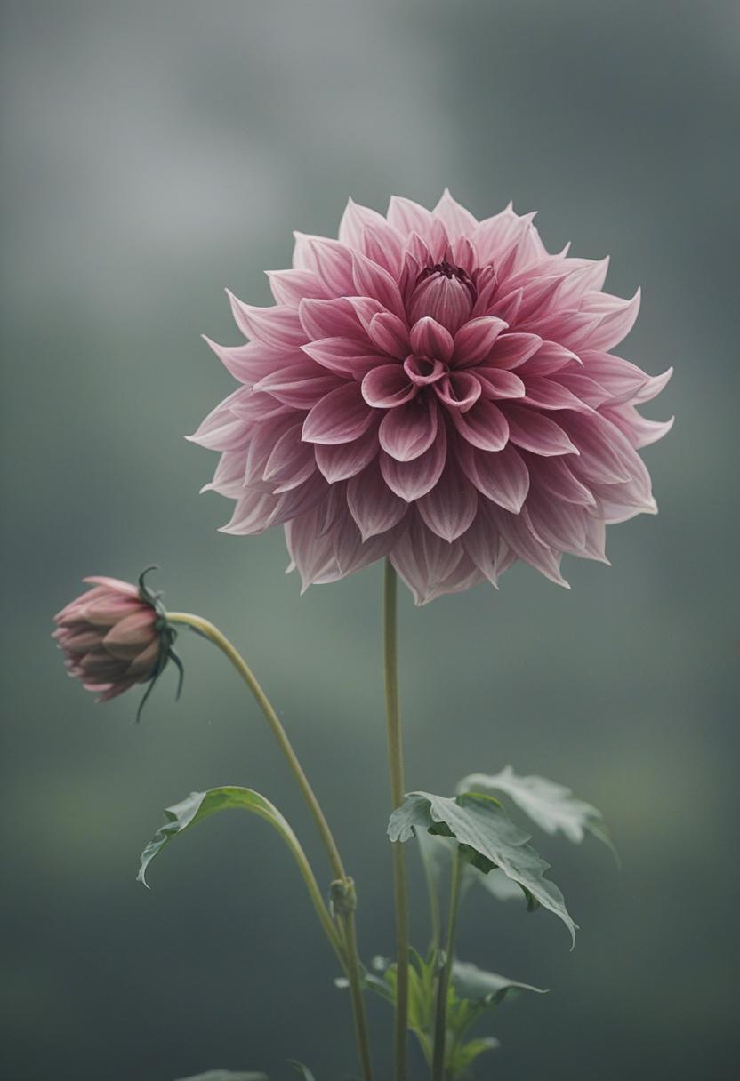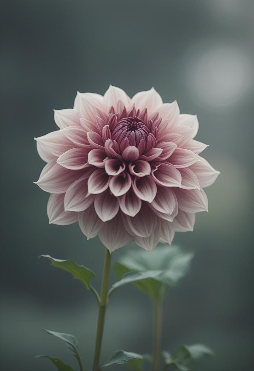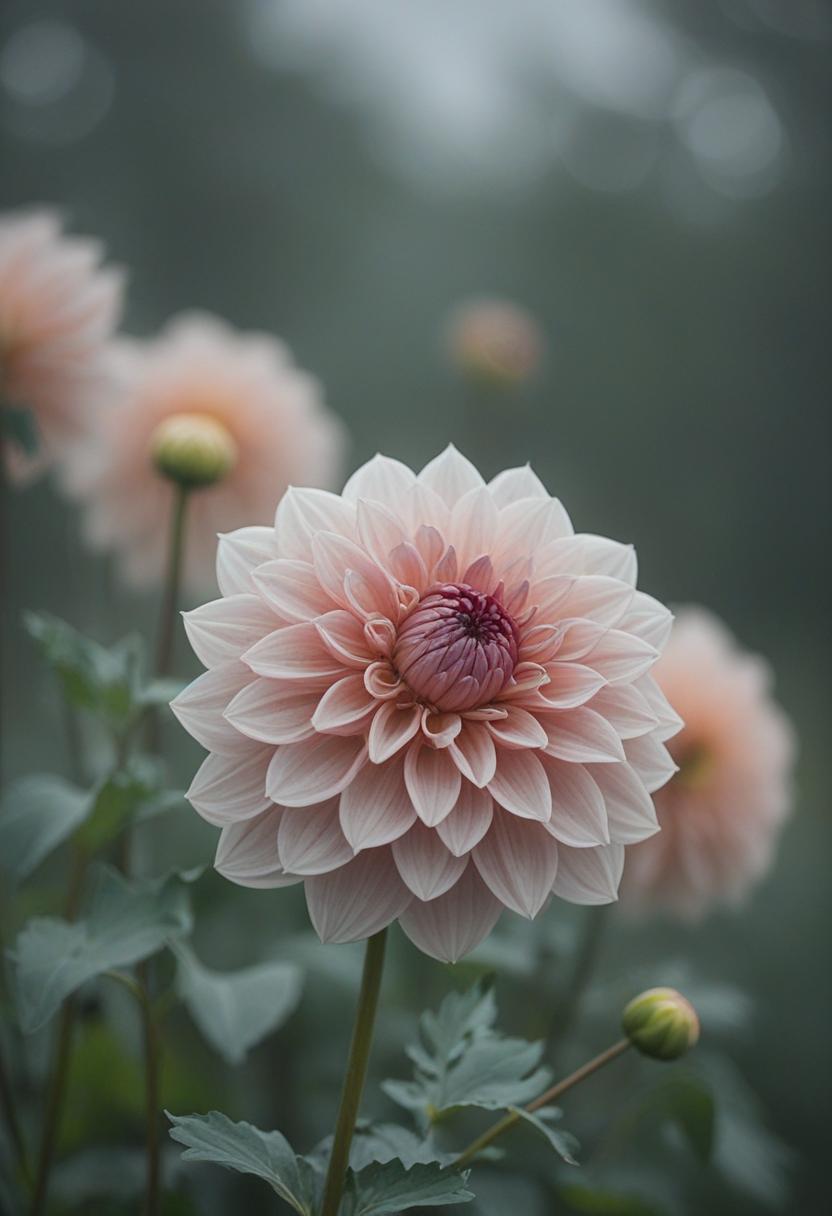 30. A serene dahlia in an ethereal, overcast studio shot, exuding a soft, dreamy dahlia aesthetic with gentle light and misty atmosphere.