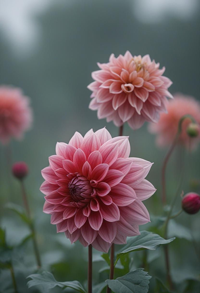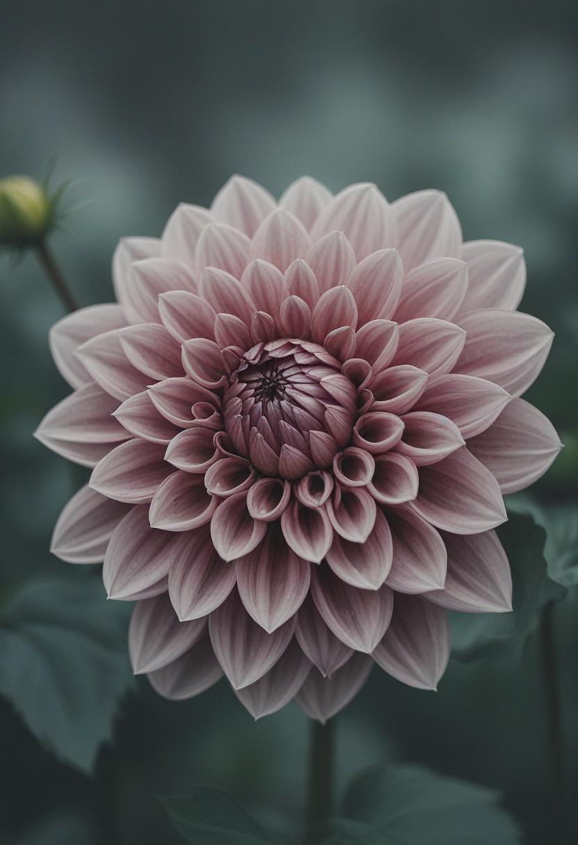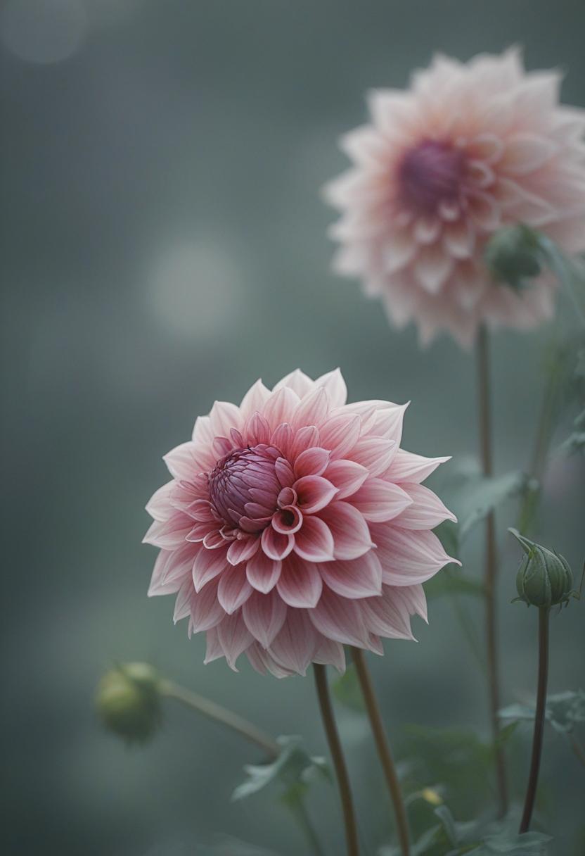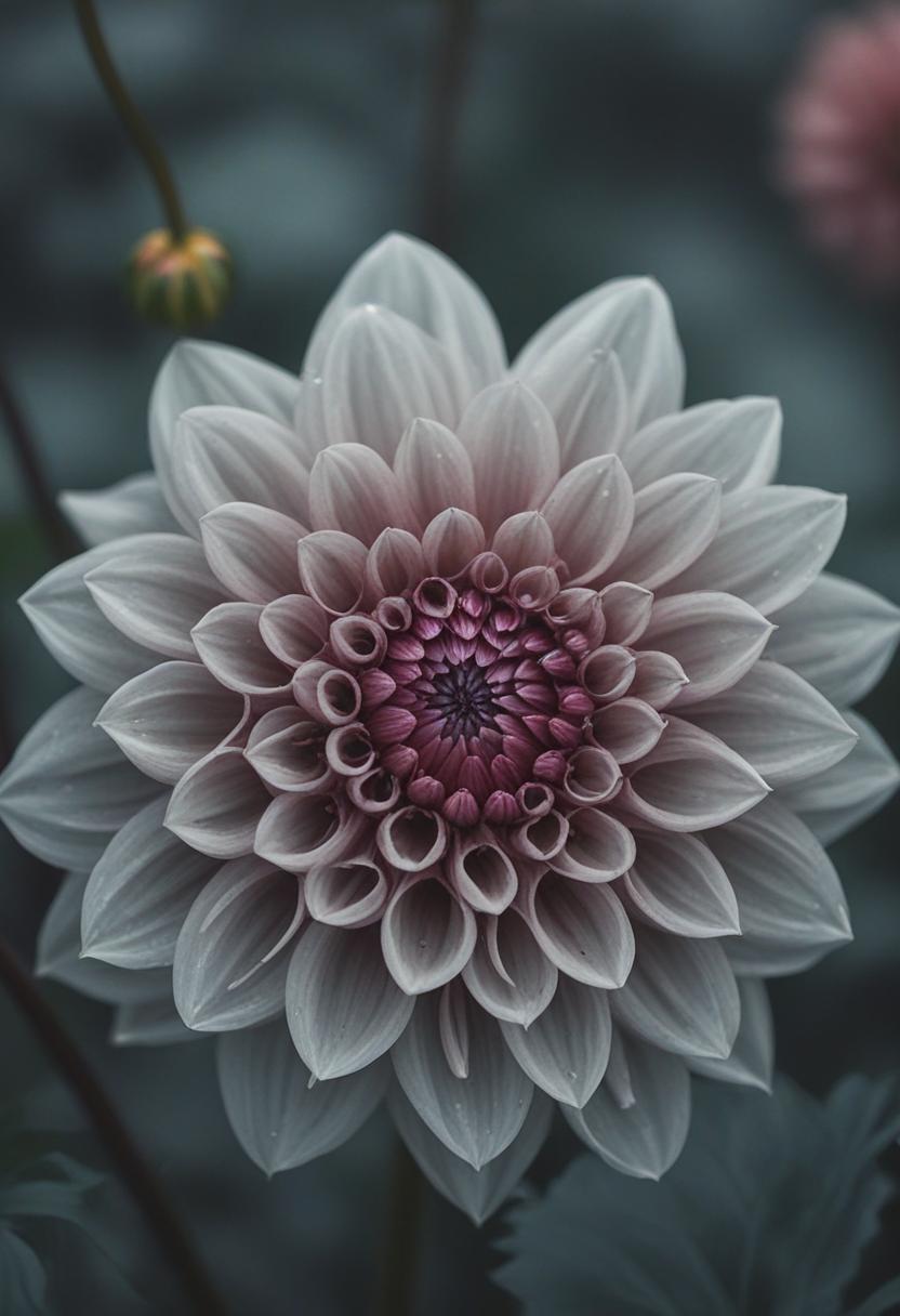30. A serene dahlia in an ethereal, overcast studio shot, exuding a soft, dreamy dahlia aesthetic with gentle light and misty atmosphere.