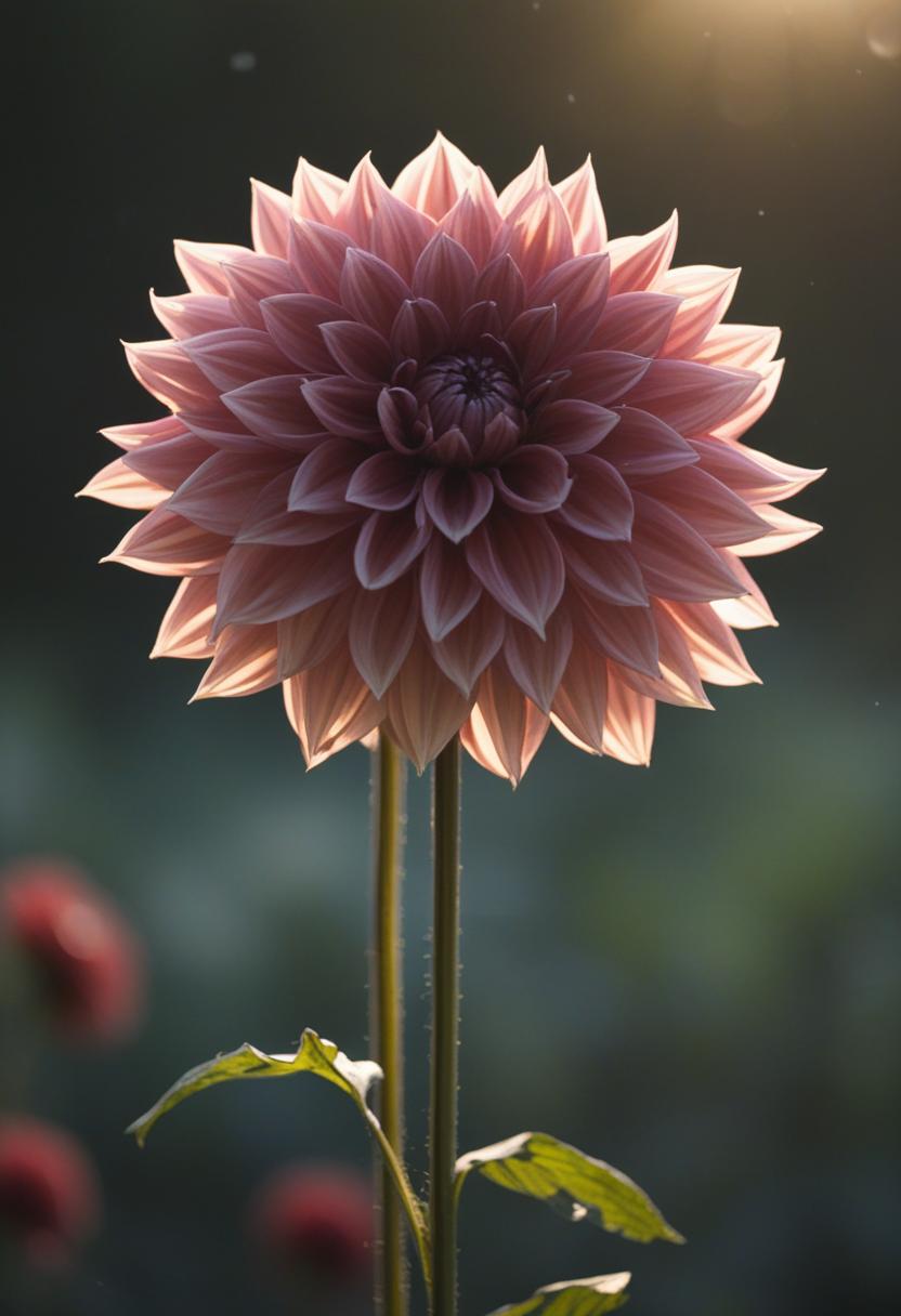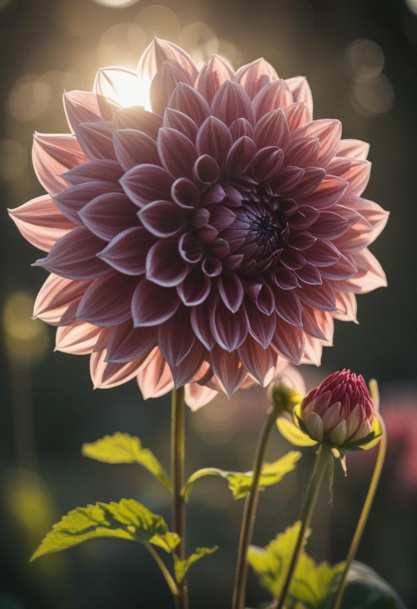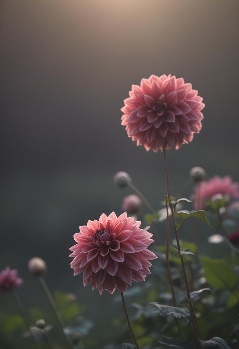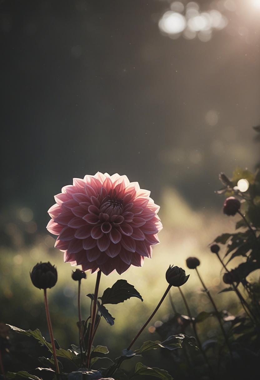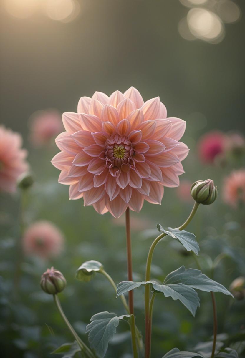 41. A soft morning light bathes a dahlia in a dreamy, serene side view, capturing its delicate beauty against a calm, epic backdrop.