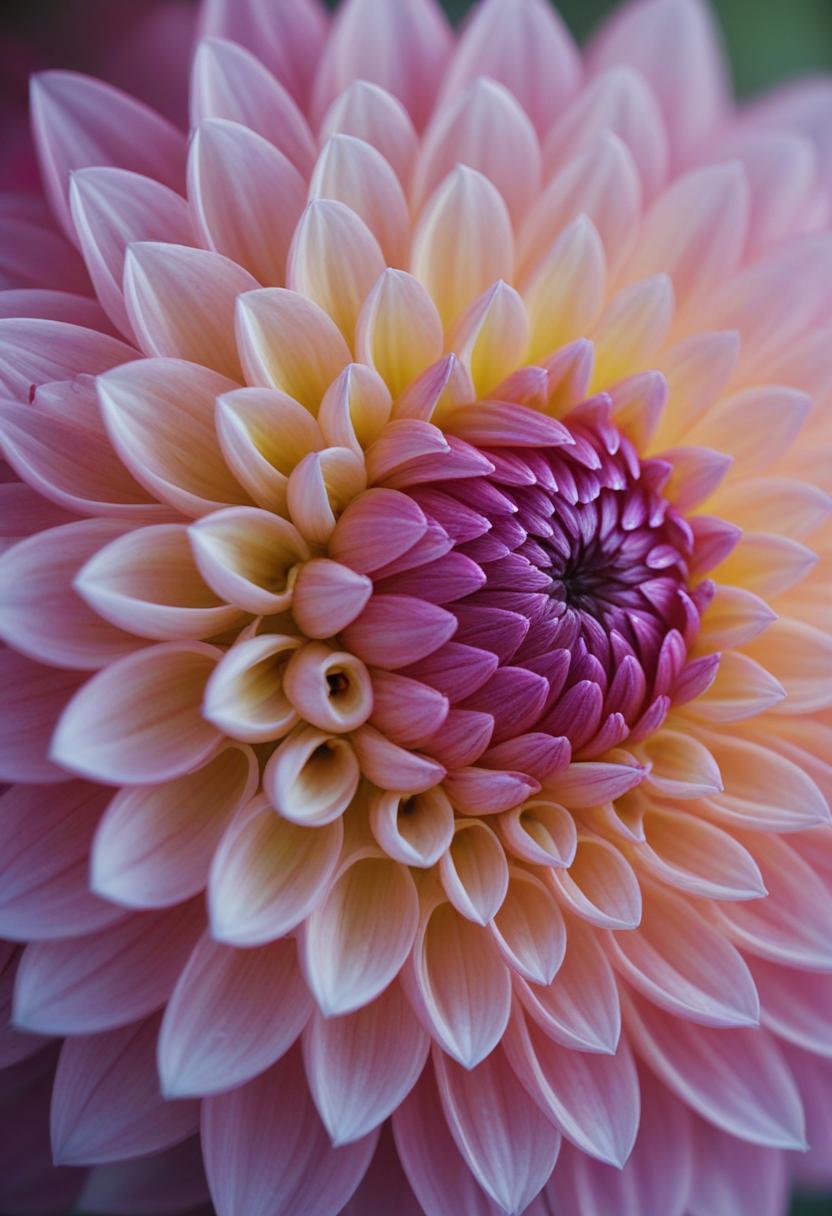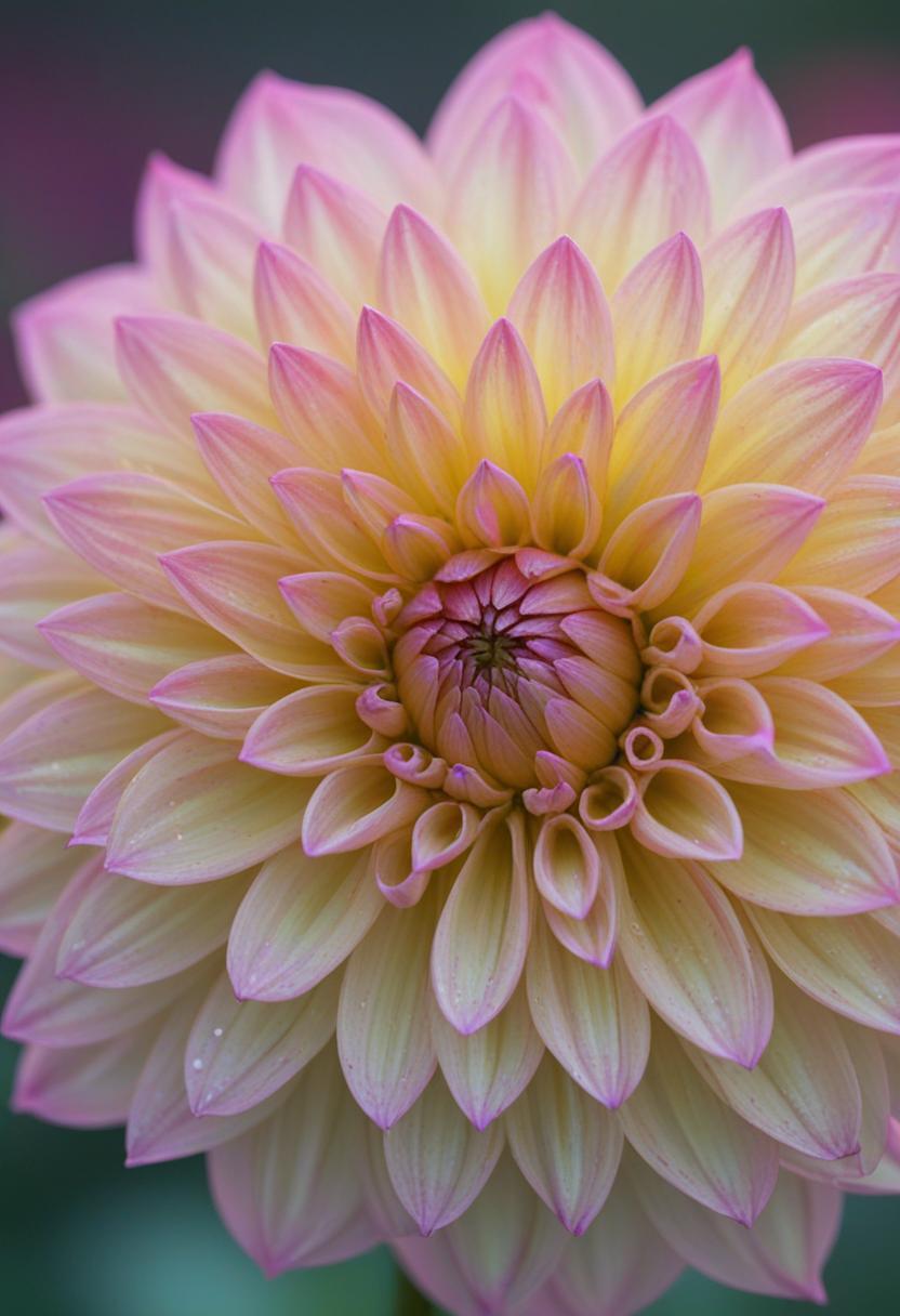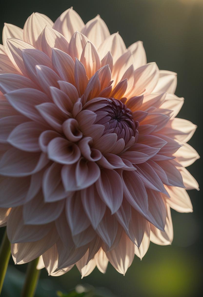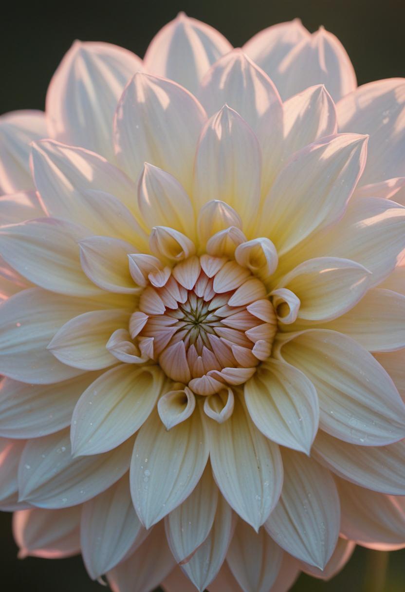 9. A soft morning light bathes a close-up dahlia in peaceful tranquility, capturing the dahlia aesthetic with gentle hues and serene beauty.