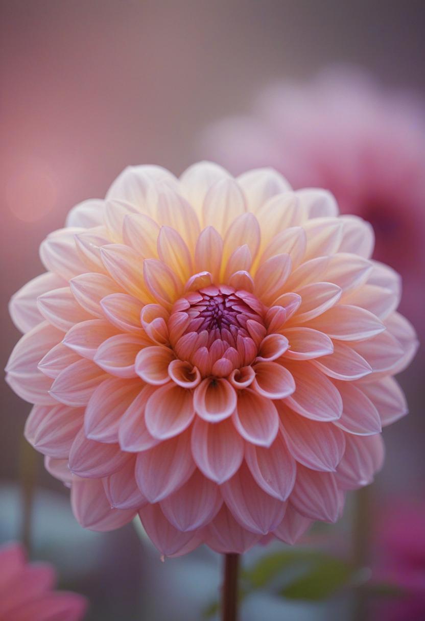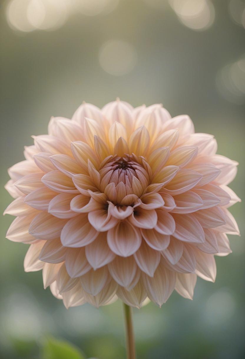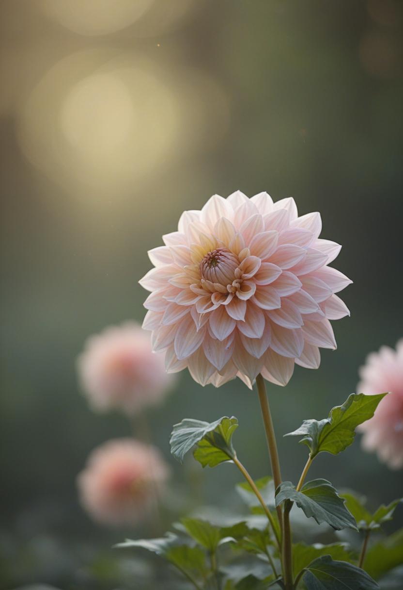 4. A soft, pastel dahlia blooms against a blurred, dreamy background, evoking a whimsical, ethereal aesthetic with delicate petals and gentle lighting.