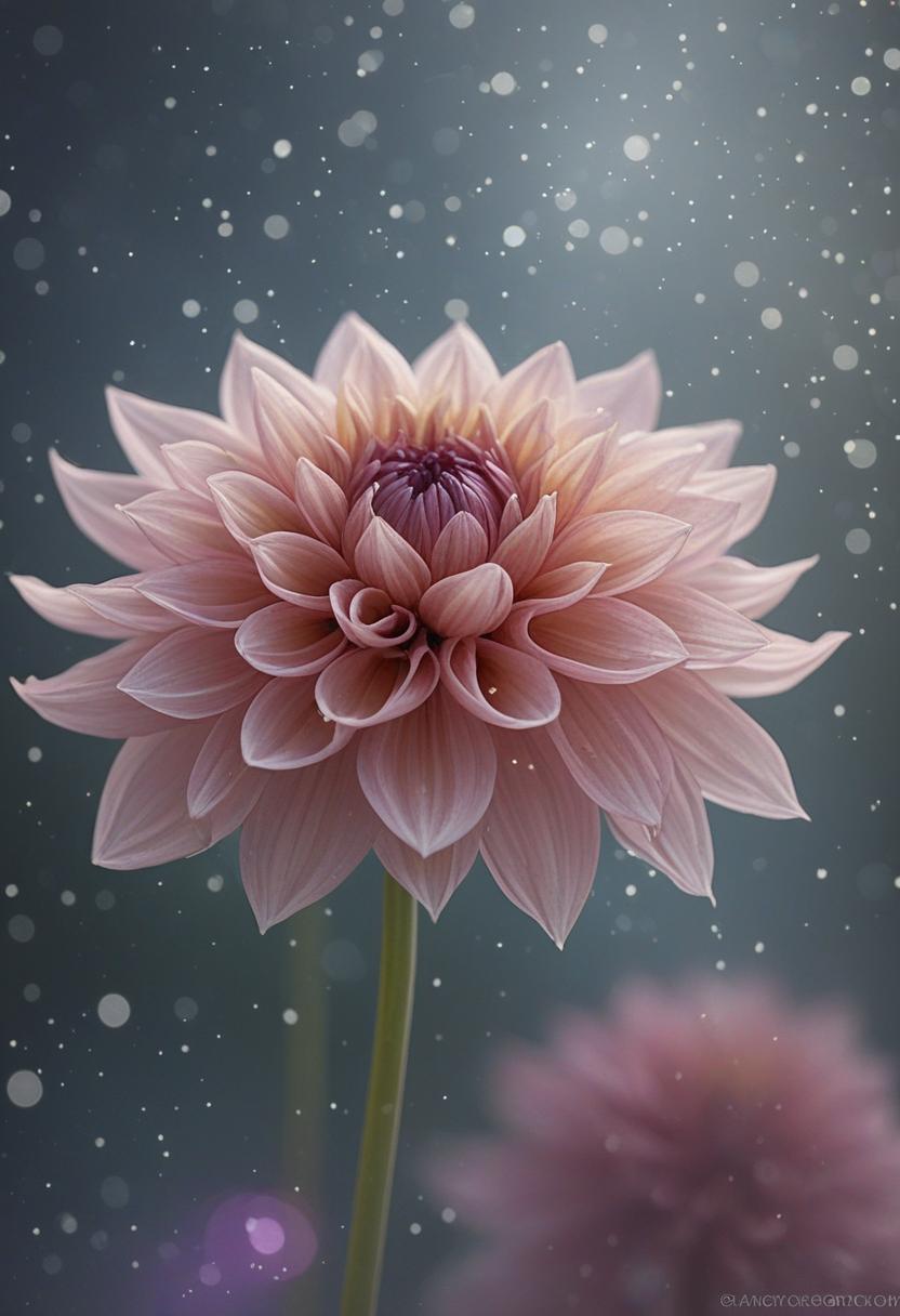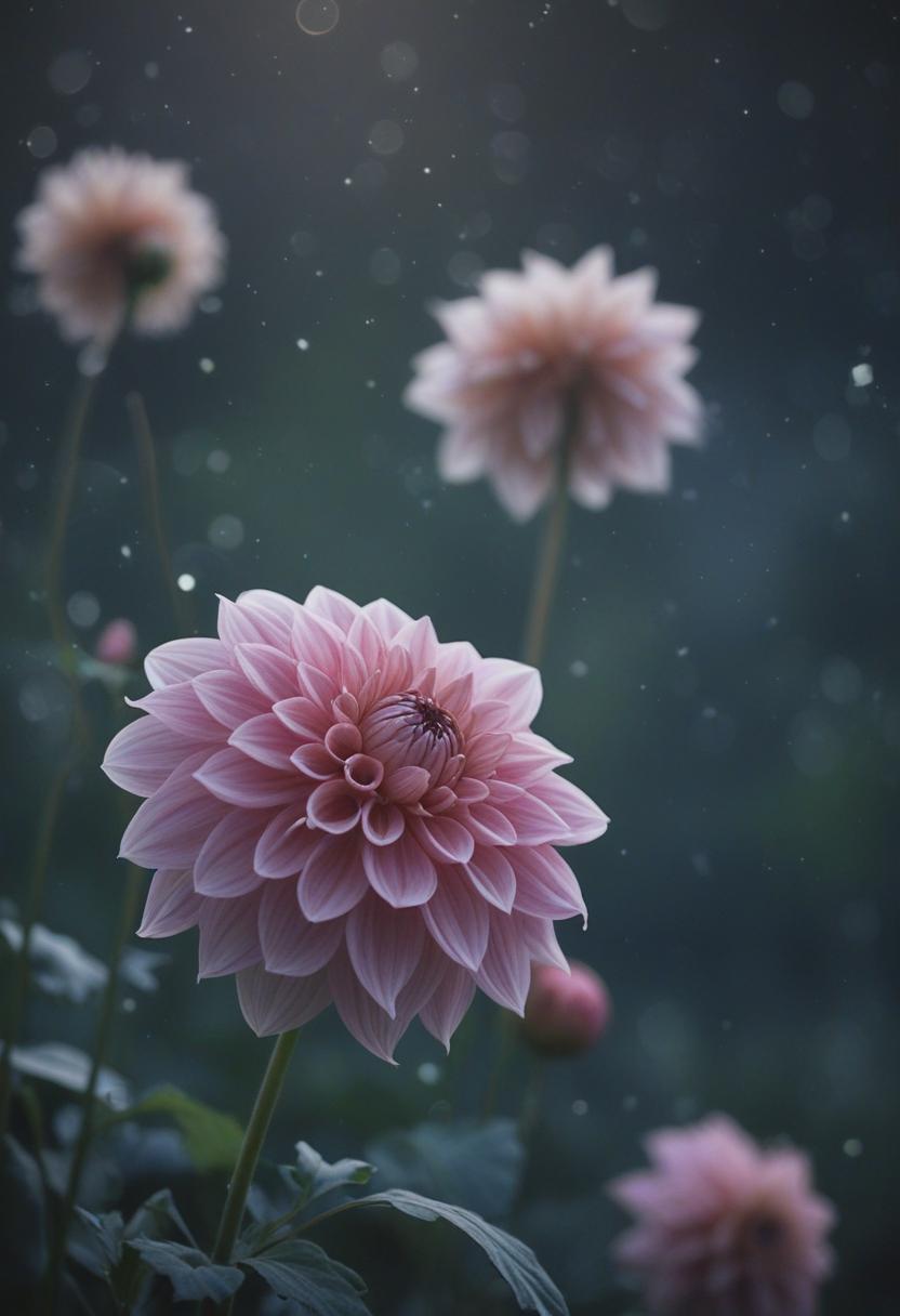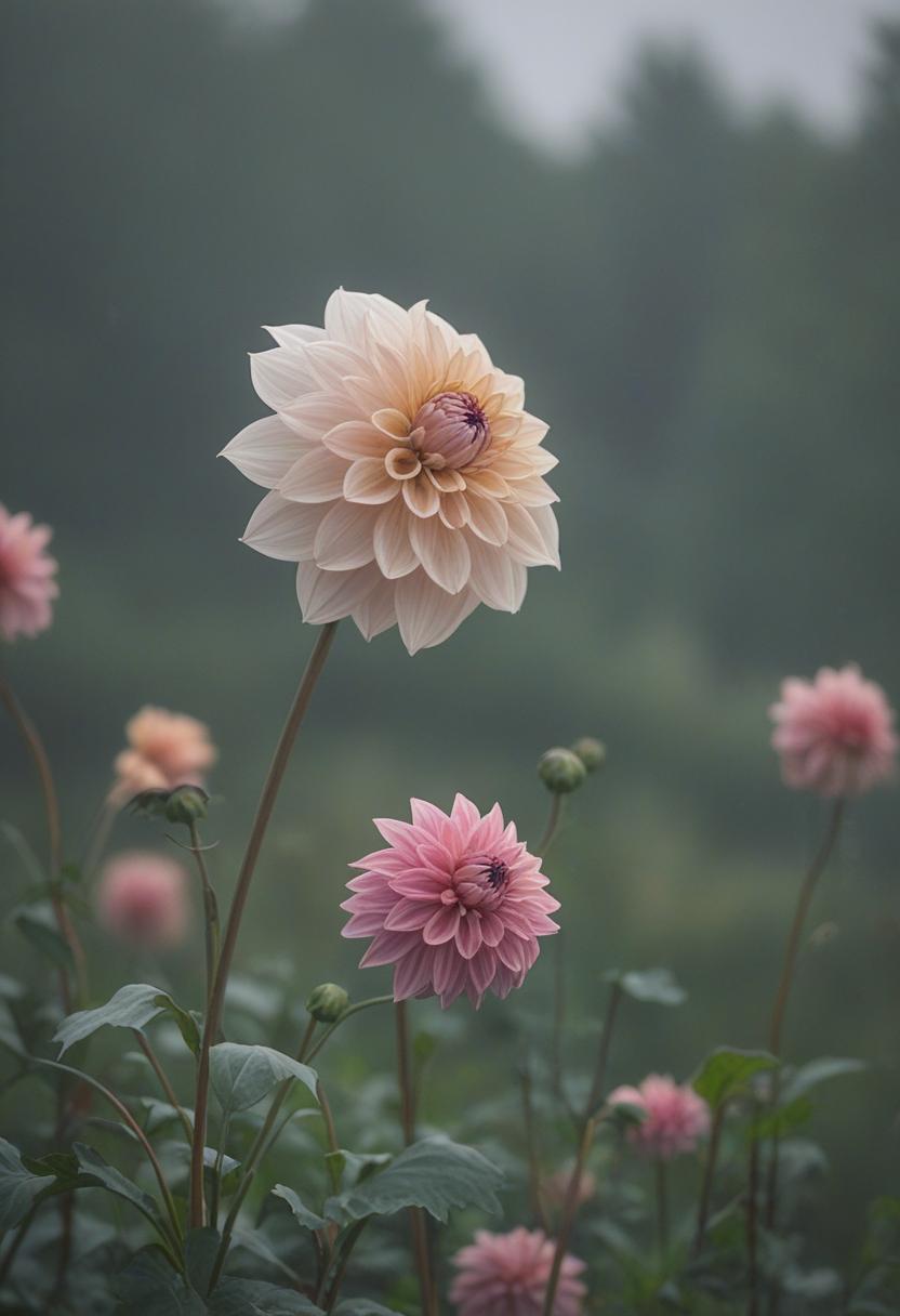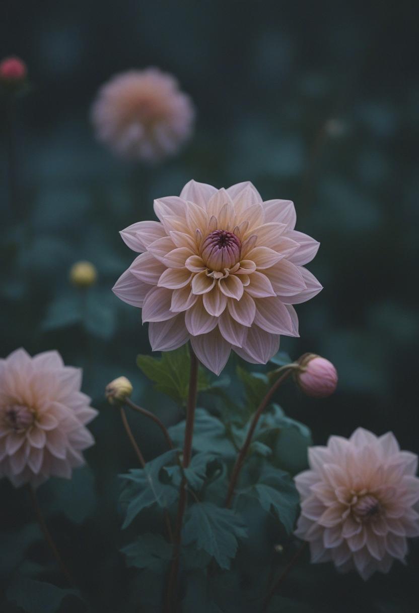 4. A soft, pastel dahlia blooms against a blurred, dreamy background, evoking a whimsical, ethereal aesthetic with delicate petals and gentle lighting.