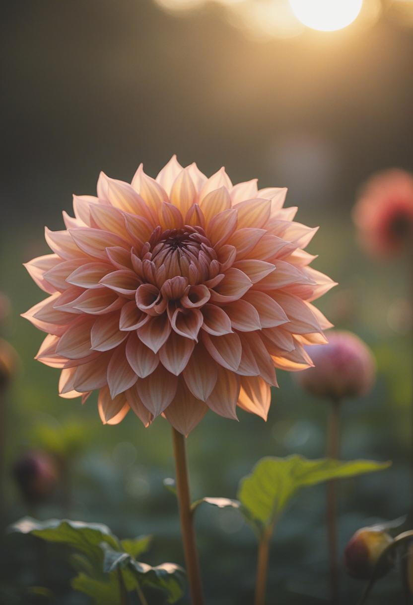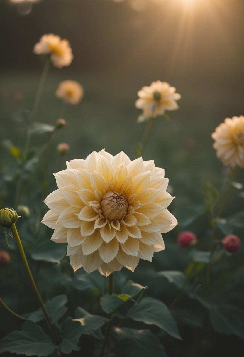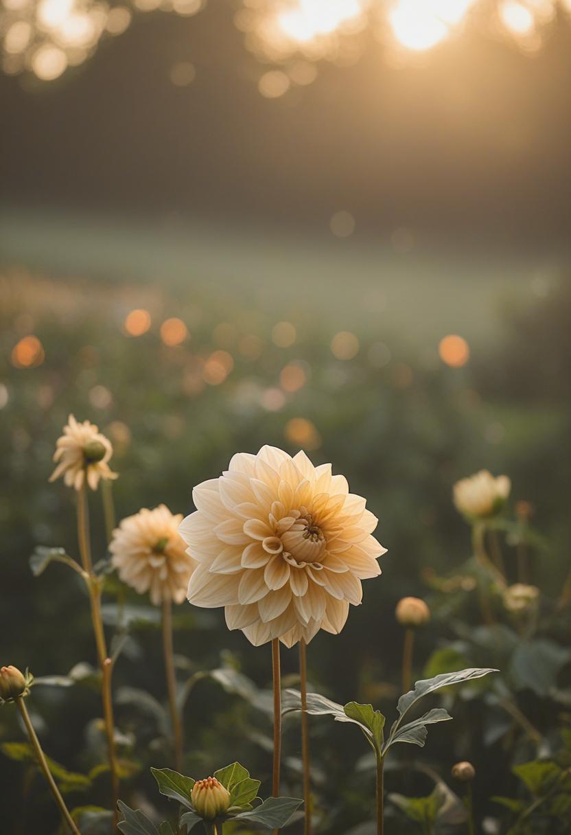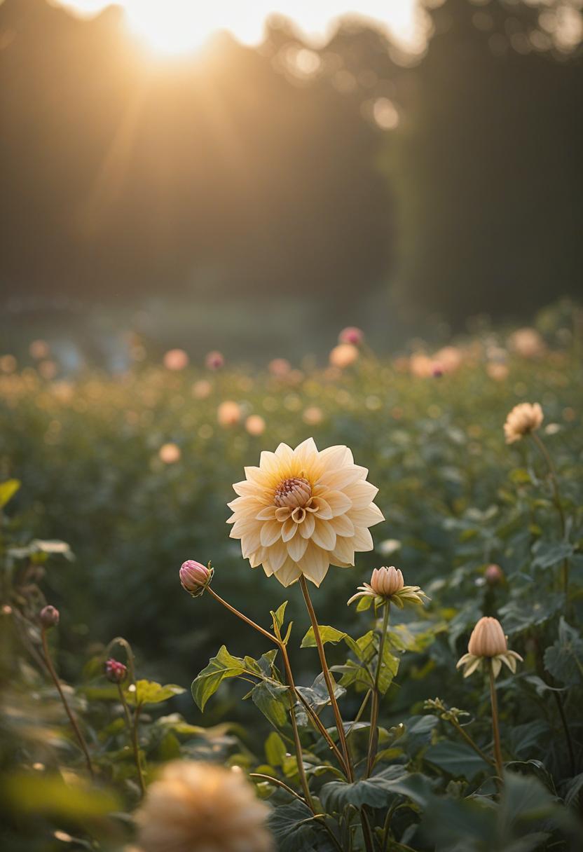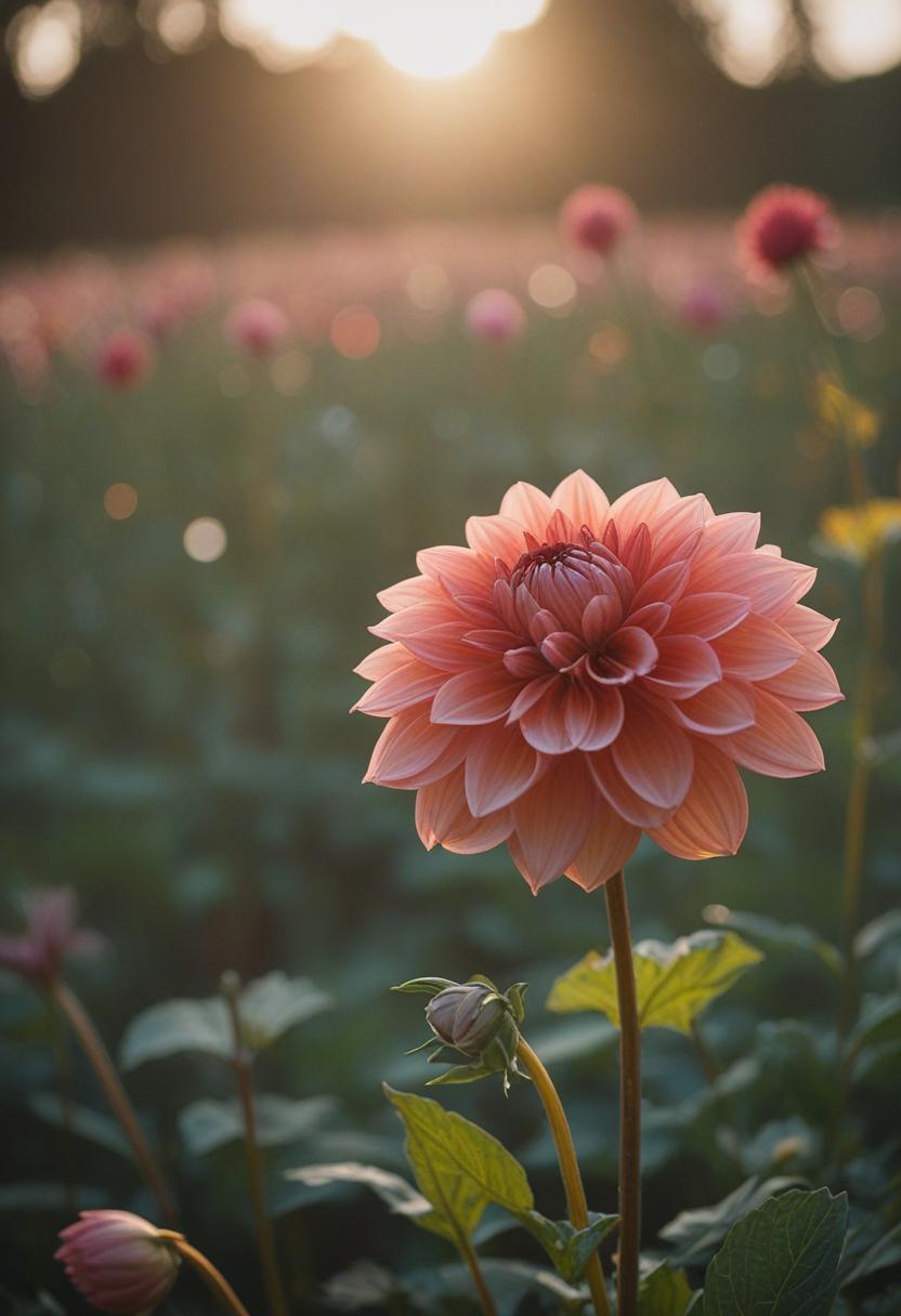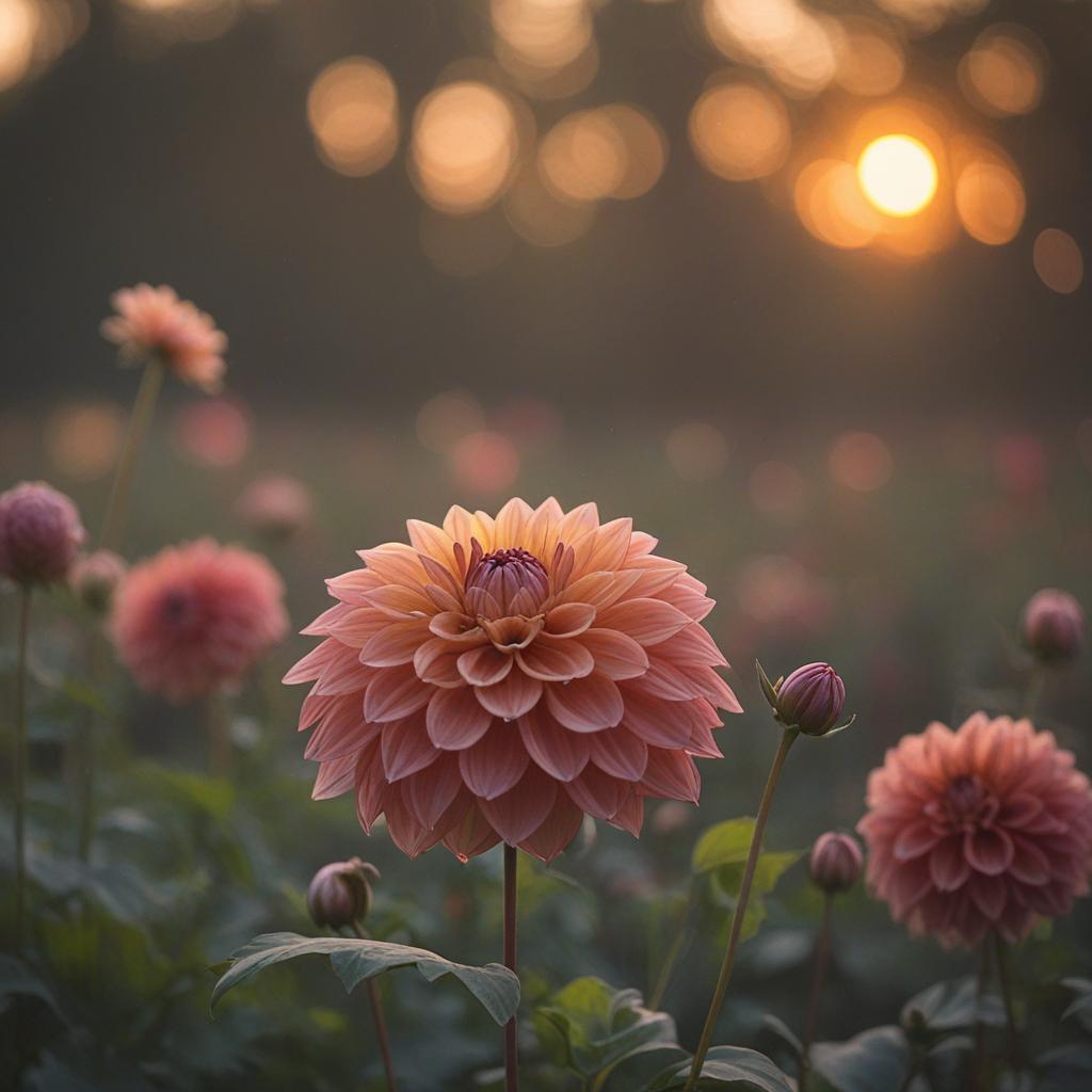 5. A golden hour dahlia blooms amidst a serene, ethereal landscape, bathed in warm light, evoking a dreamy, tranquil aesthetic.