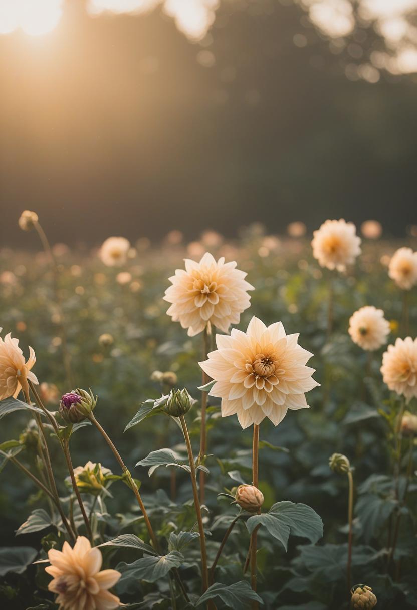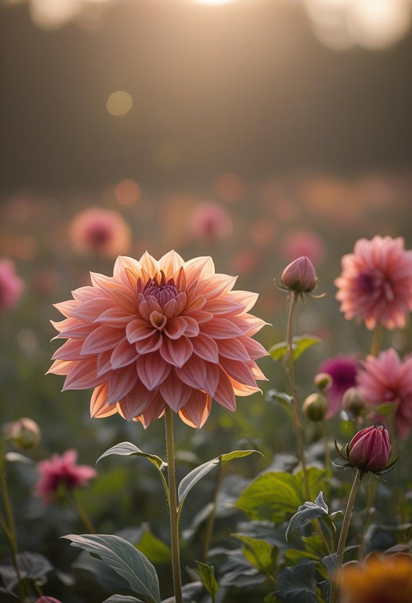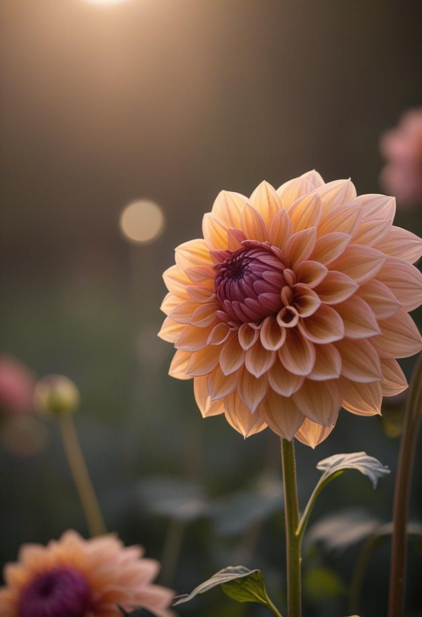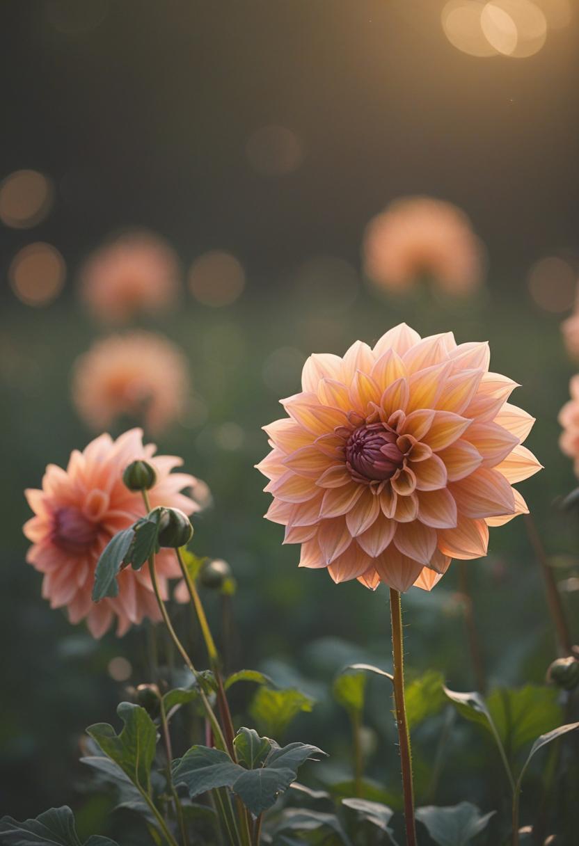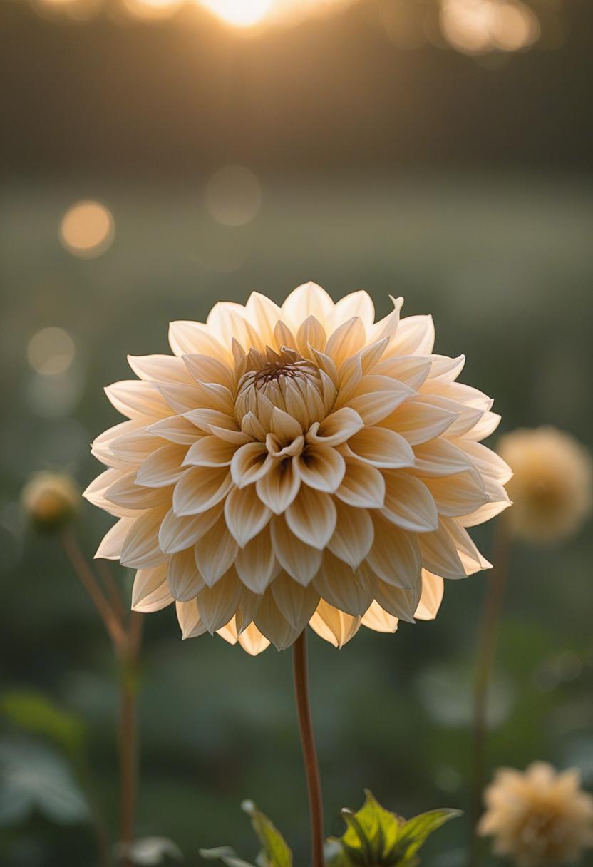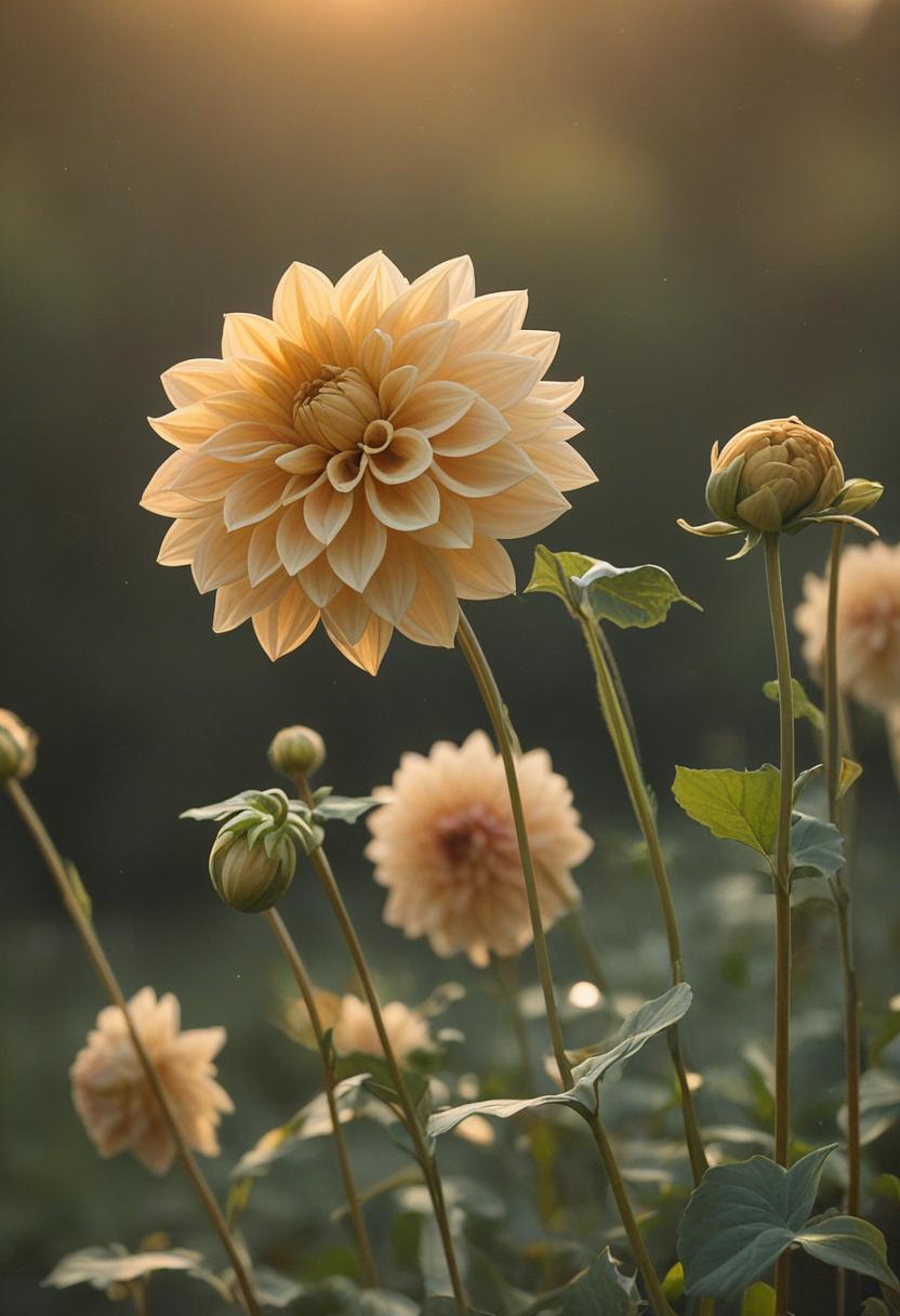 5. A golden hour dahlia blooms amidst a serene, ethereal landscape, bathed in warm light, evoking a dreamy, tranquil aesthetic.