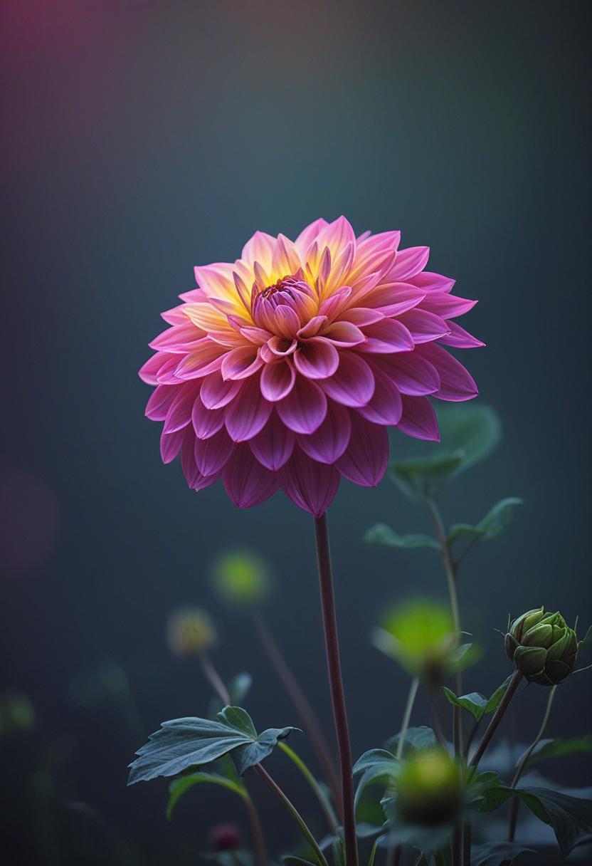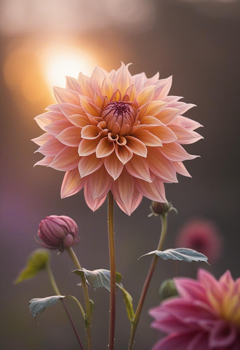 15. A fantasy studio shot of a dahlia in a sunset glow, exuding a dreamy, artistic vibe with soft lighting and vibrant colors.