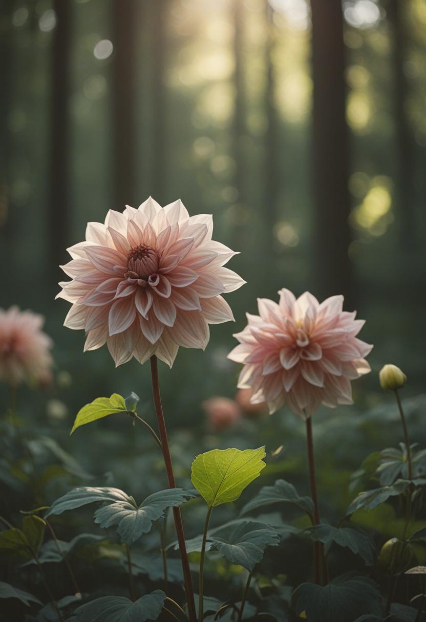 85. A dahlia blooms under dappled forest light in an ethereal studio shot, capturing soft shadows and delicate petals in a serene, dreamlike atmosphere.