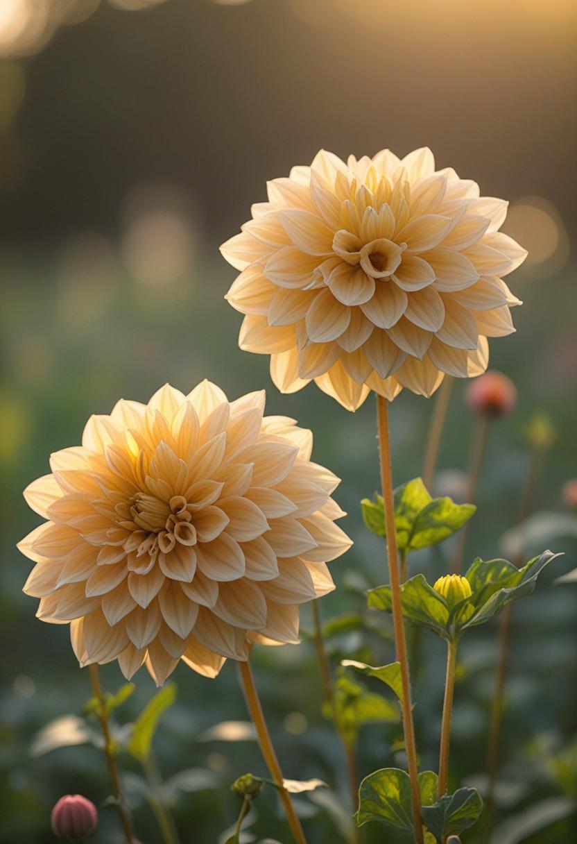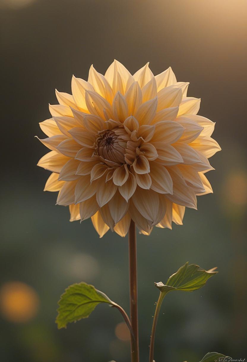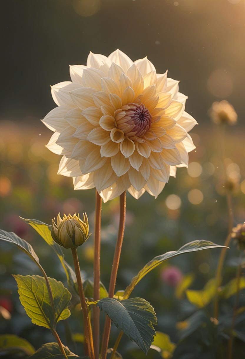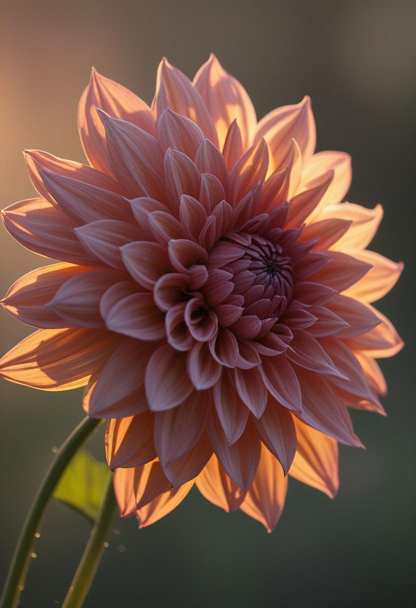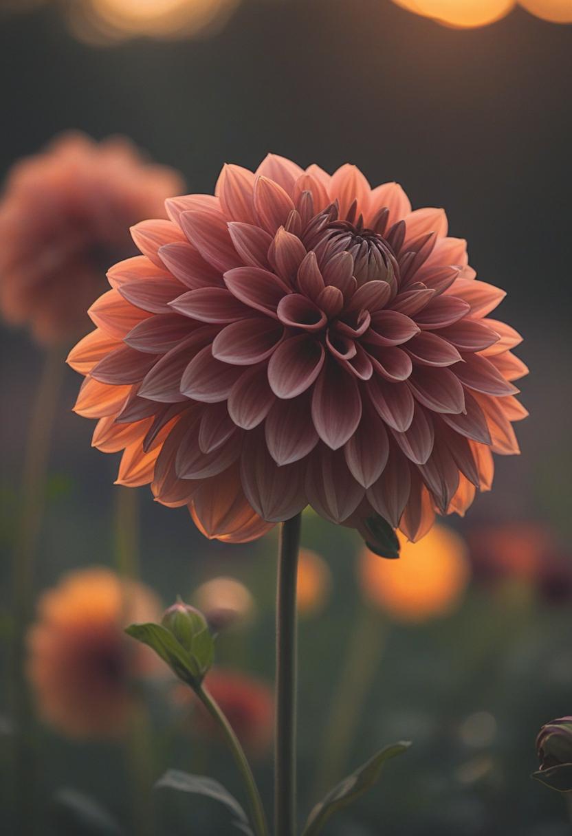 33. A dahlia blooms in golden hour light, capturing the dahlia aesthetic with a dramatic side view, evoking elegance and warmth in a striking, epic moment.