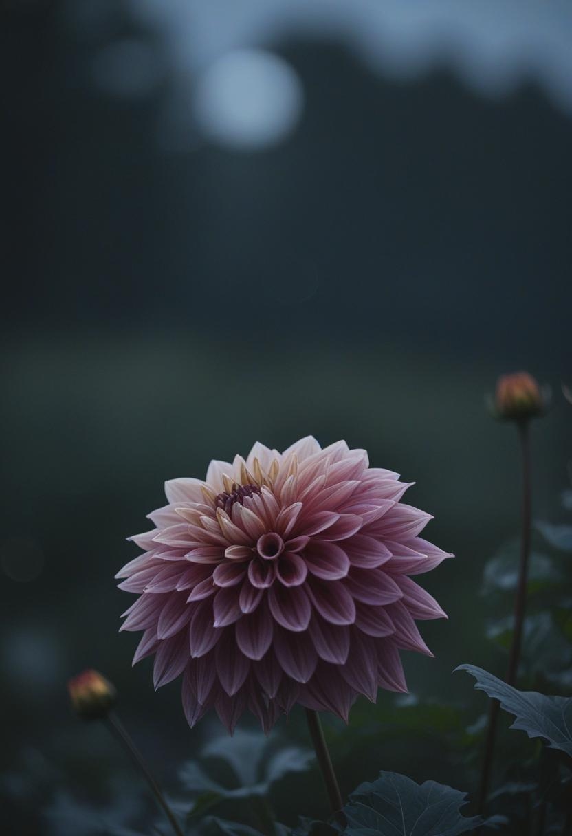 65. A moody midshot of a dahlia under moonlight, capturing the serene beauty of the flower in a soft, ethereal glow.