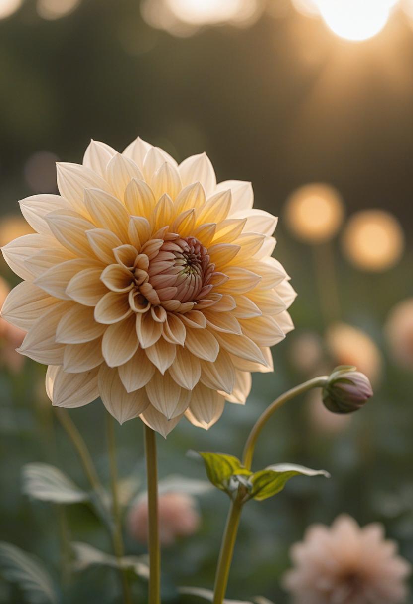 51. A golden-hour midshot of a dahlia in full bloom, capturing the soft light and romantic essence of the moment.