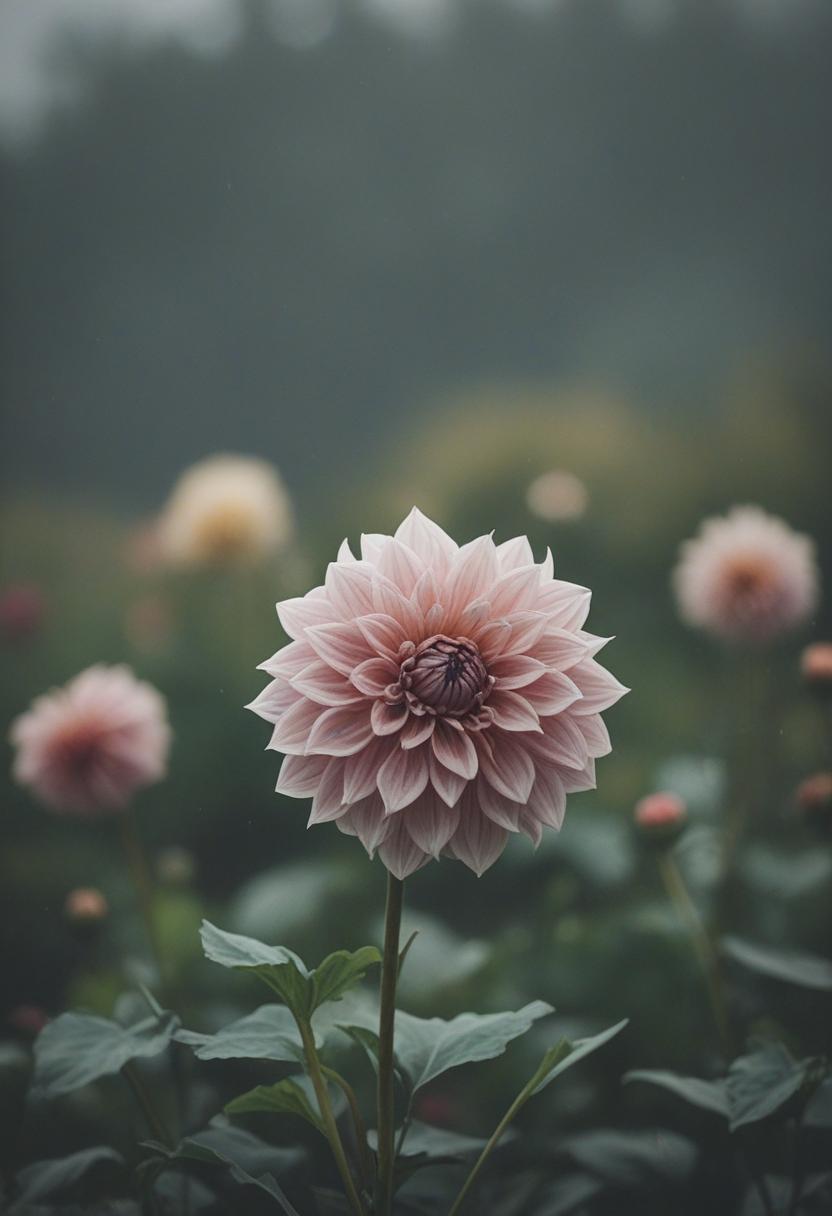 43. A serene dahlia aesthetic scene under a cloudy, overcast sky with a soft glow, capturing a peaceful and scenic natural view.