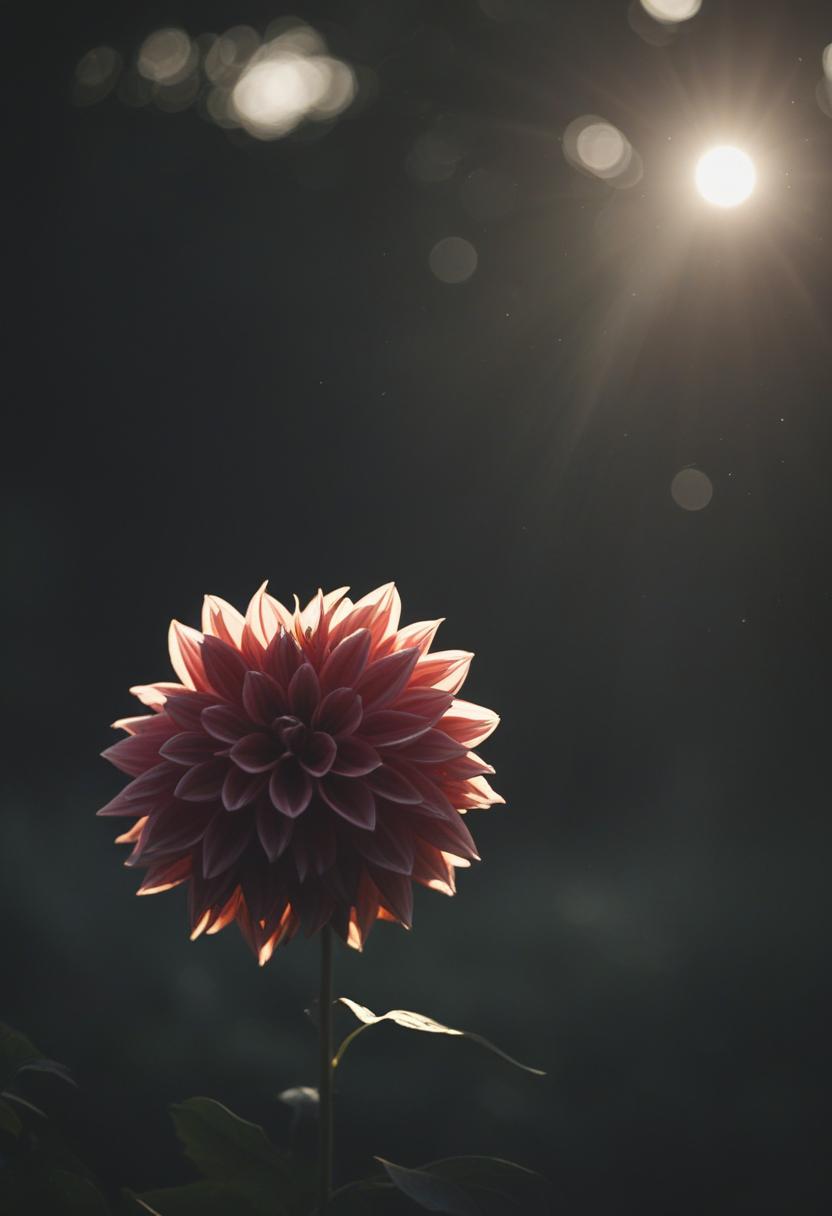 23. A dramatic dahlia flower, captured in a side view with intense backlighting, creating a striking, ethereal glow that enhances its intricate petals and adds a moody, artistic vibe.