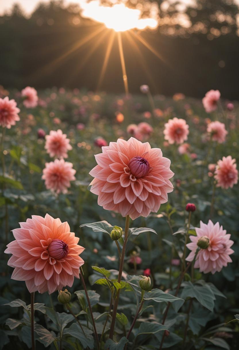 68. A golden hour dahlia garden bathed in soft light, creating an ethereal, dreamy scenic view with vibrant blooms and serene atmosphere.