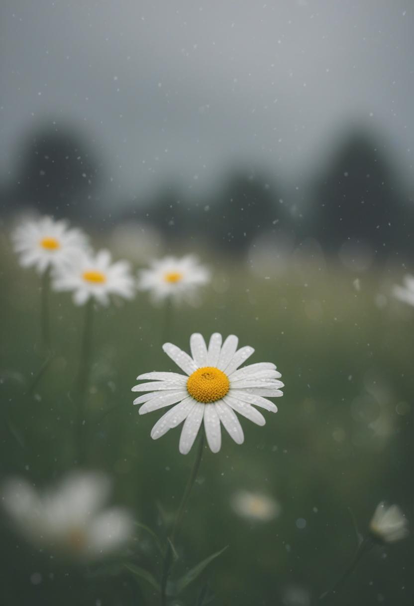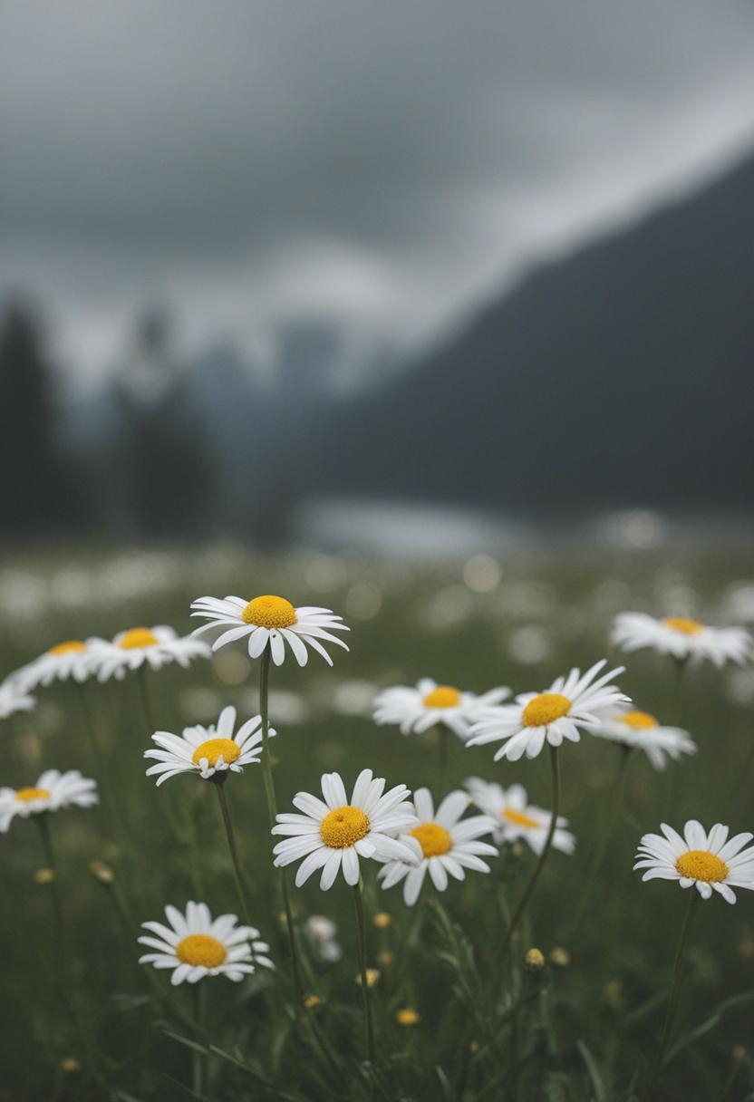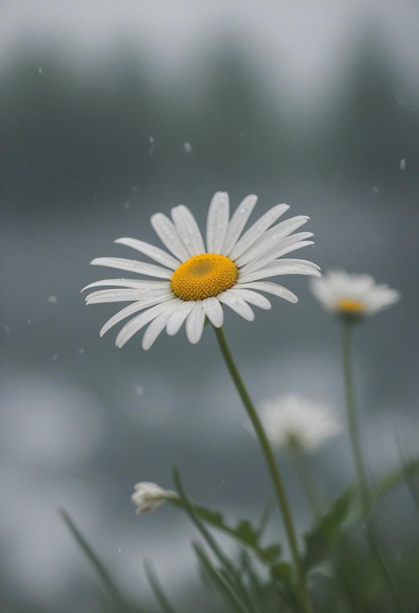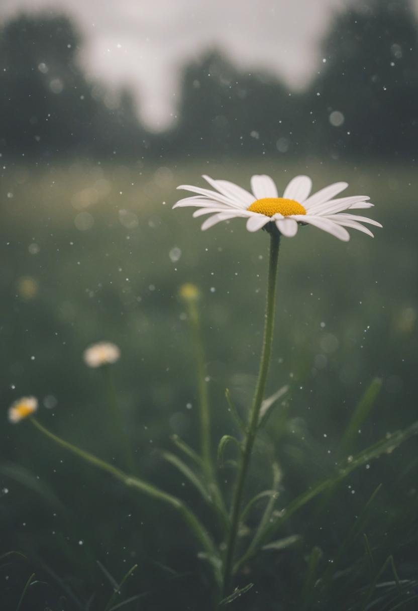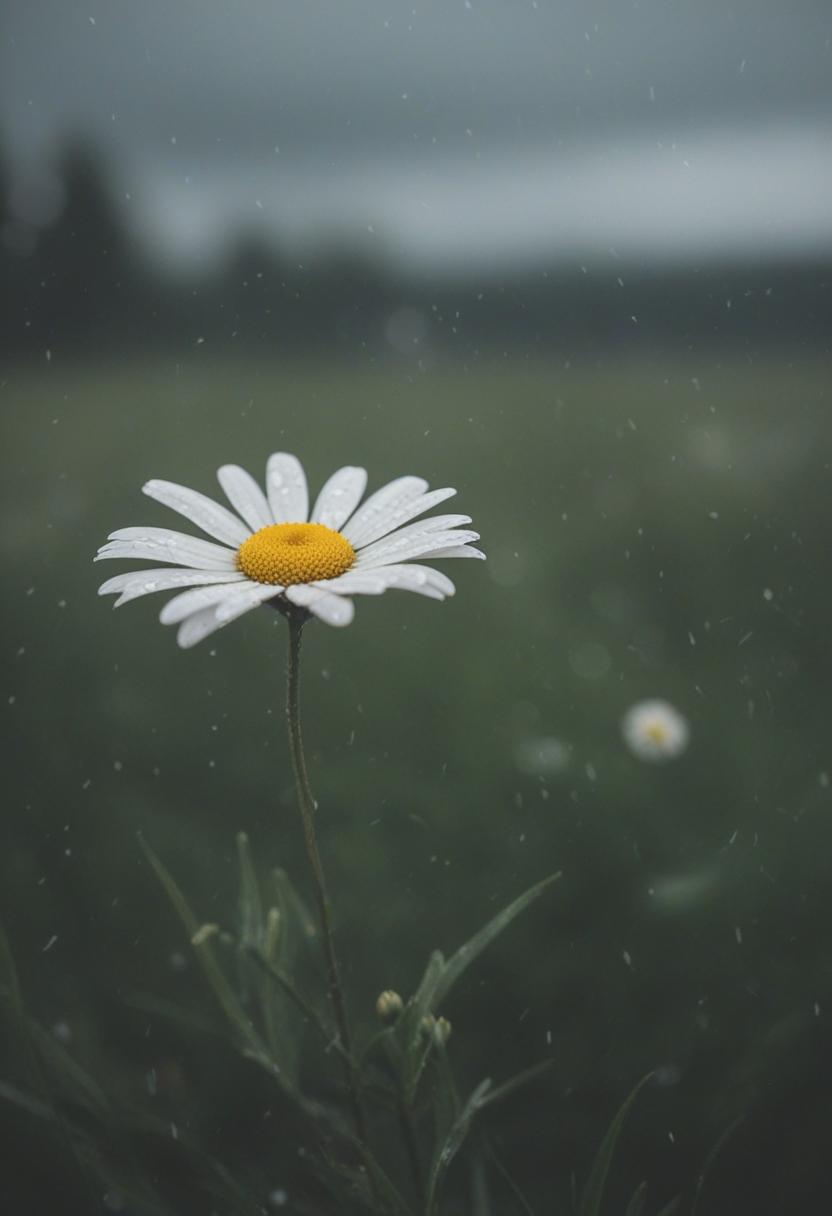 18. A close-up daisy blooms under cloudy, overcast skies, exuding calm and serenity in a soft, daisy aesthetic.