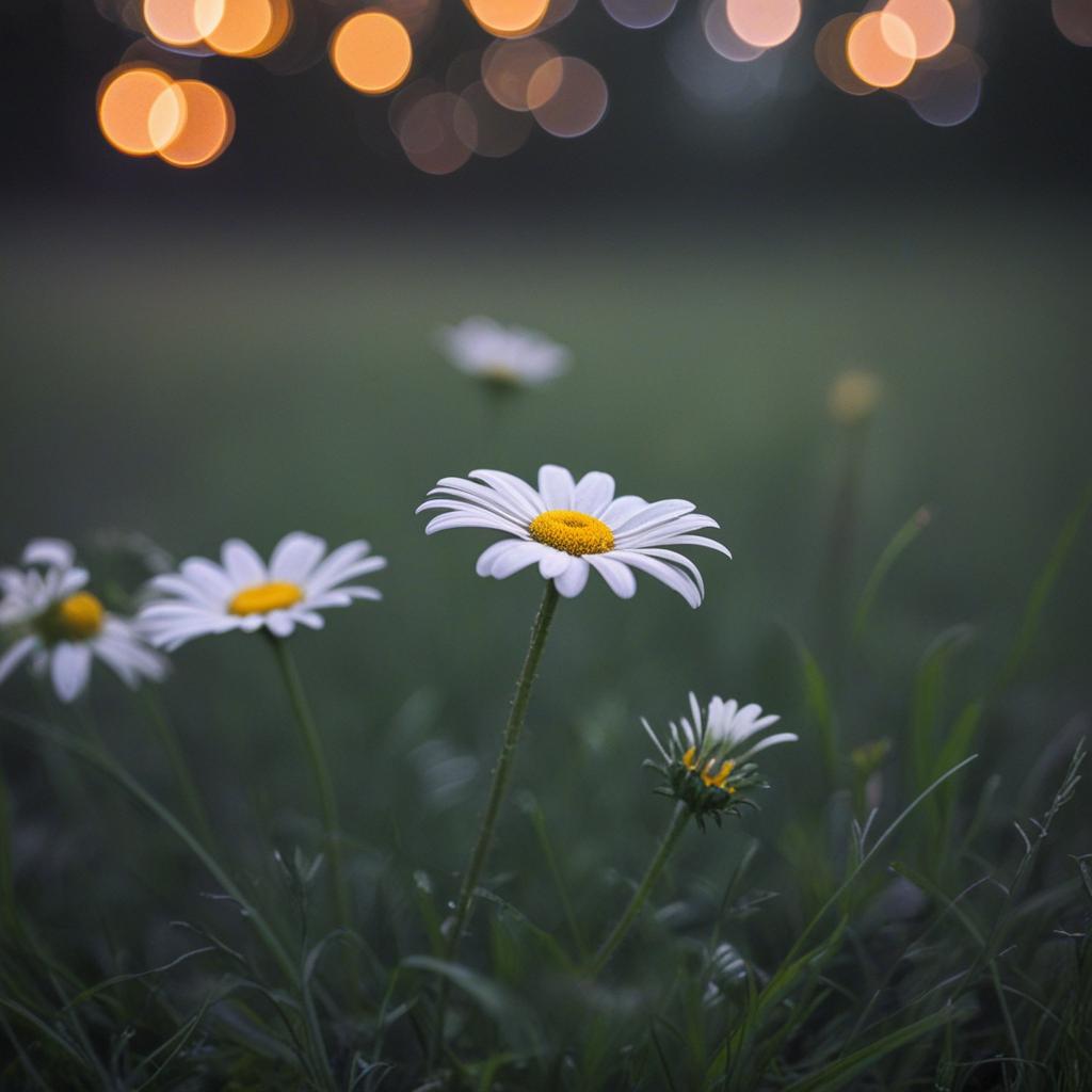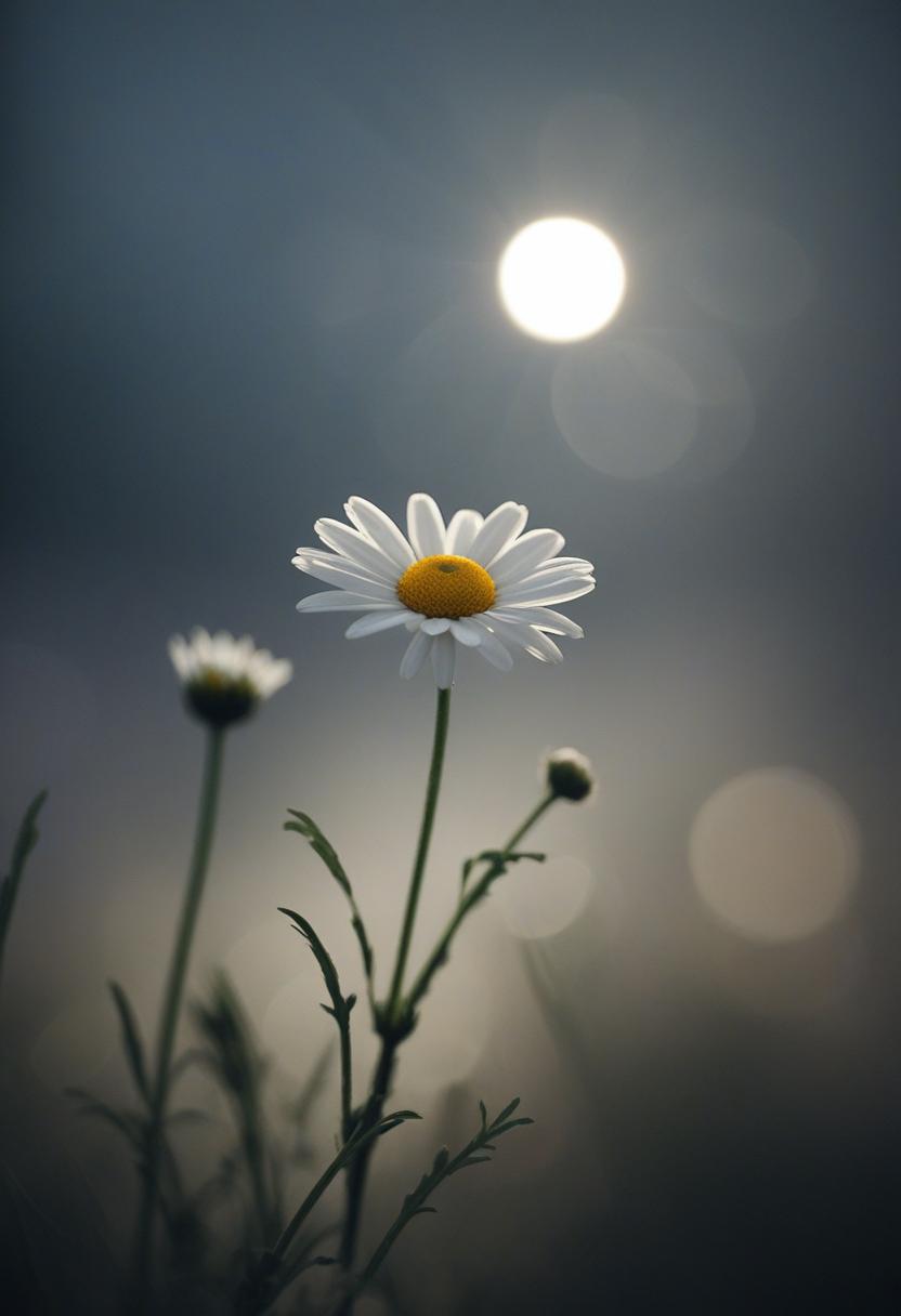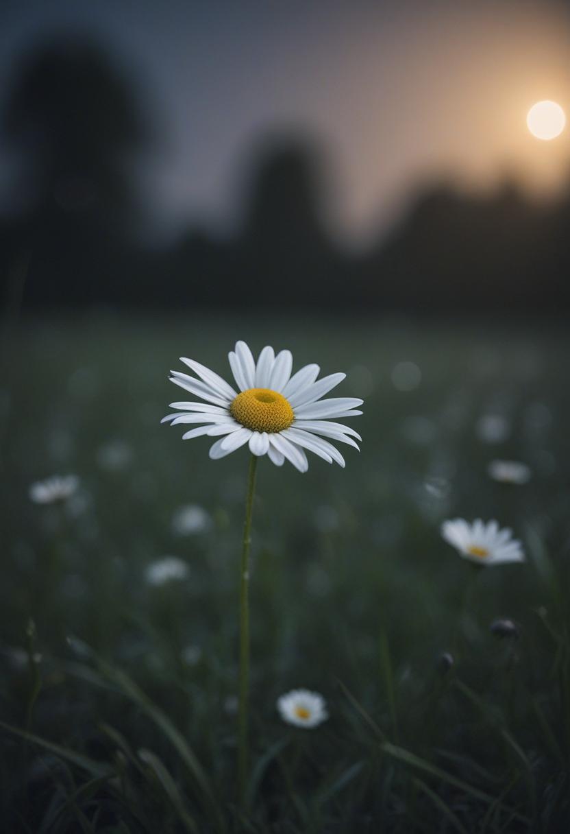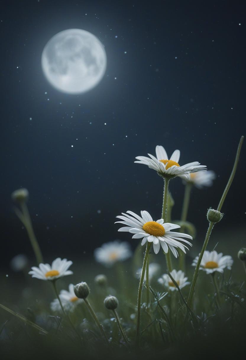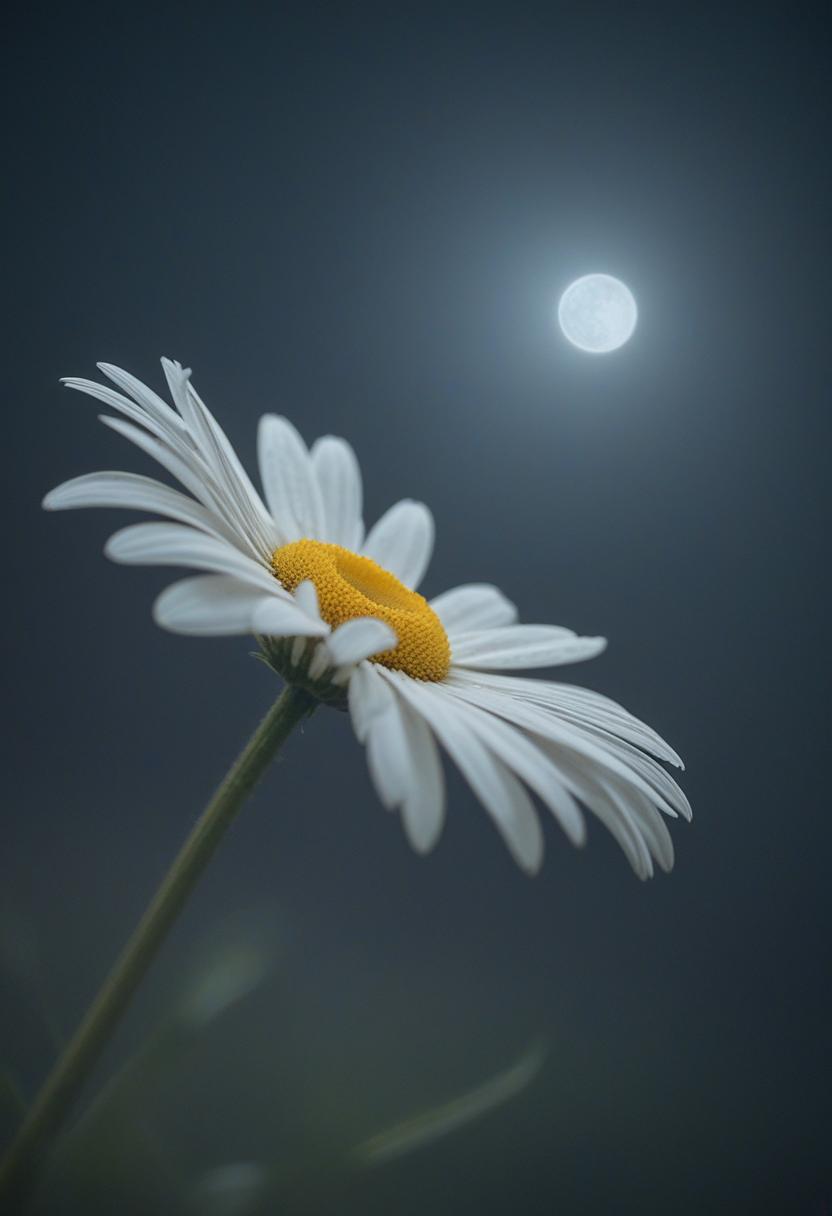 3. A close-up of a daisy under moonlight, capturing a romantic, dreamy atmosphere with soft lighting and a serene, elegant vibe.