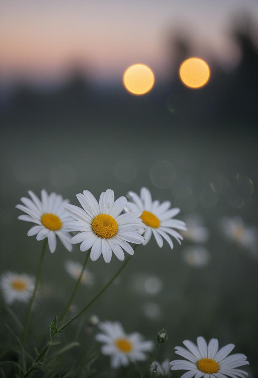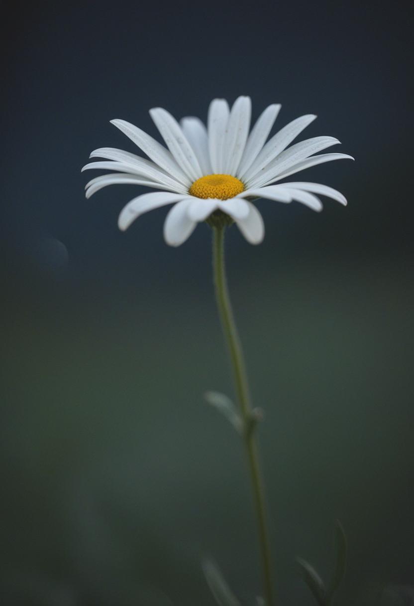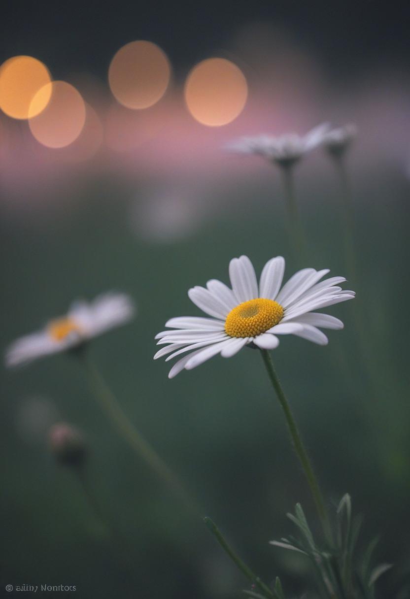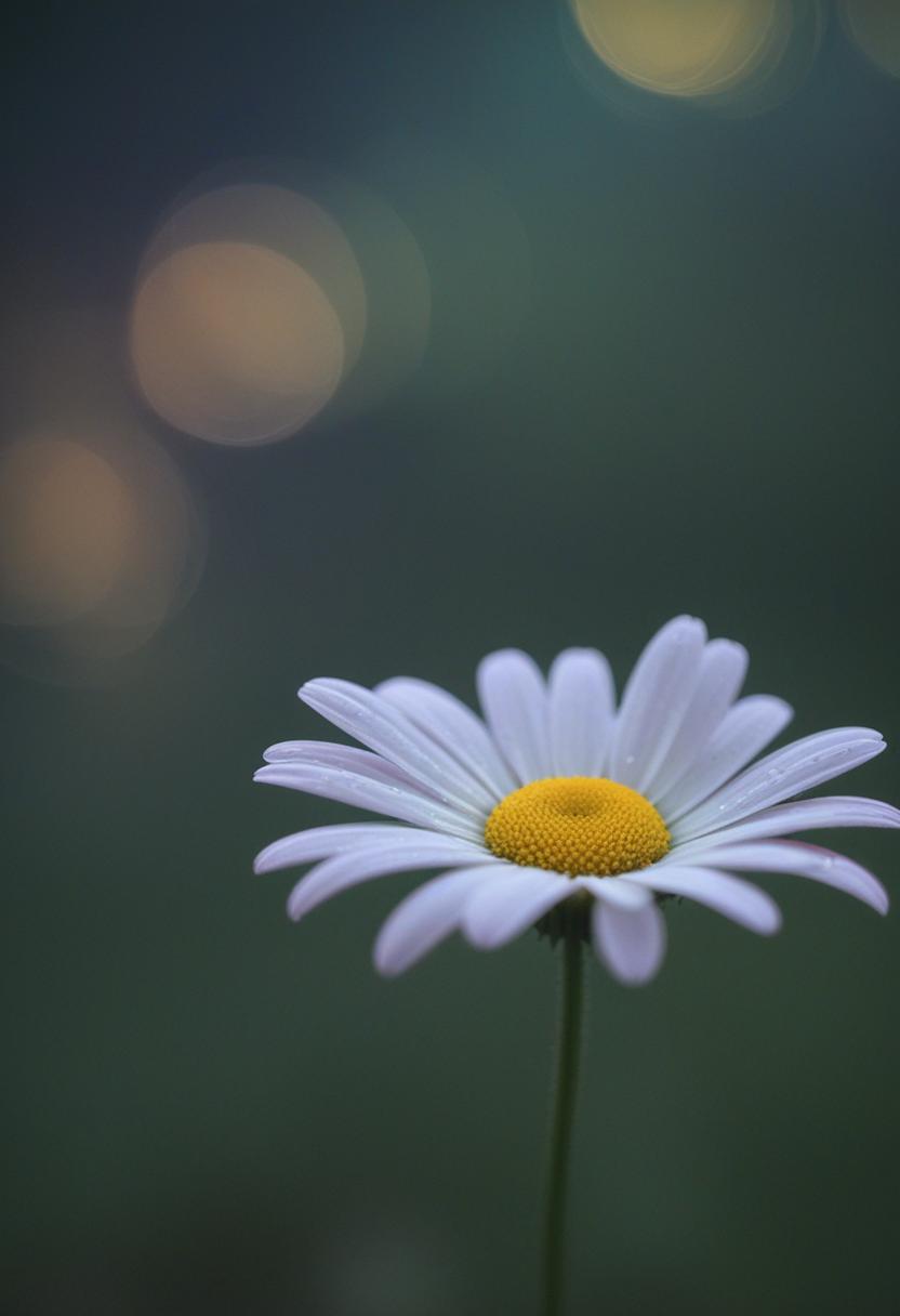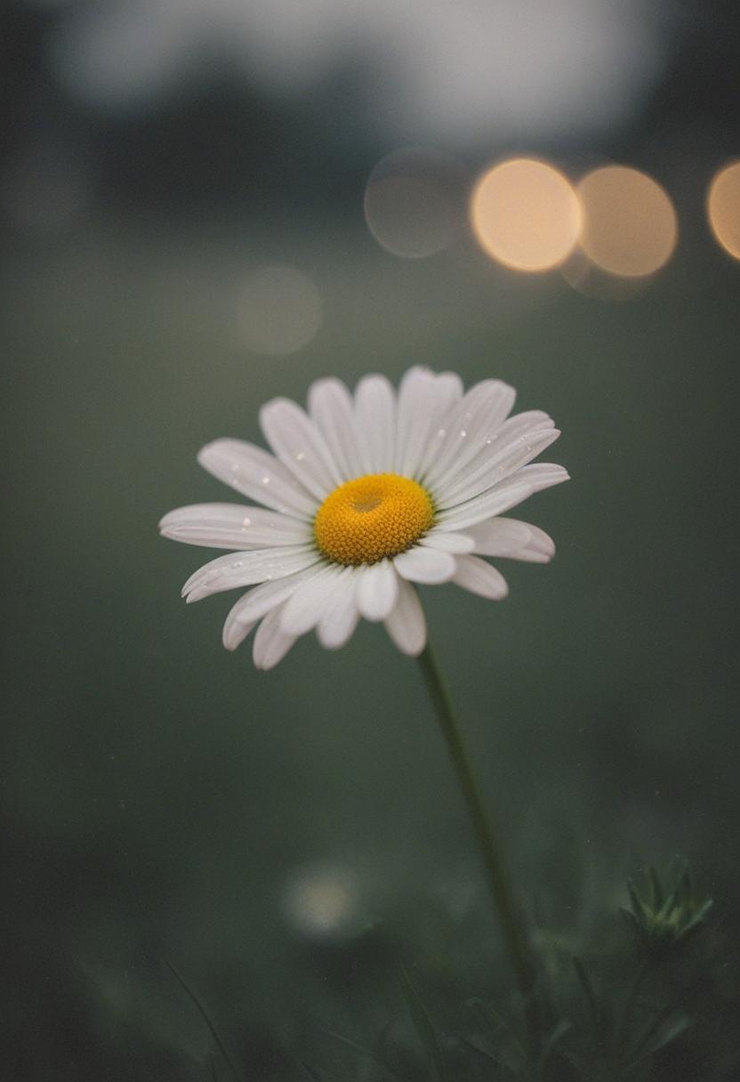 3. A close-up of a daisy under moonlight, capturing a romantic, dreamy atmosphere with soft lighting and a serene, elegant vibe.