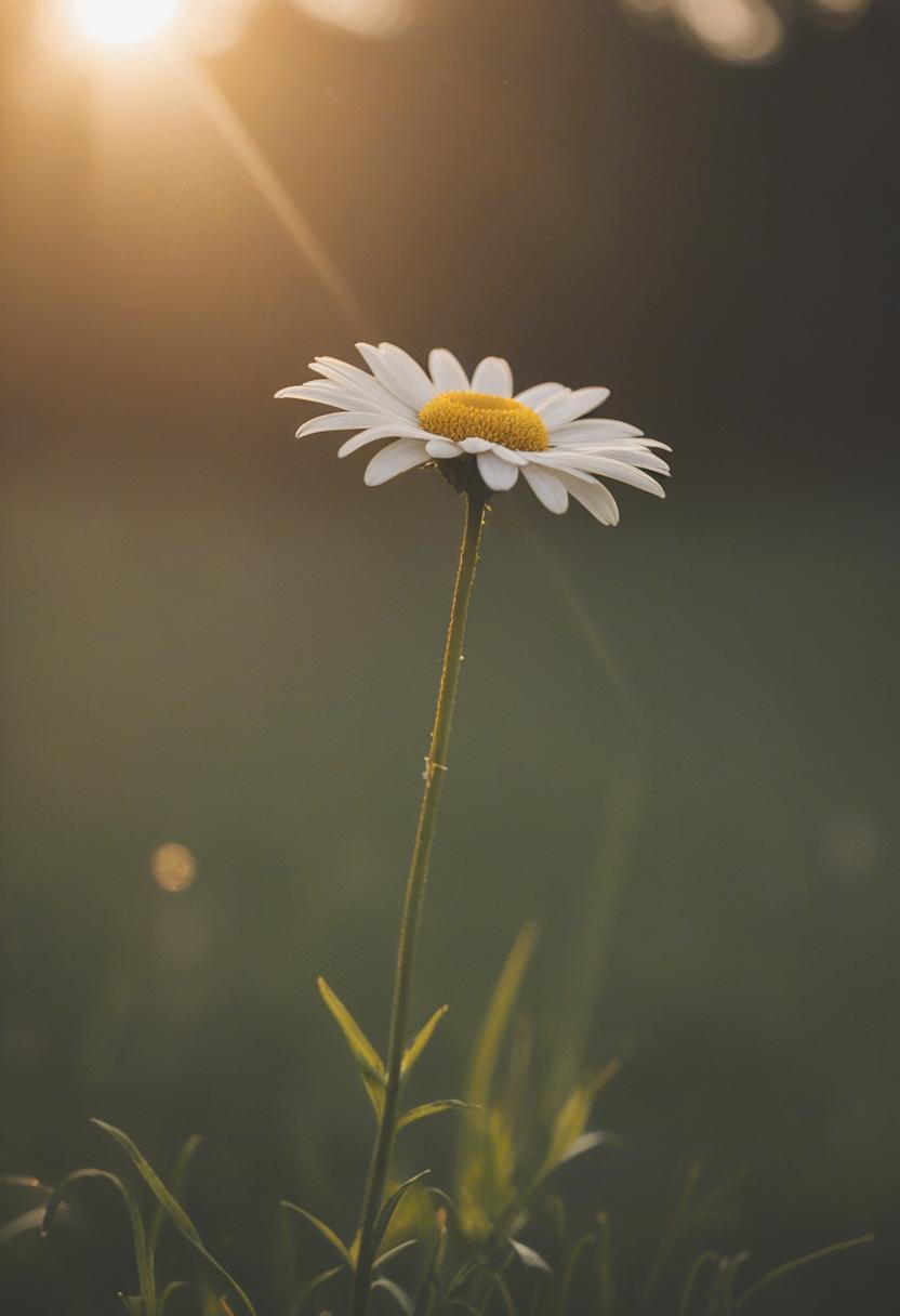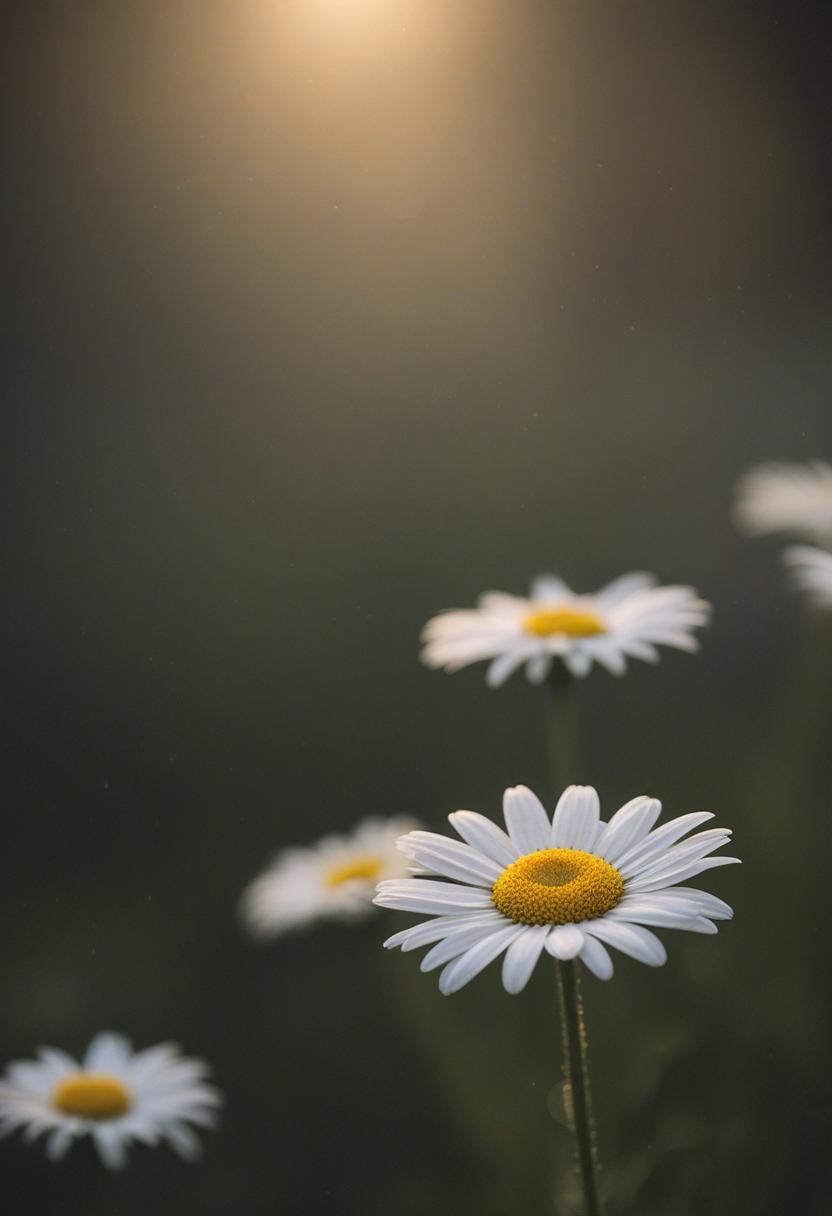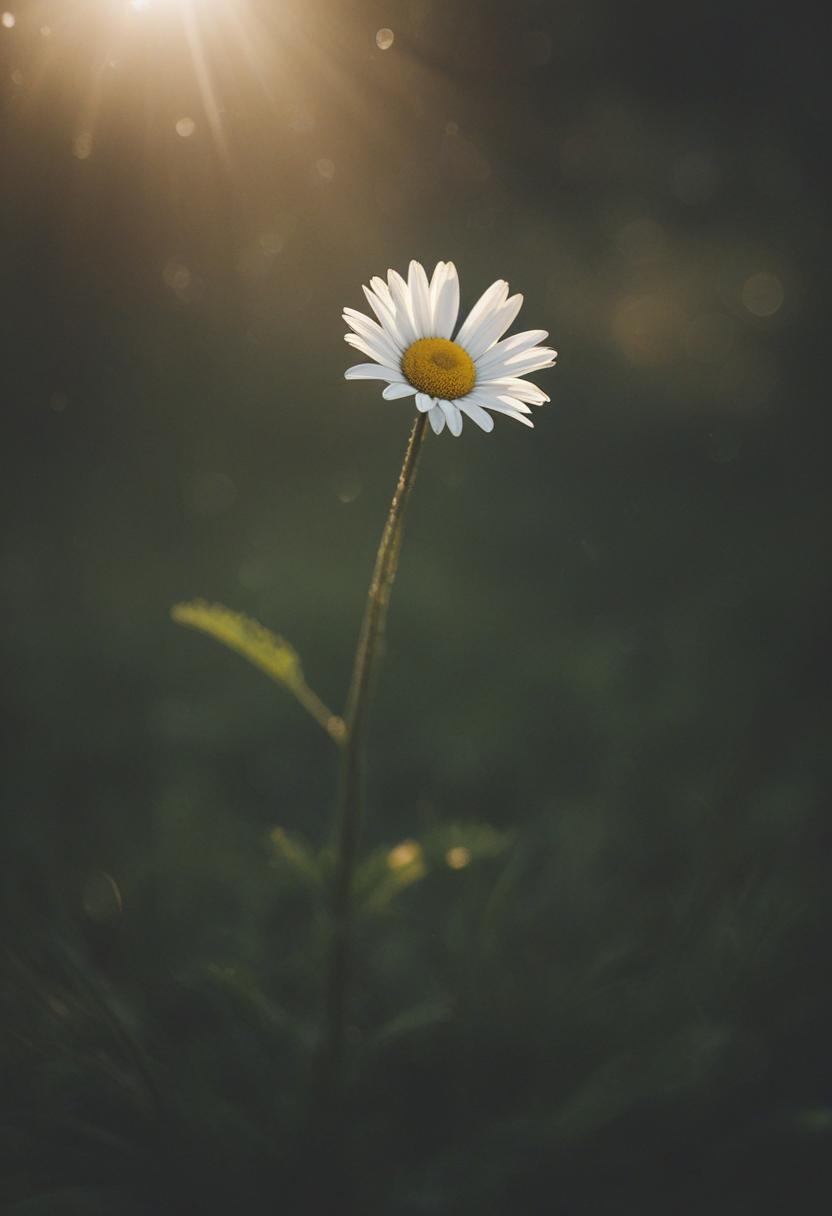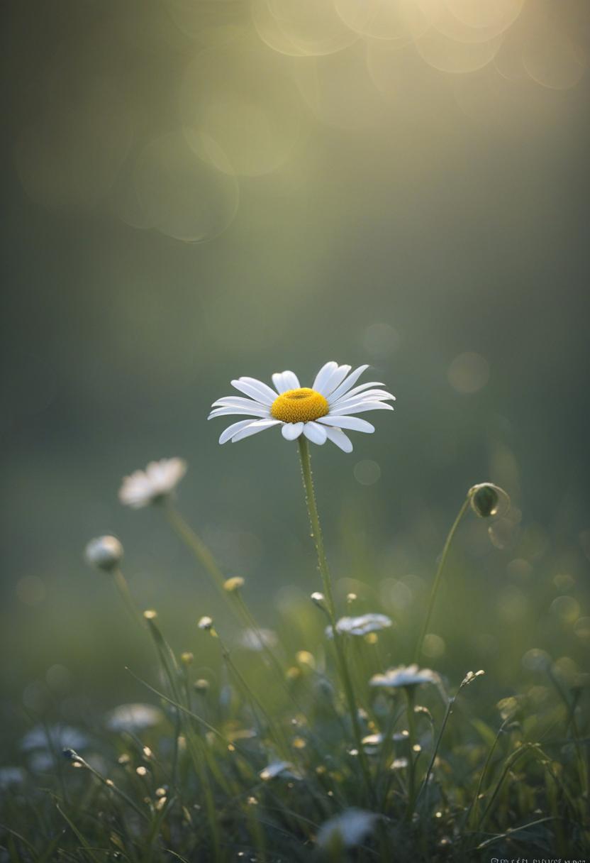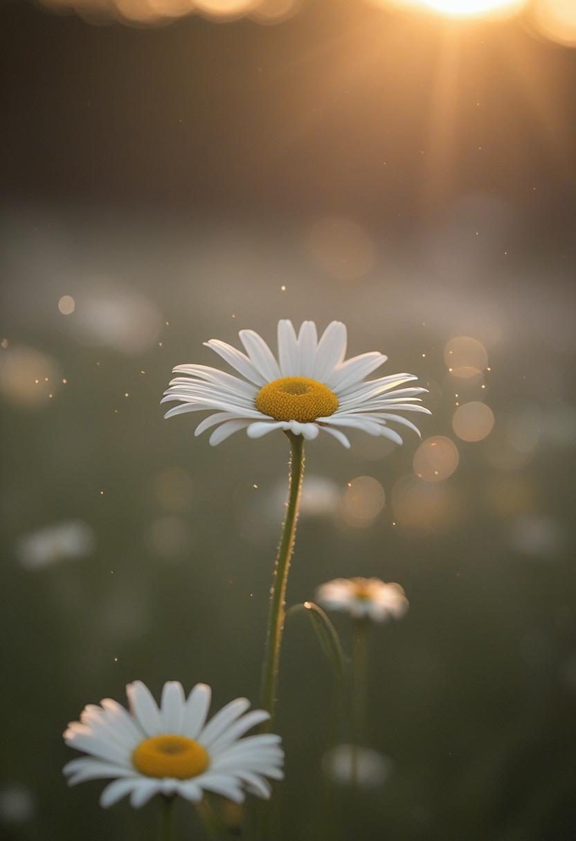 1. A soft morning light bathes a daisy in a mysterious, ethereal glow from above, creating a serene and dreamy daisy aesthetic.
