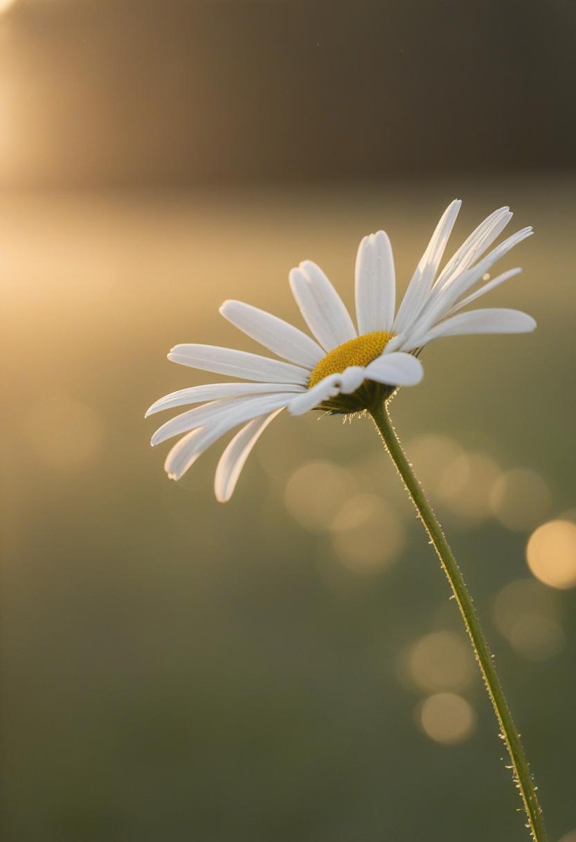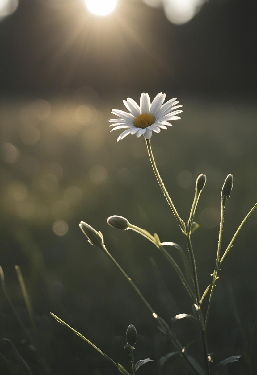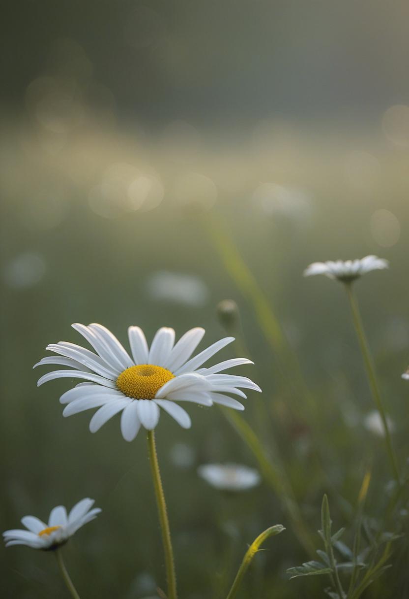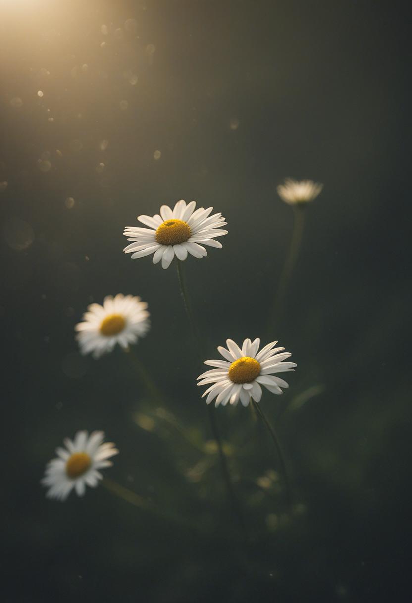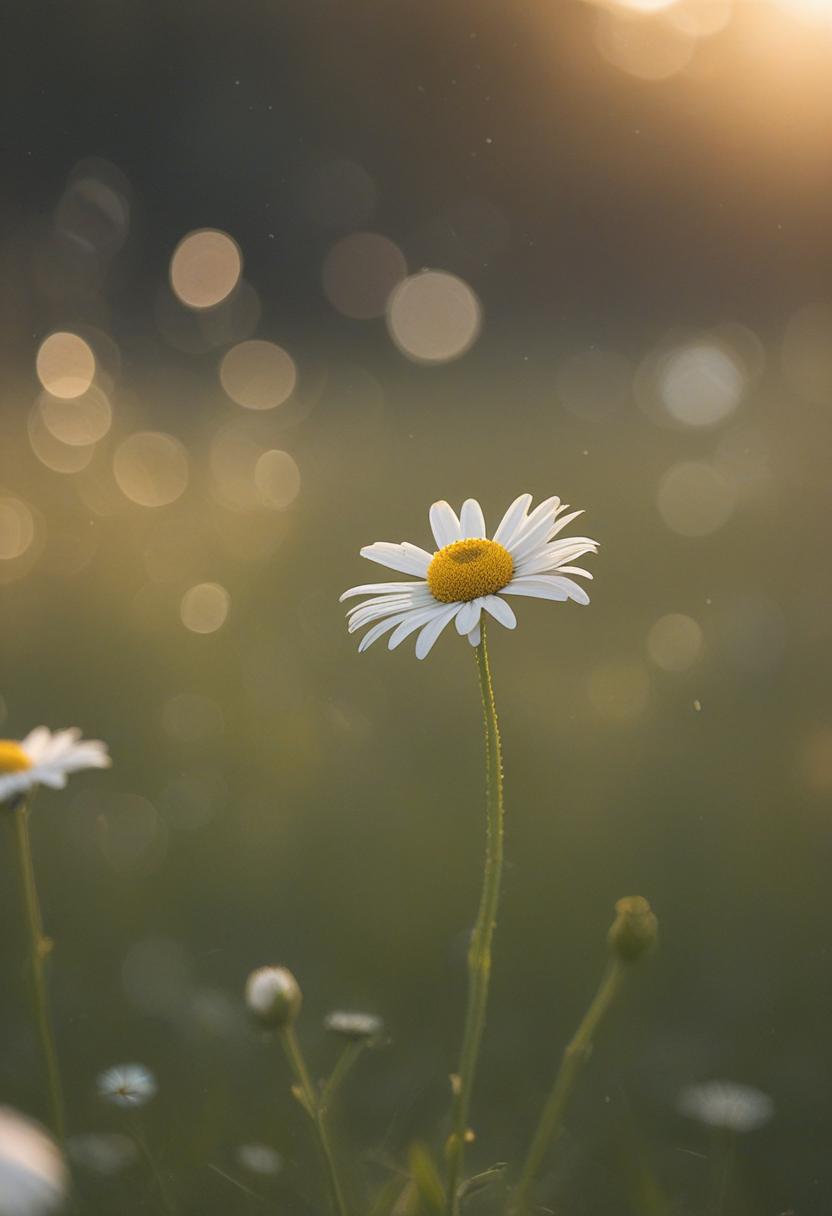 1. A soft morning light bathes a daisy in a mysterious, ethereal glow from above, creating a serene and dreamy daisy aesthetic.
