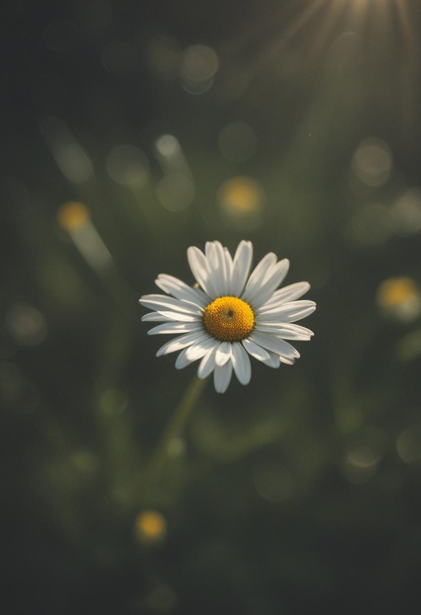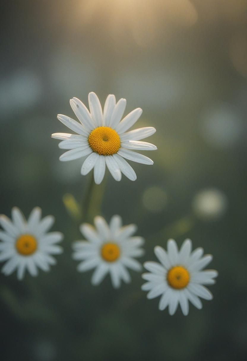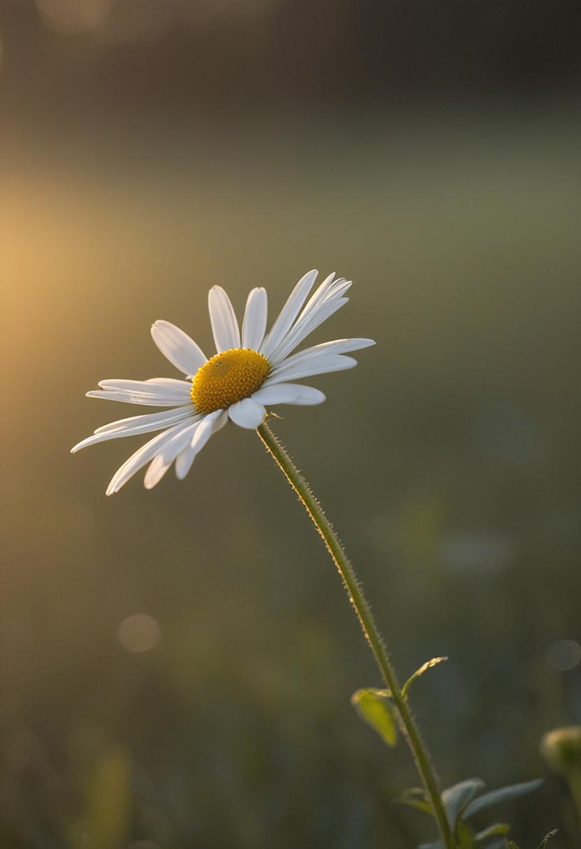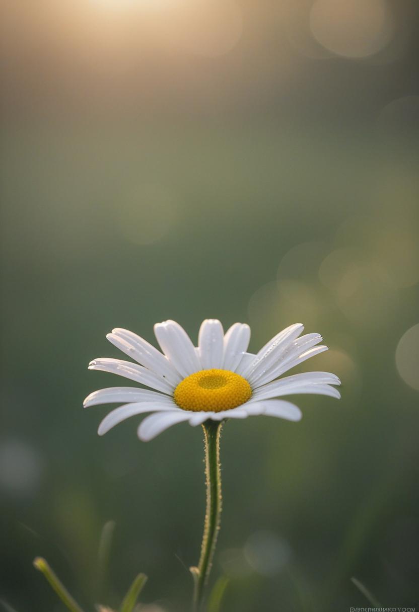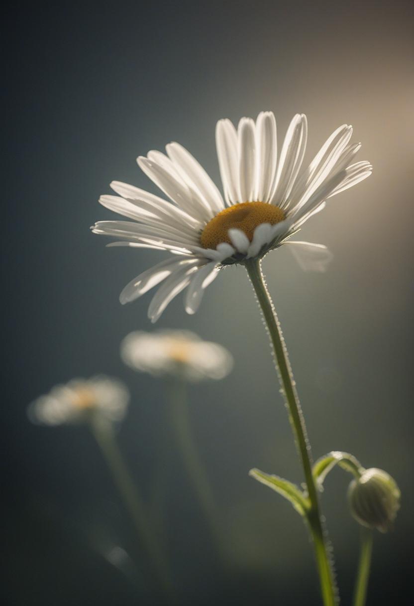 1. A soft morning light bathes a daisy in a mysterious, ethereal glow from above, creating a serene and dreamy daisy aesthetic.