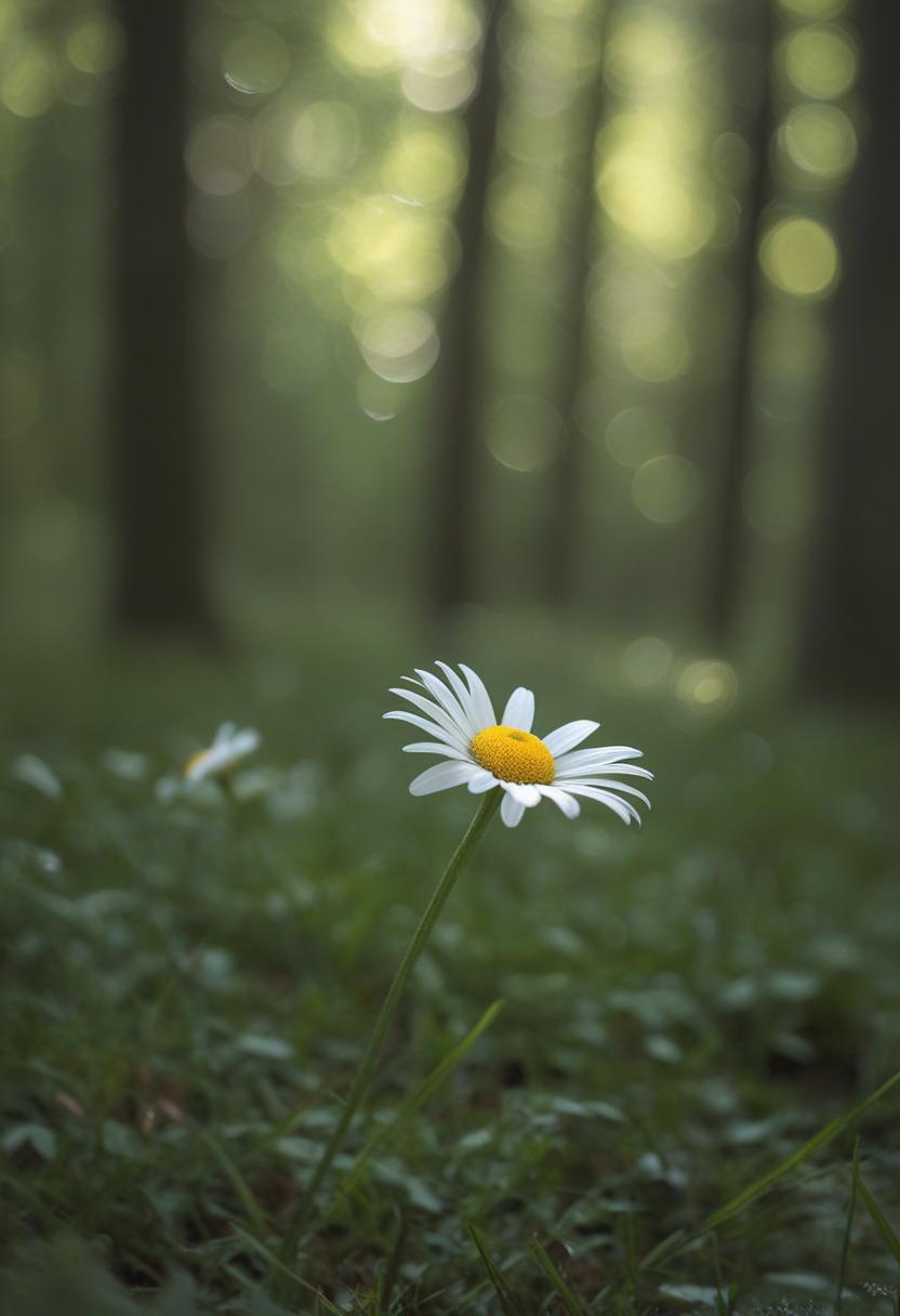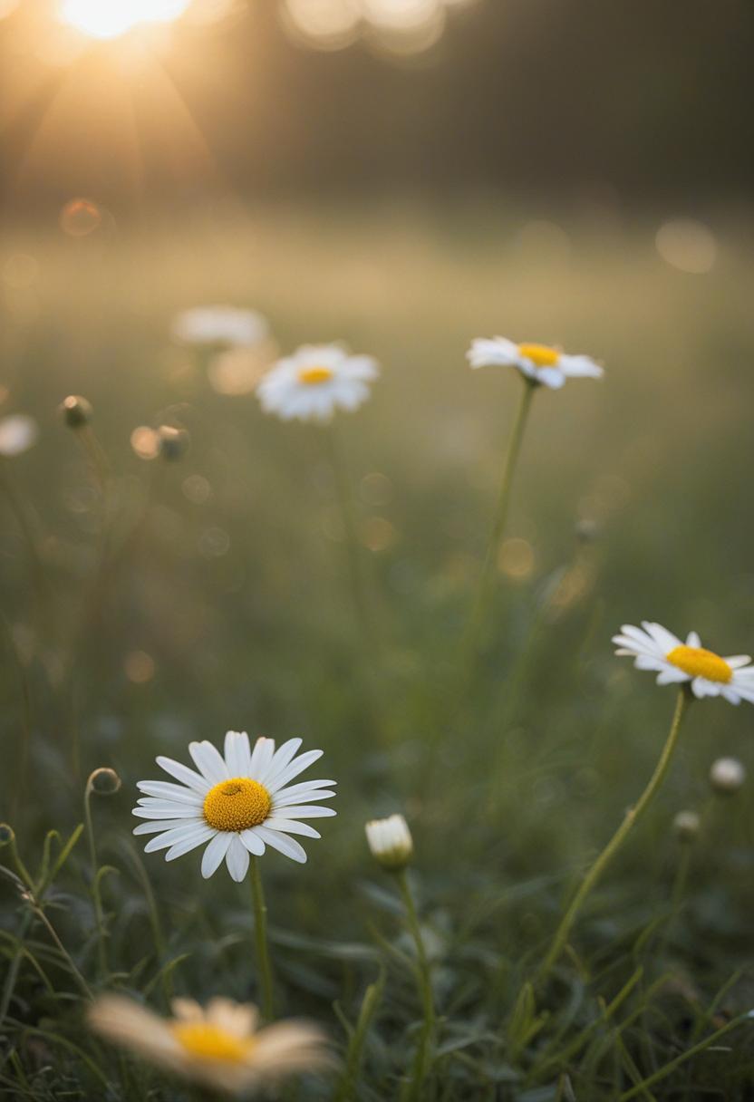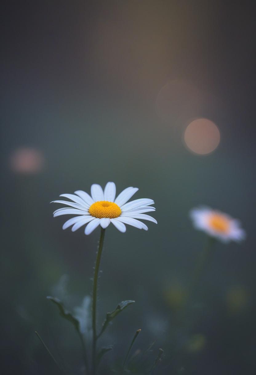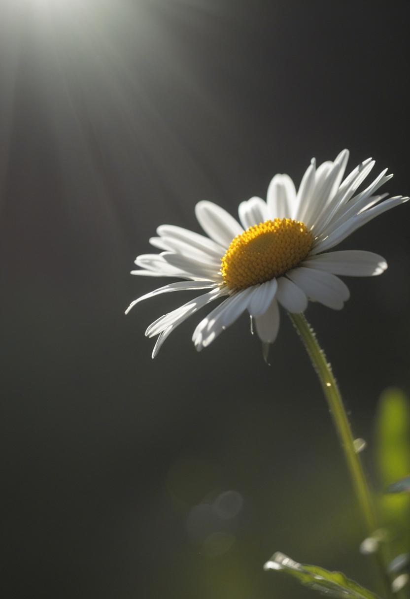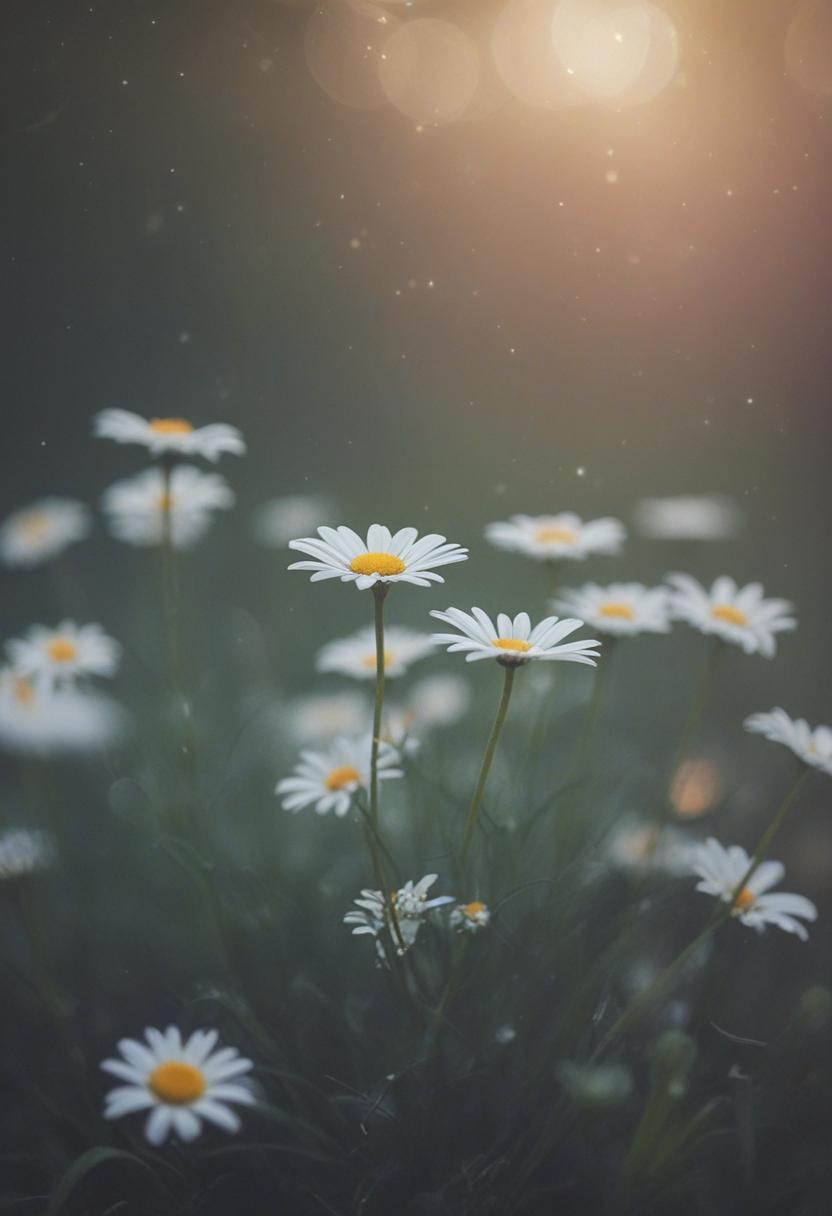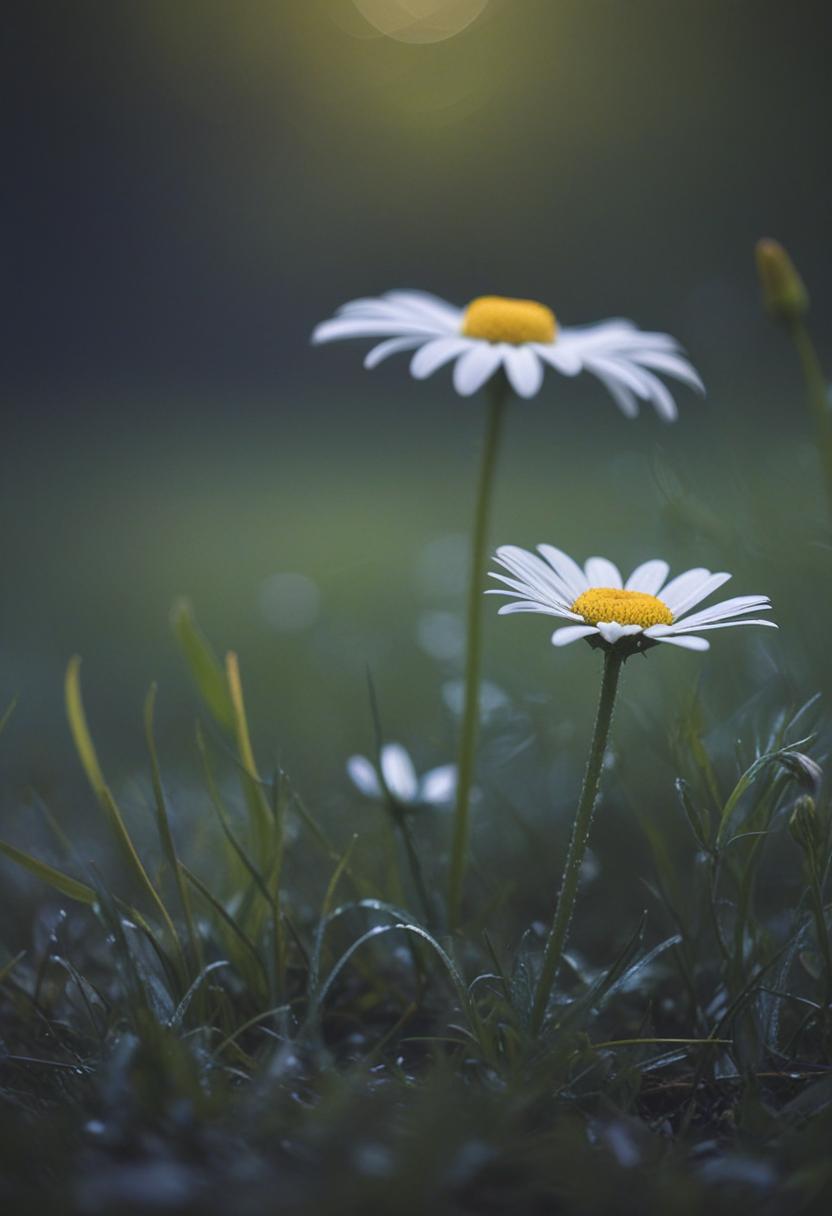 1. A soft morning light bathes a daisy in a mysterious, ethereal glow from above, creating a serene and dreamy daisy aesthetic.