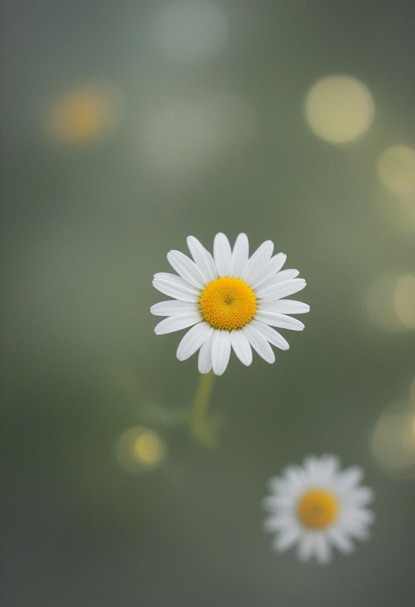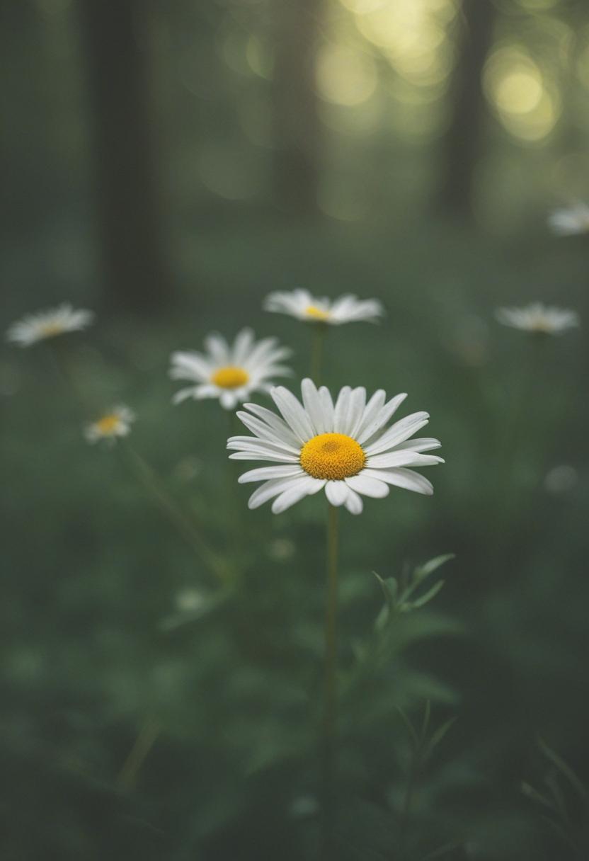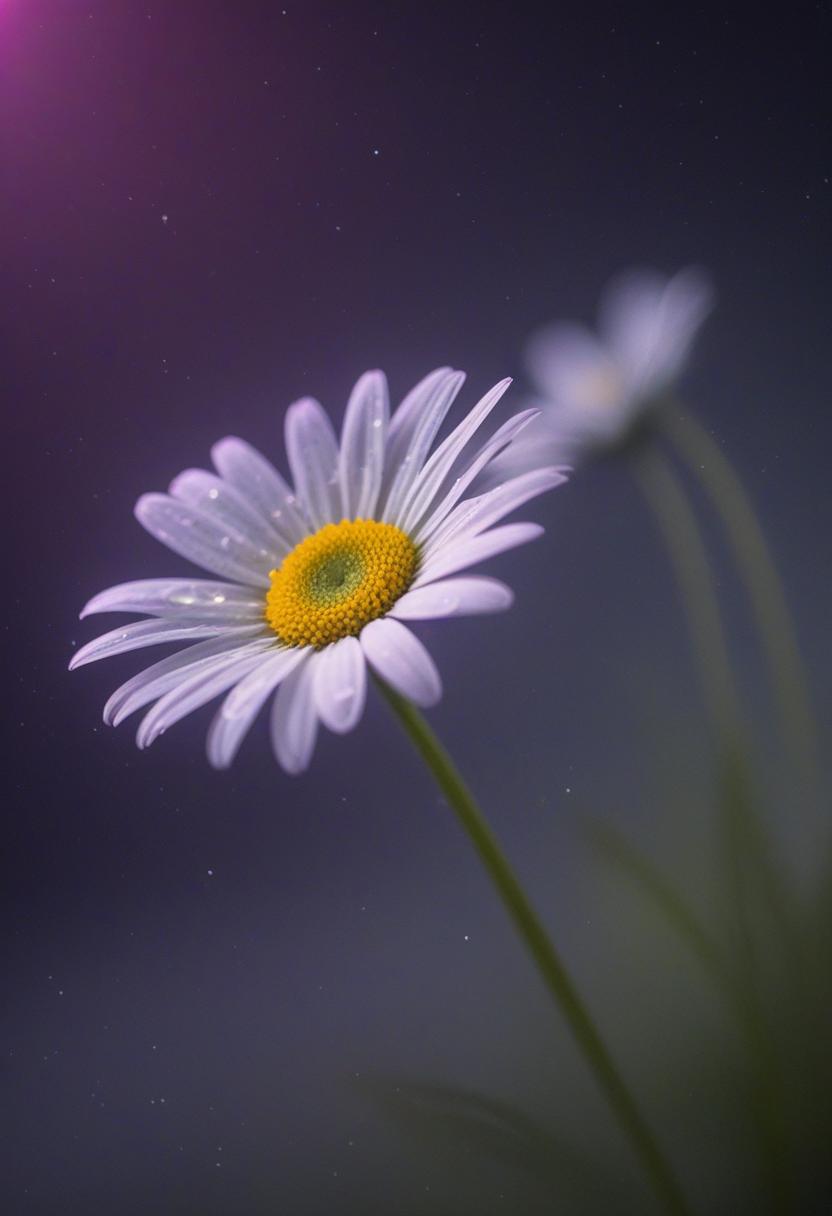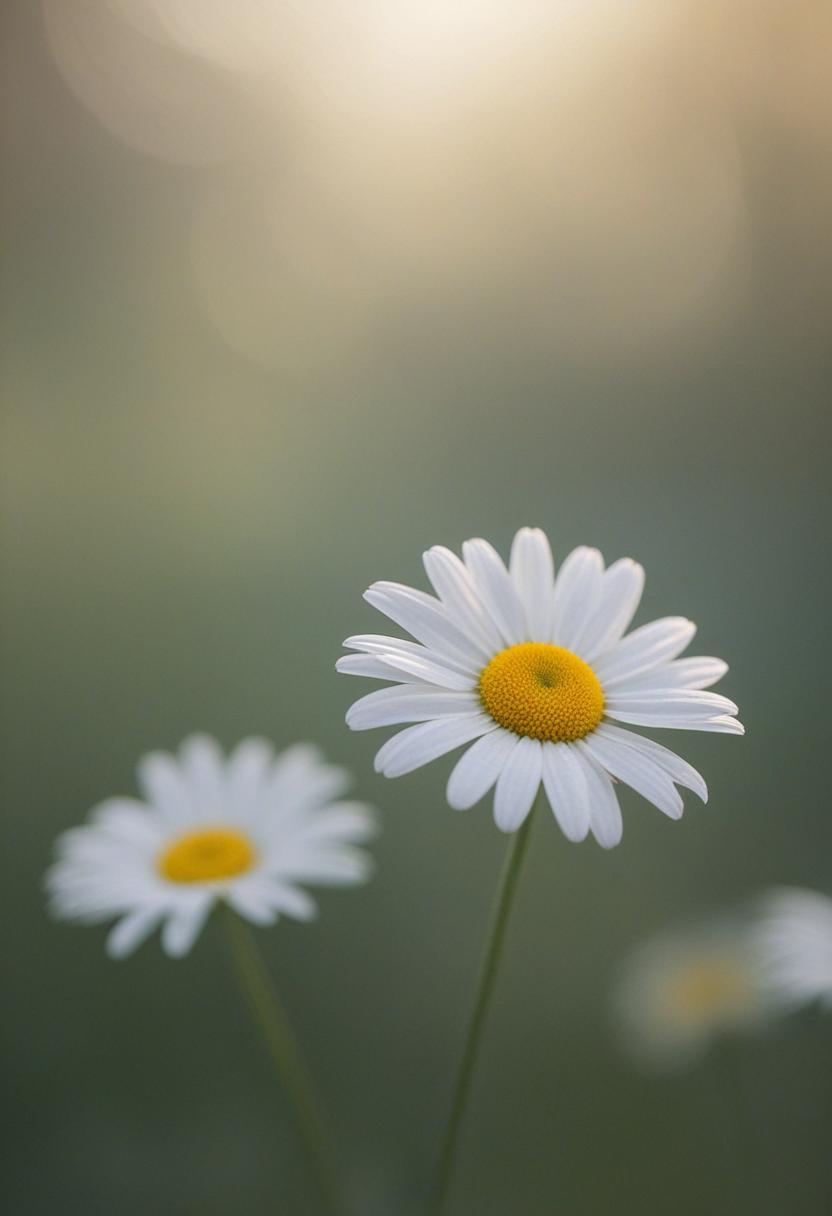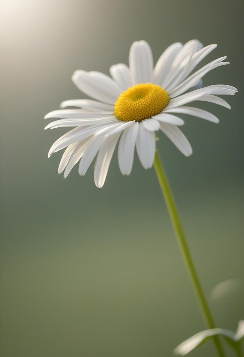 1. A soft morning light bathes a daisy in a mysterious, ethereal glow from above, creating a serene and dreamy daisy aesthetic.