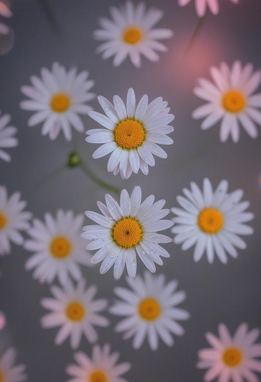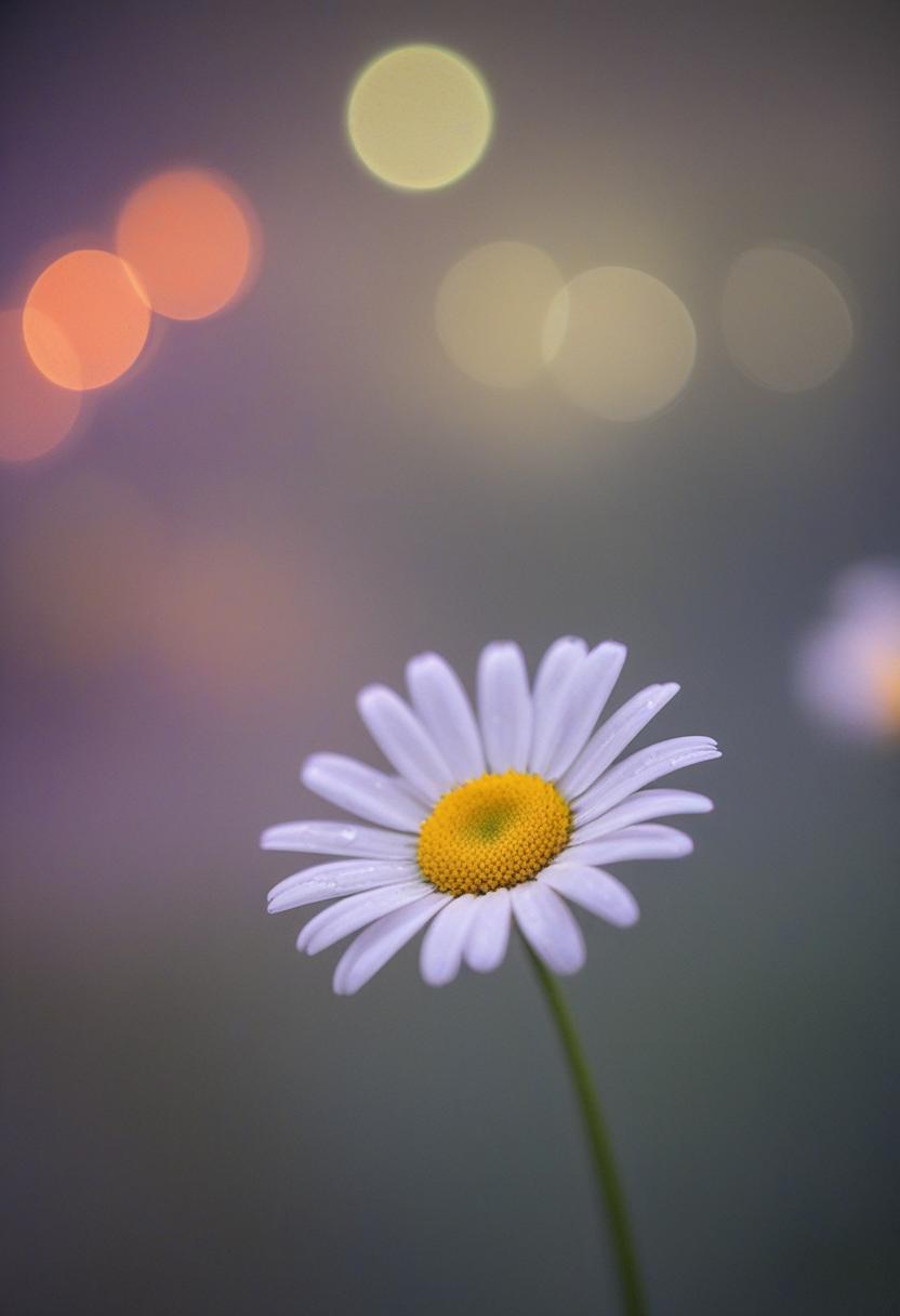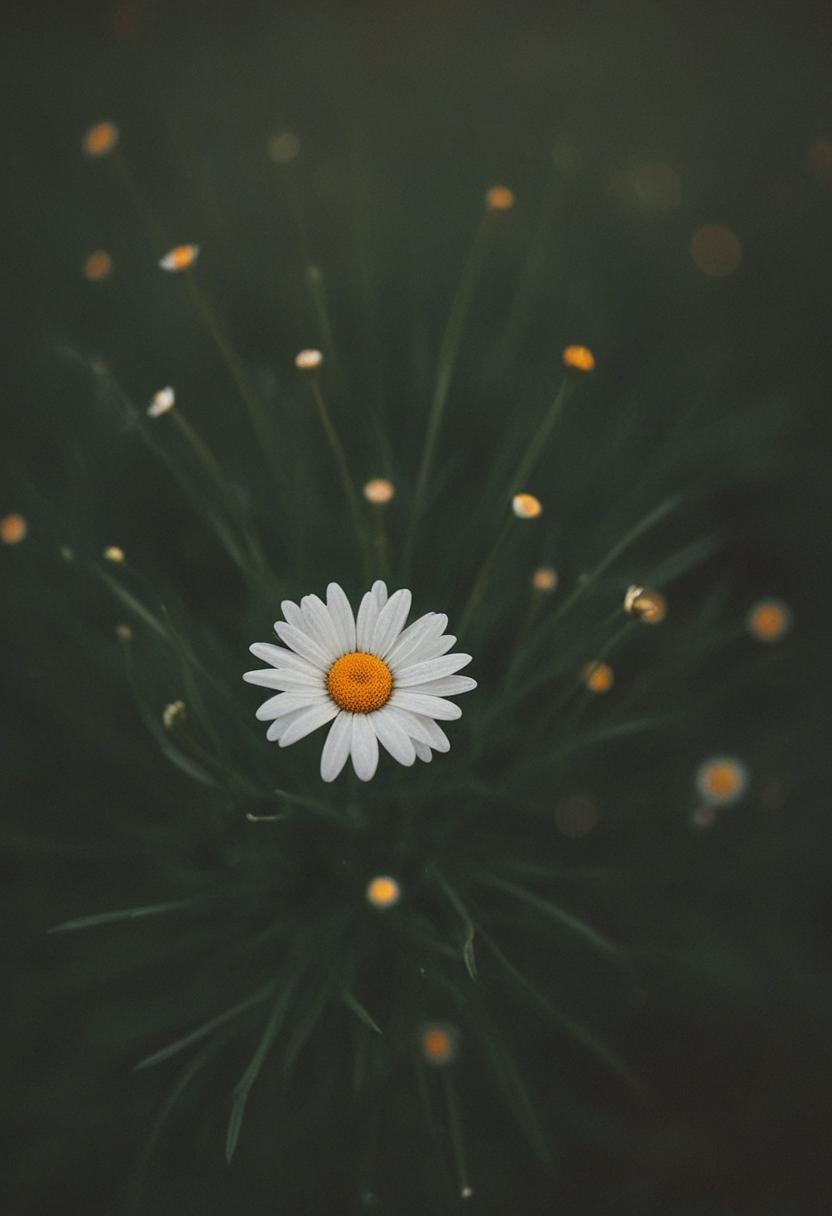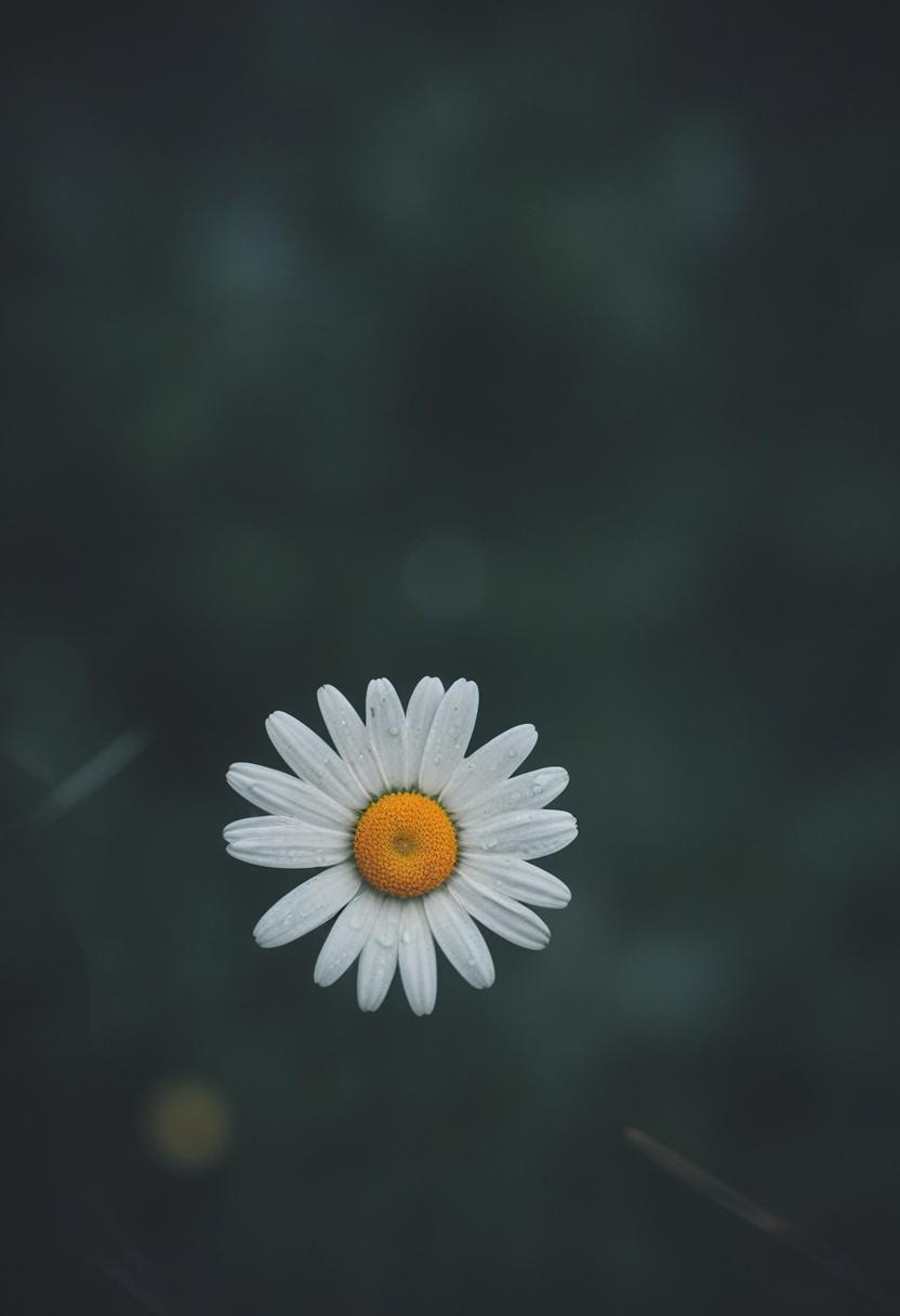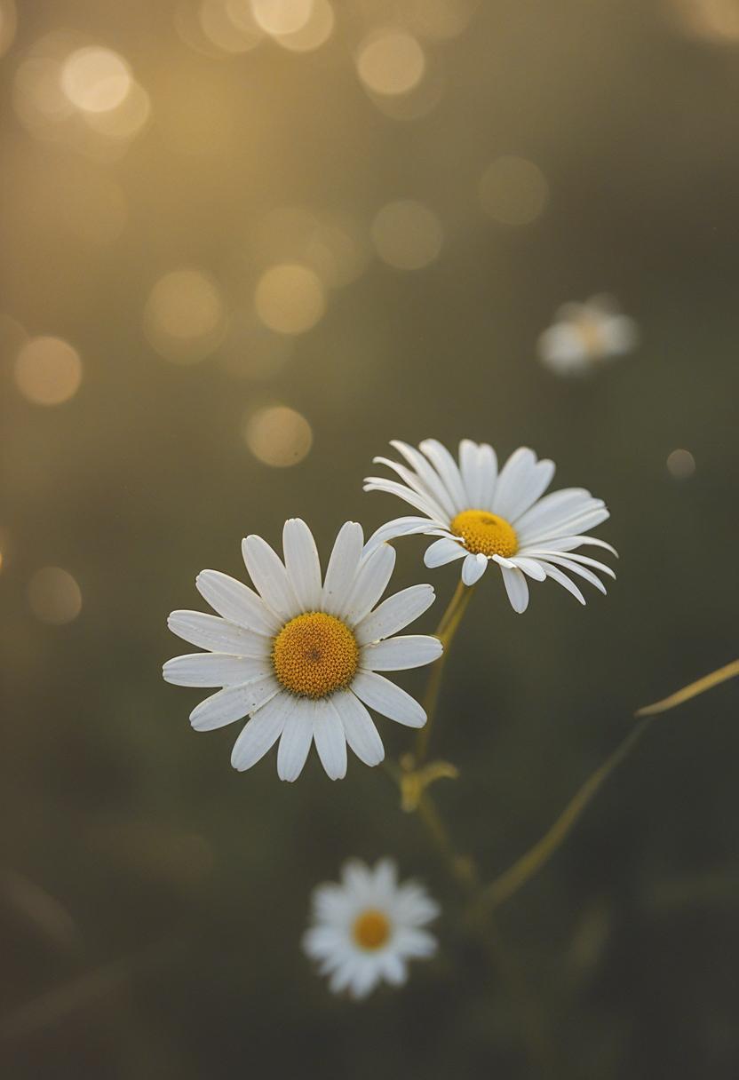 1. A soft morning light bathes a daisy in a mysterious, ethereal glow from above, creating a serene and dreamy daisy aesthetic.