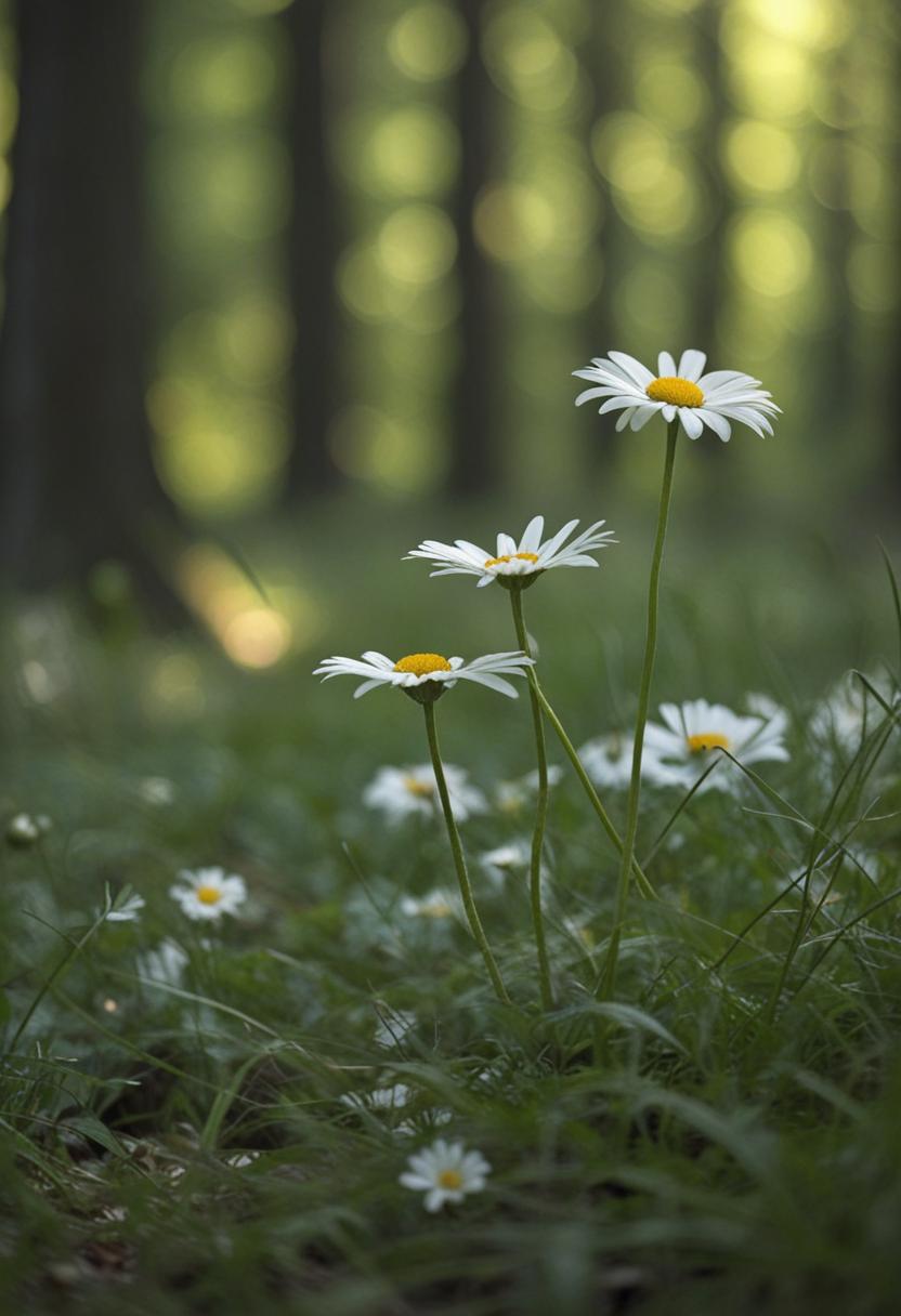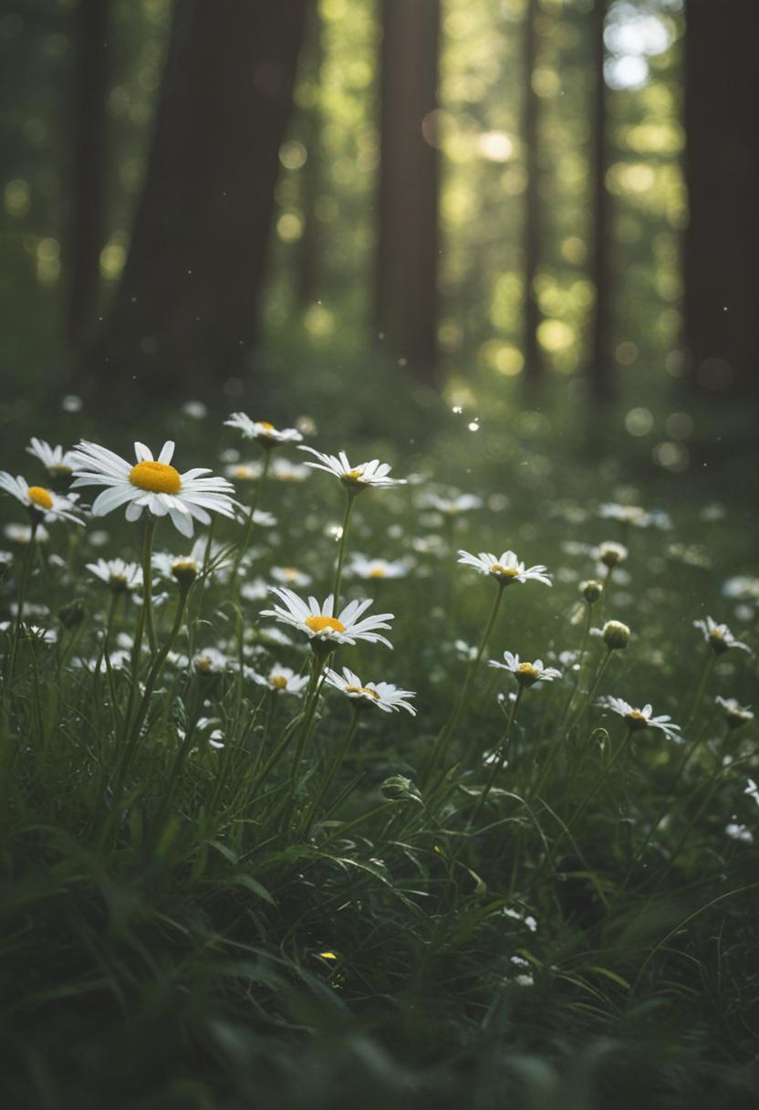 10. A daisy-filled forest bathed in soft, dappled light, viewed from the enchanting side, evoking a whimsical, dreamlike daisy aesthetic.