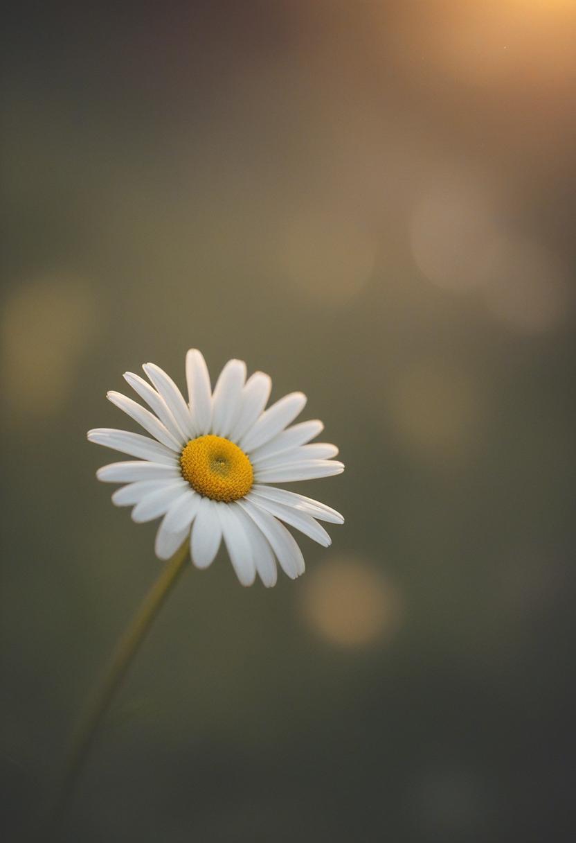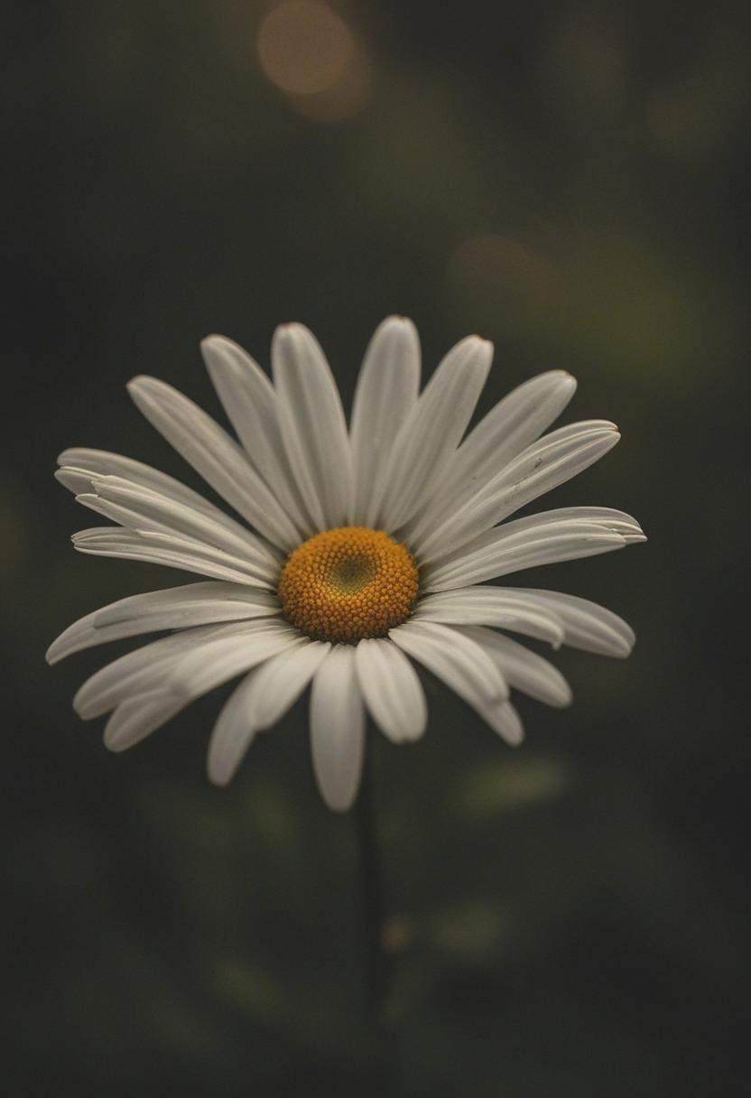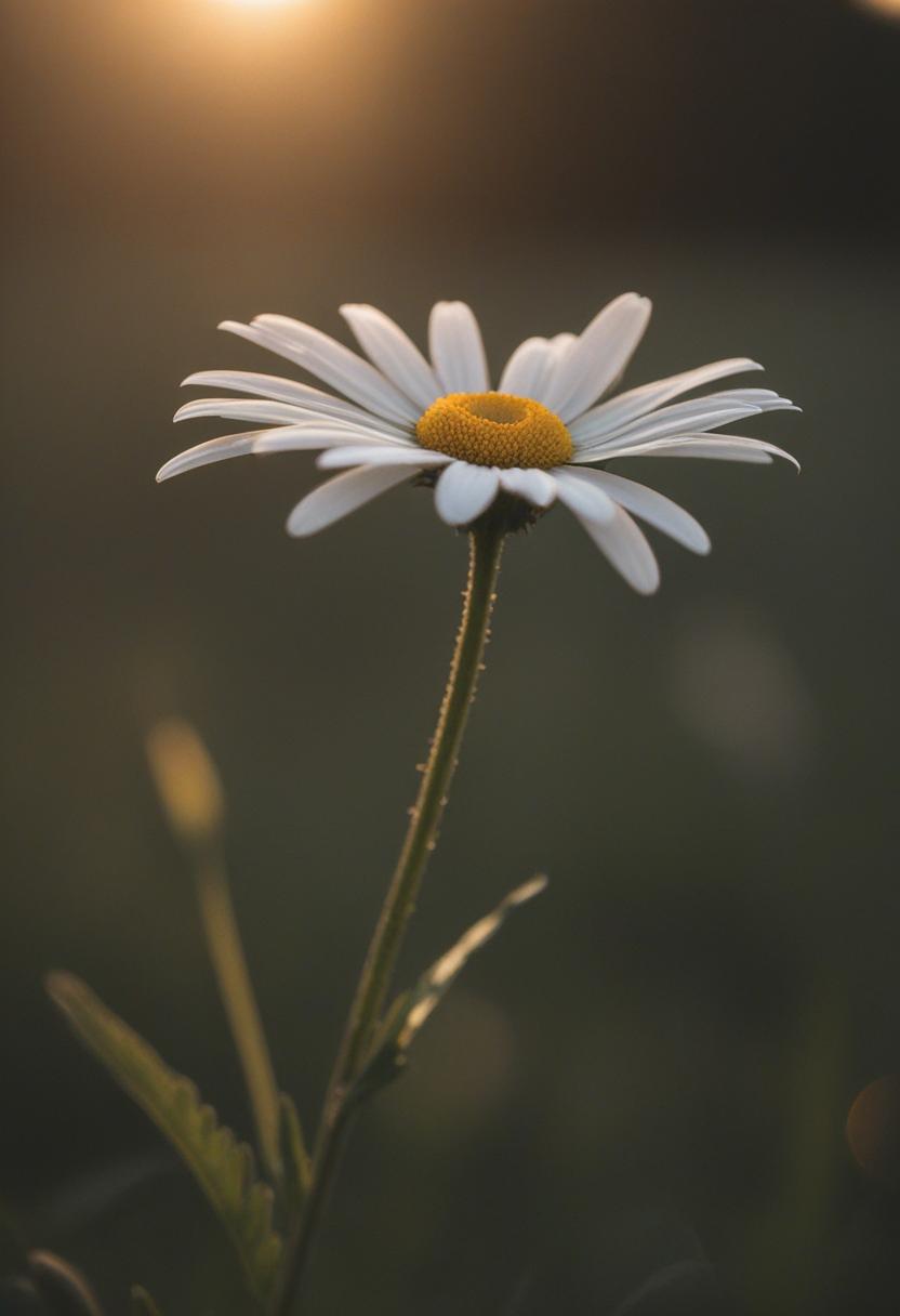 50. A moody close-up of a daisy in golden hour light, capturing soft shadows and warm tones, evoking a dreamy, serene daisy aesthetic.
