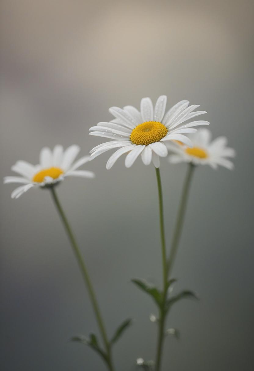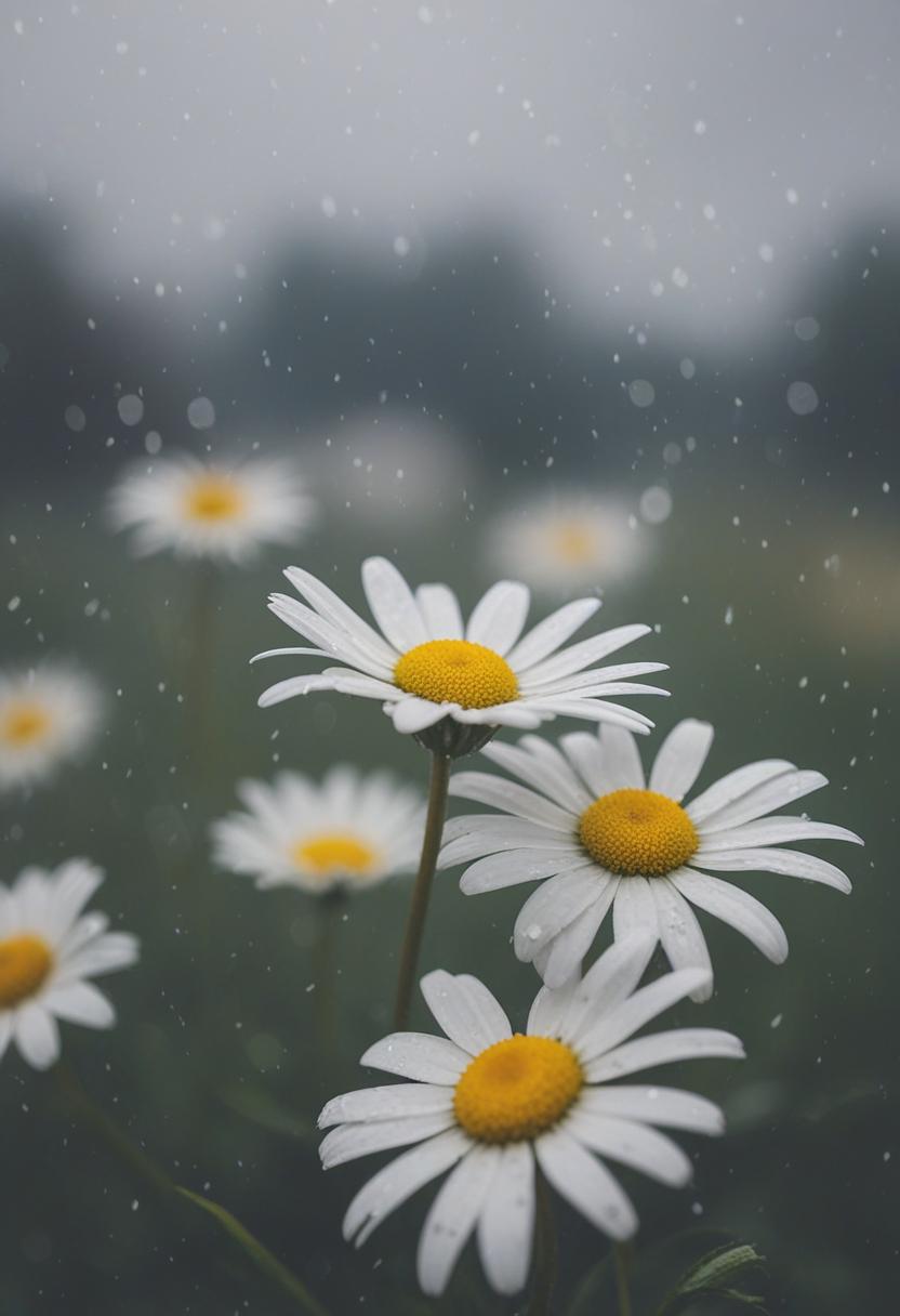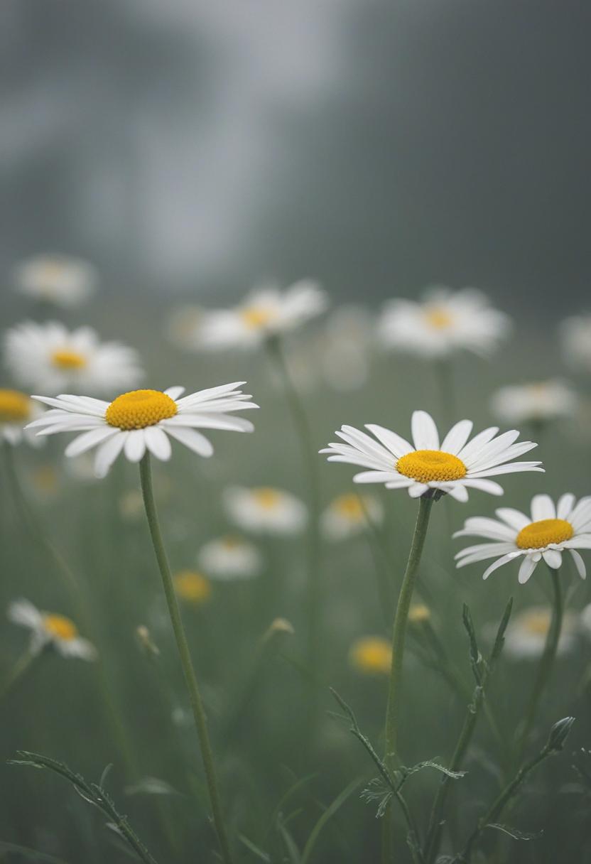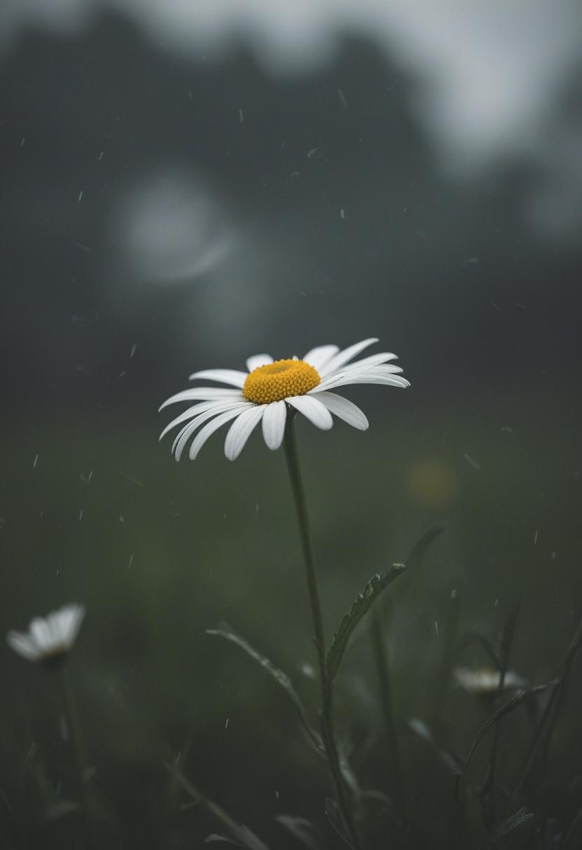 32. A moody midshot of a daisy in cloudy, overcast light, exuding a soft, ethereal daisy aesthetic.