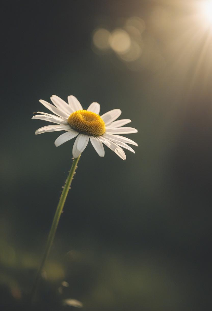 64. A daisy in dramatic backlight, casting a nostalgic glow with a side view that evokes timeless beauty and quiet emotion.