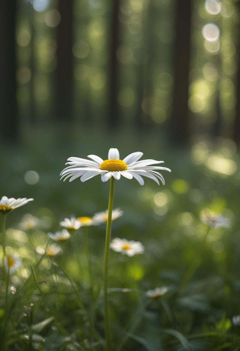 27. A daisy blooms in soft forest light, dappled by trees, creating a peaceful, serene close-up scene filled with gentle warmth and natural beauty.