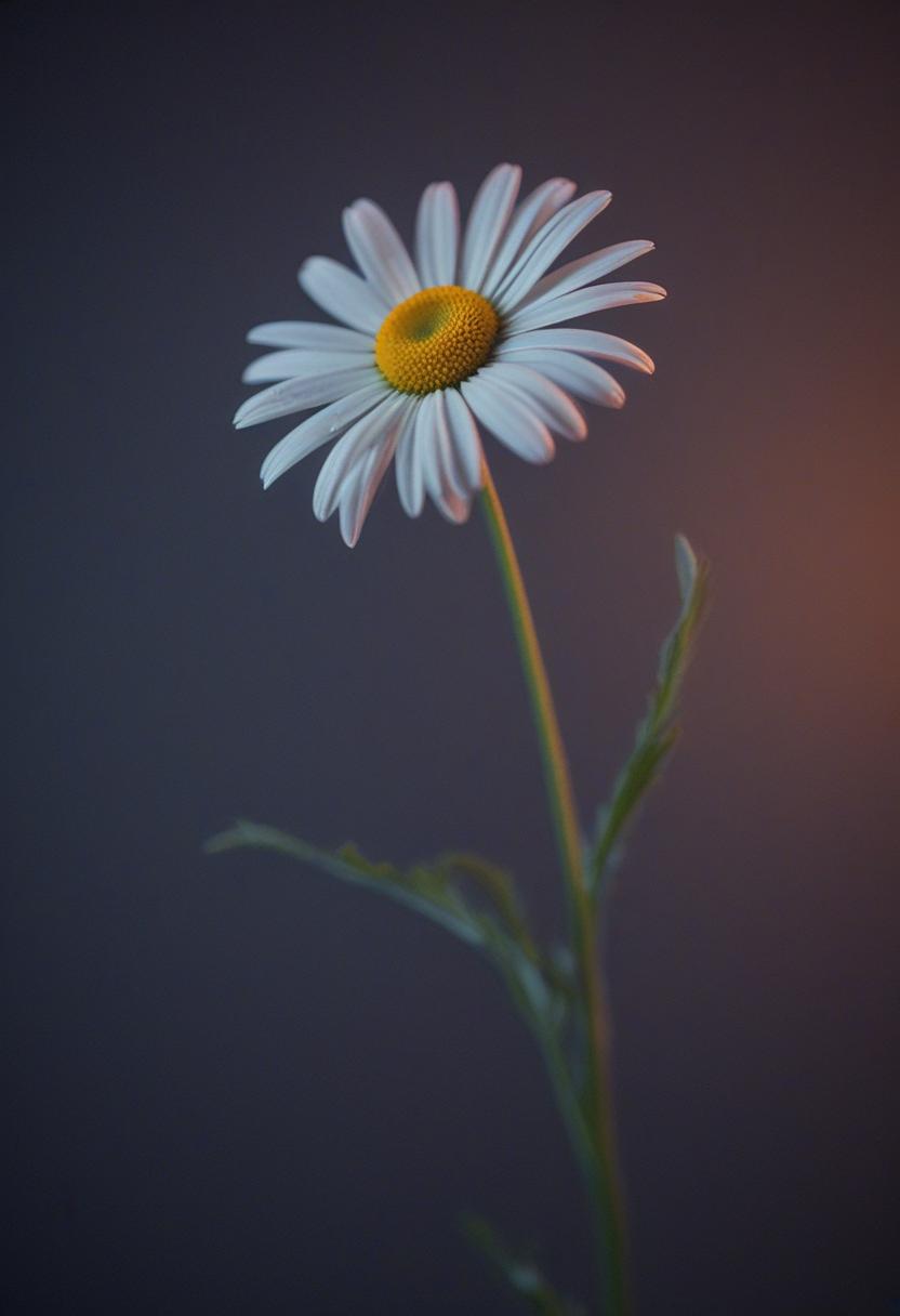 71. A surreal studio shot featuring a daisy in golden hour light, blending soft focus and dreamy tones for a serene, ethereal daisy aesthetic.