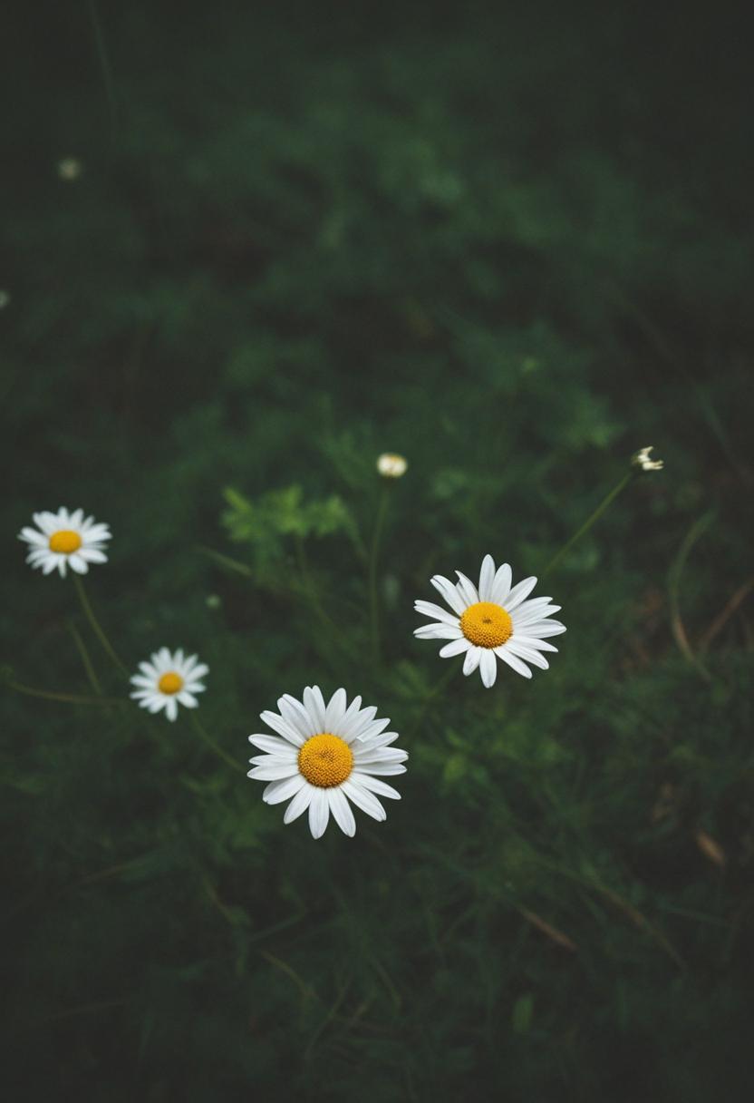 22. A daisy aesthetic scene under moonlight, captured in a studio shot. Soft lighting highlights delicate daisies against a dark background, creating an epic, dreamy atmosphere.
