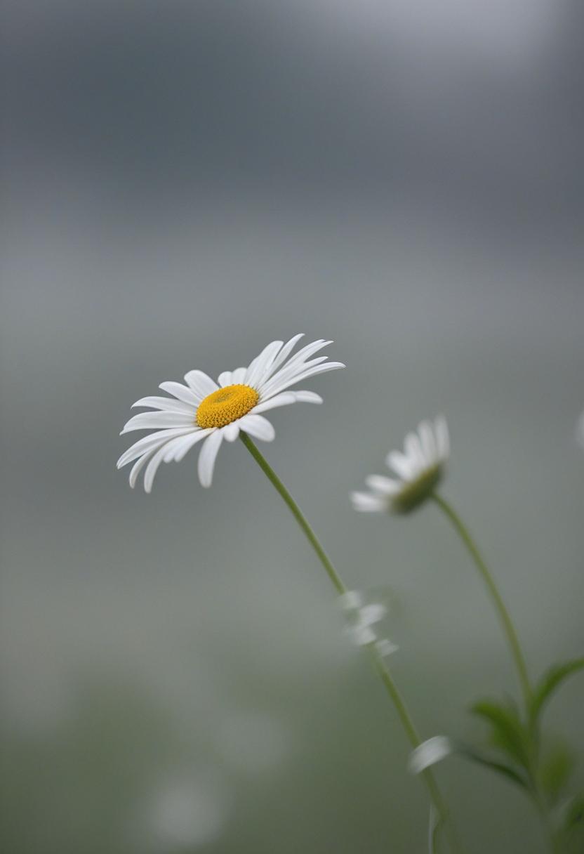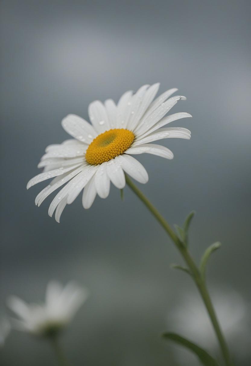 83. A soft daisy blooms under a dreamy, overcast sky, captured in a close-up that exudes ethereal beauty and calm serenity.
