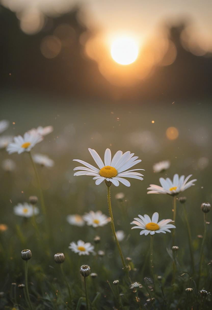 4. A daisy-filled field bathed in a soft sunset glow, ethereal and dreamy, captured in a midshot that highlights the serene beauty of nature.