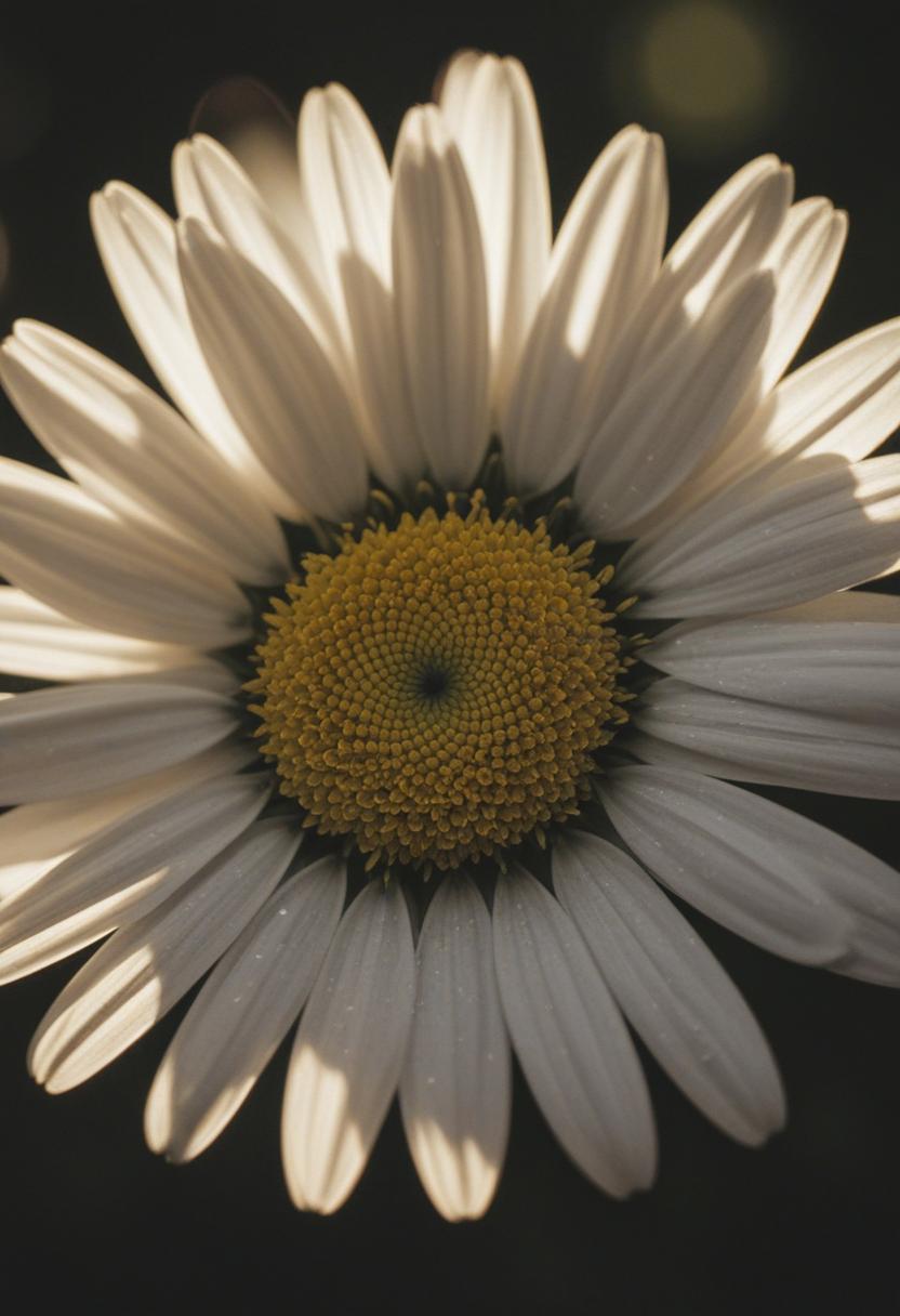 62. A nostalgic close-up of a daisy under dramatic backlighting, evoking a daisy aesthetic with soft shadows and a vintage, dreamy mood.