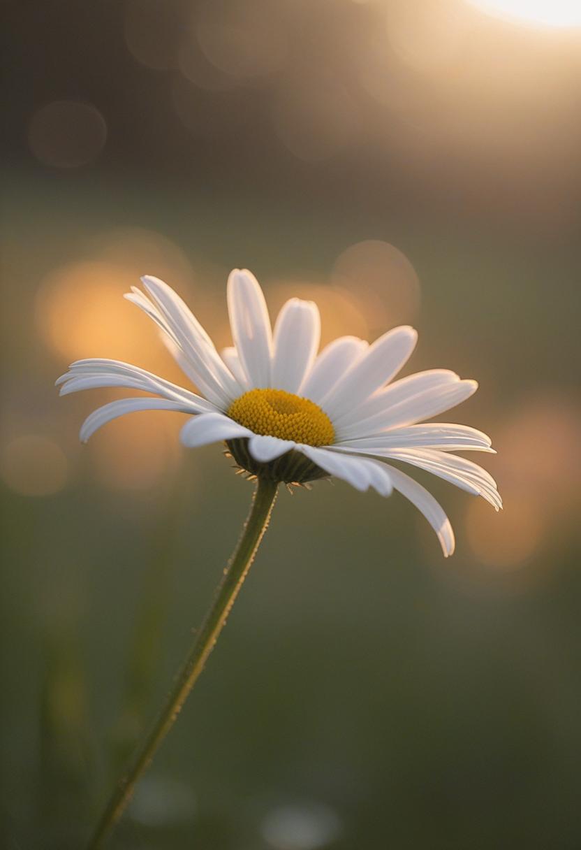 8. A cozy side view of a daisy in golden hour light, exuding a soft, warm glow with a serene and peaceful daisy aesthetic.