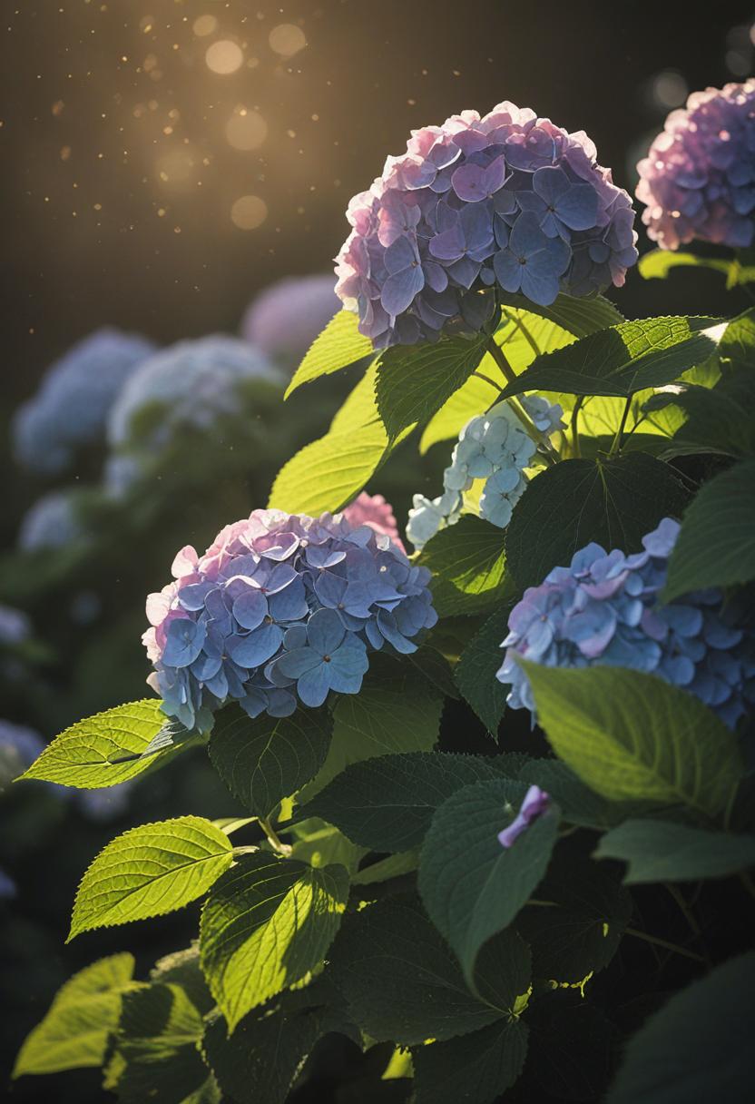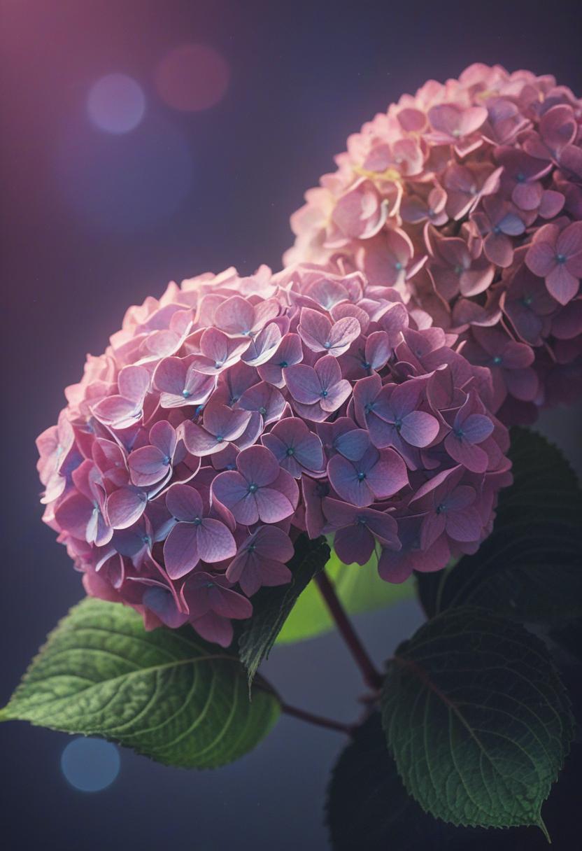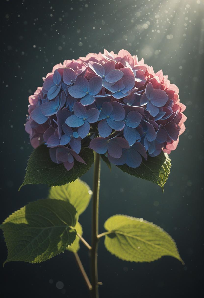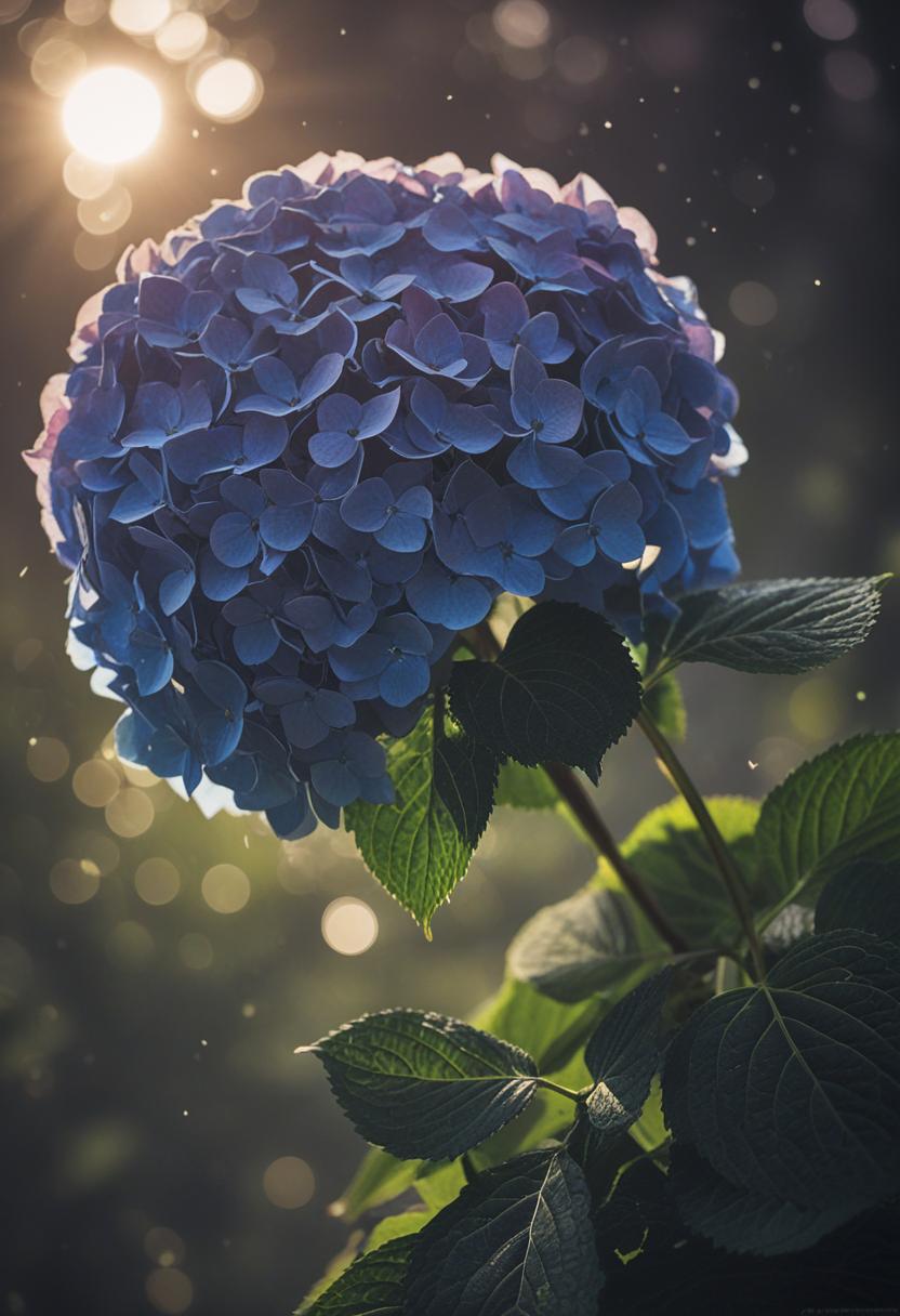 1. A dramatic hydrangea in enchanted studio lighting, backlit for a mystical, dreamy aesthetic. Soft shadows and vibrant blooms create a whimsical, magical atmosphere.