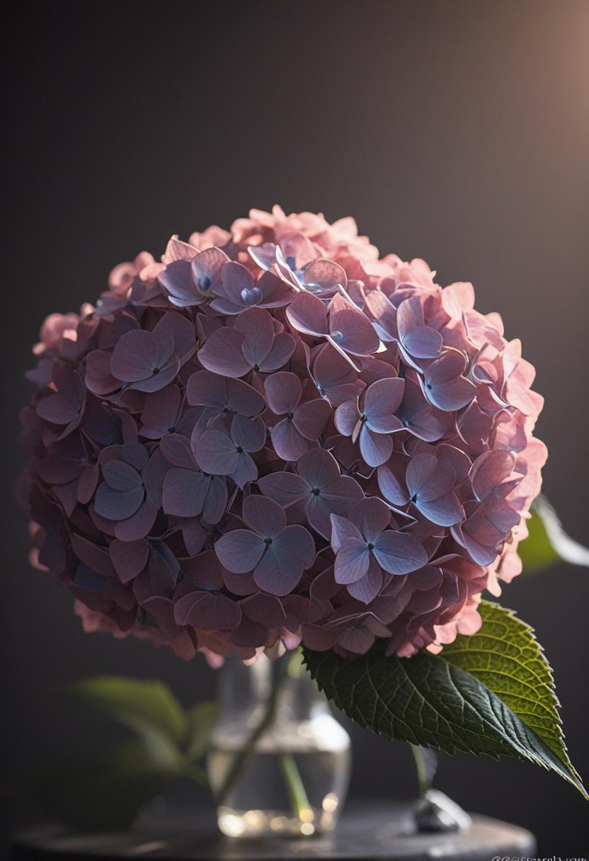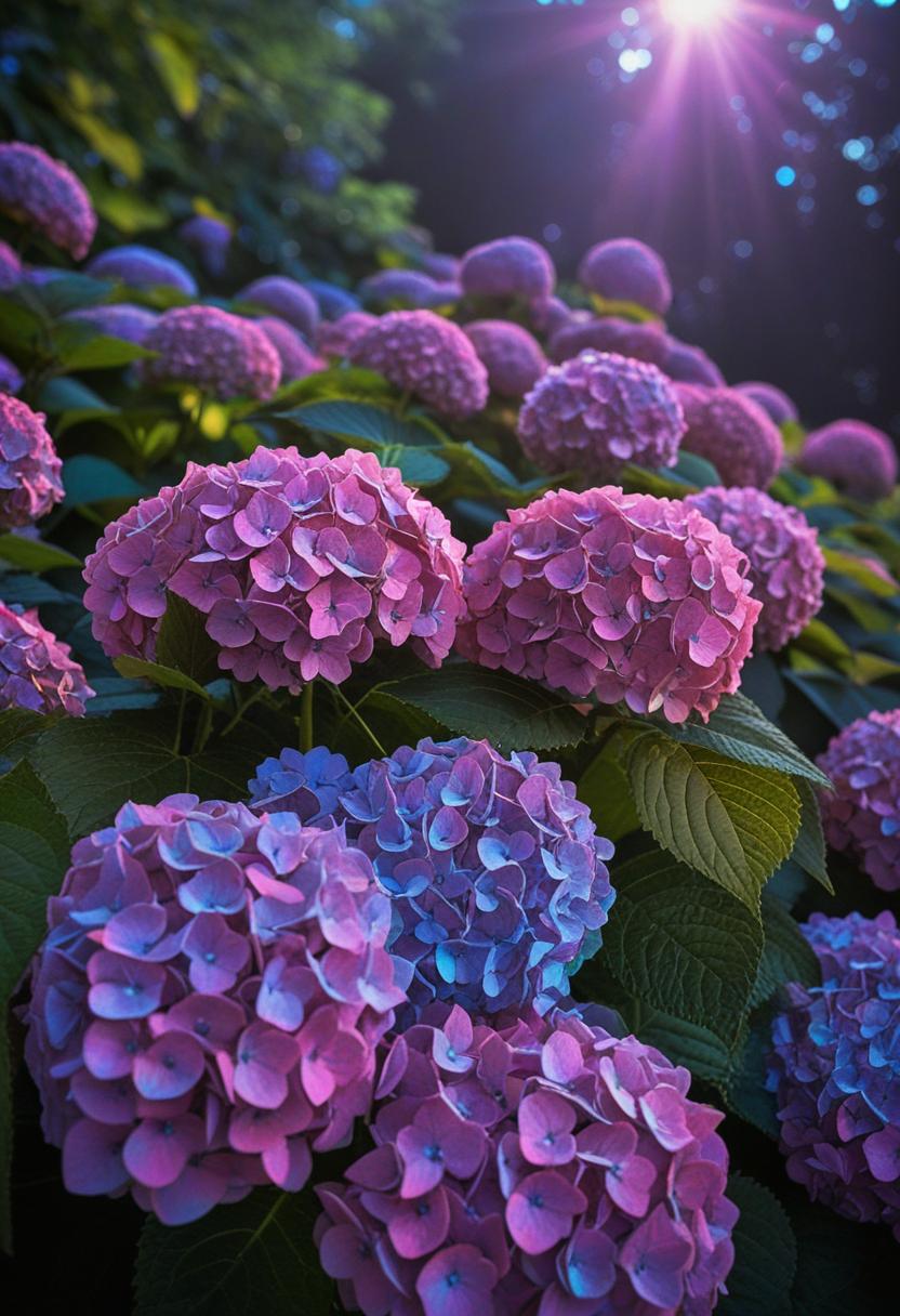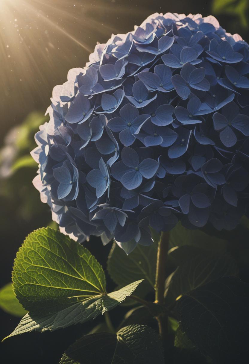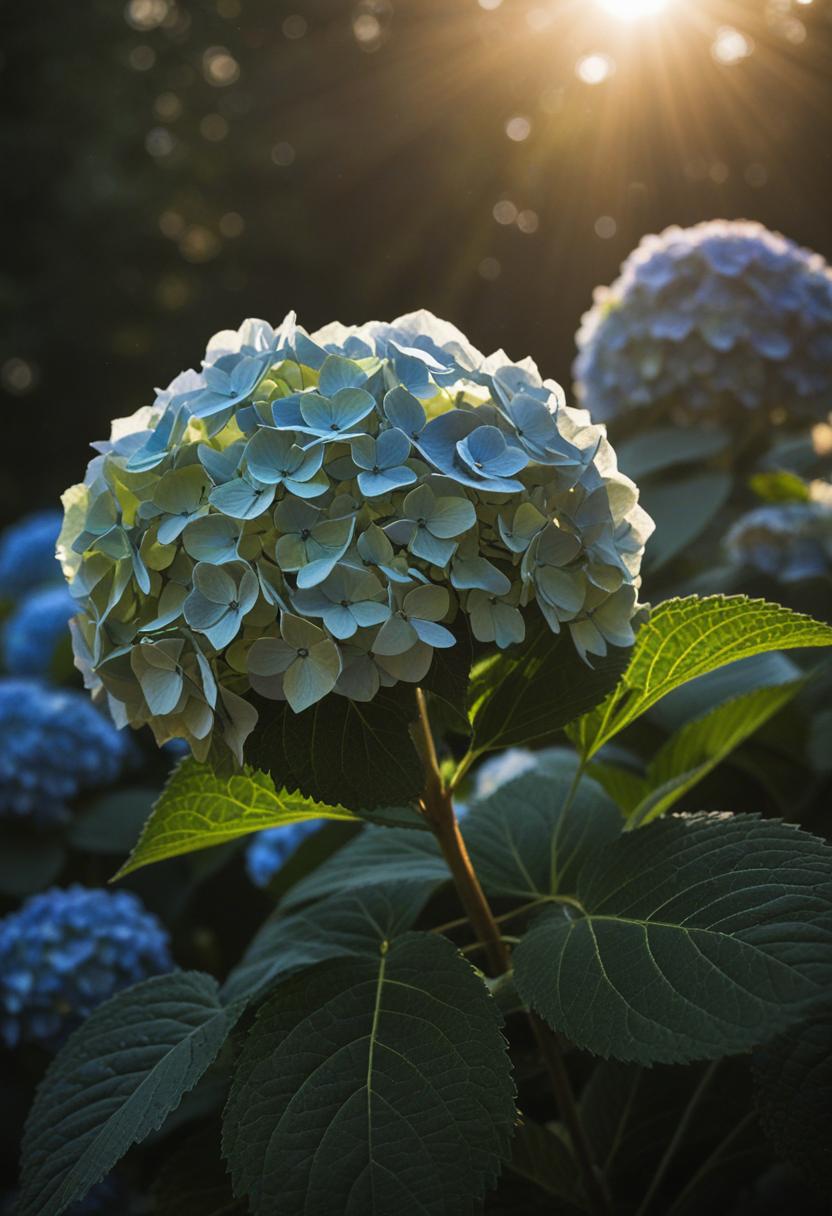 1. A dramatic hydrangea in enchanted studio lighting, backlit for a mystical, dreamy aesthetic. Soft shadows and vibrant blooms create a whimsical, magical atmosphere.