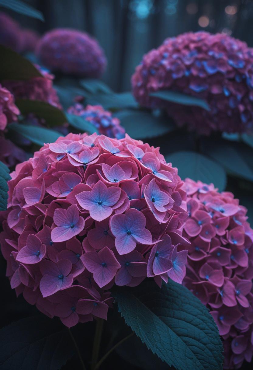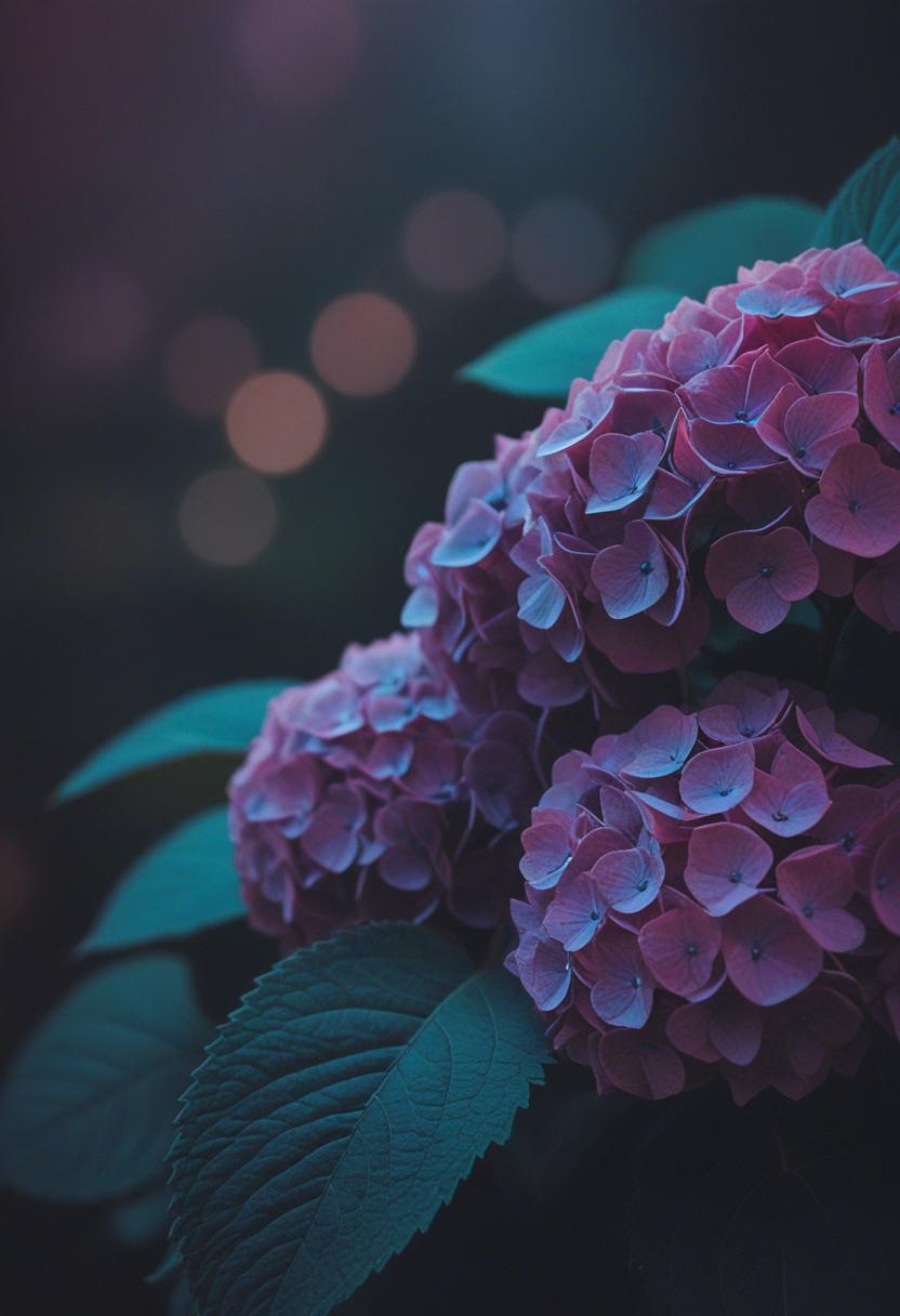 68. A moody close-up of a hydrangea under neon glow, capturing its vibrant petals in a dreamy, aesthetic light.