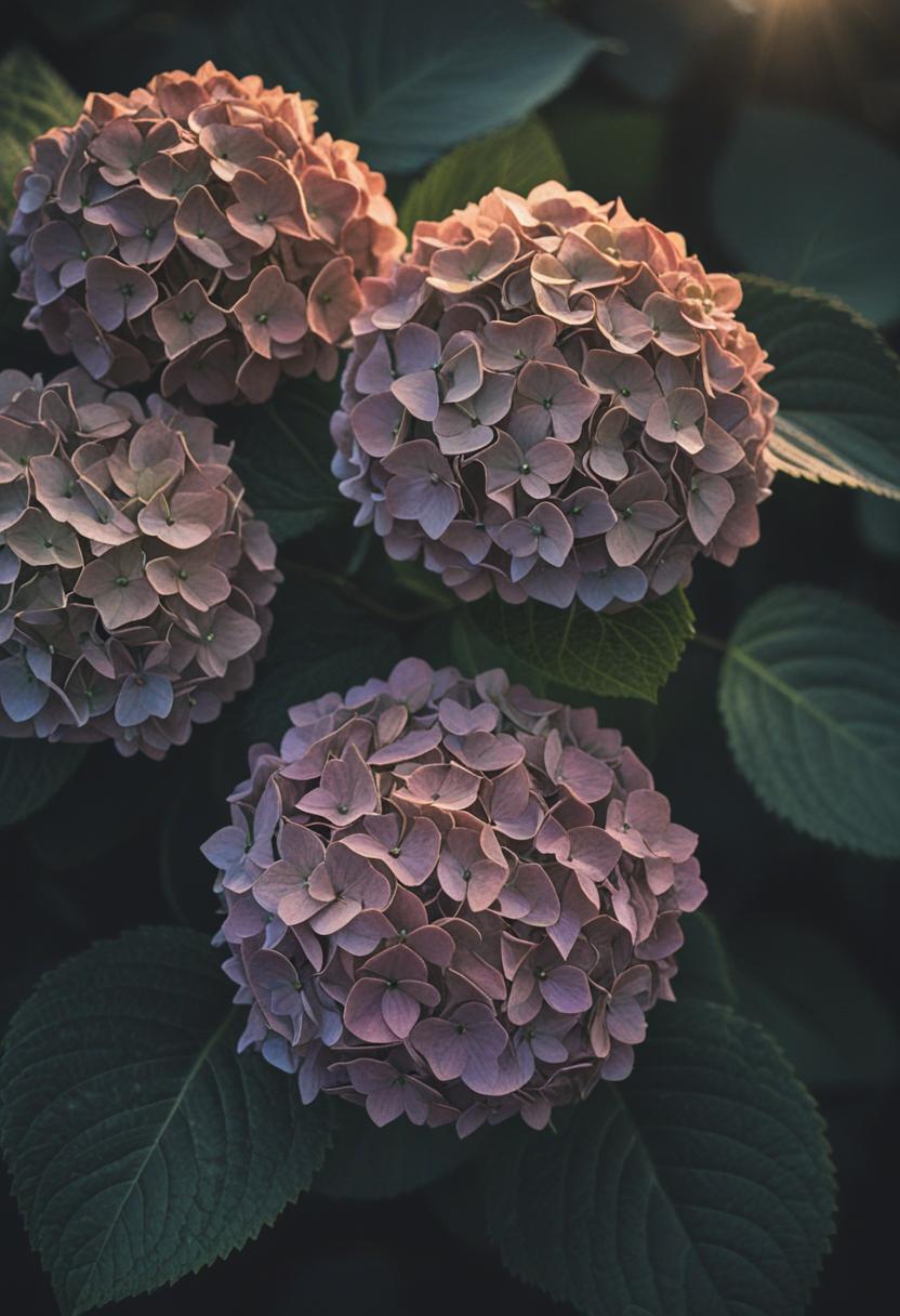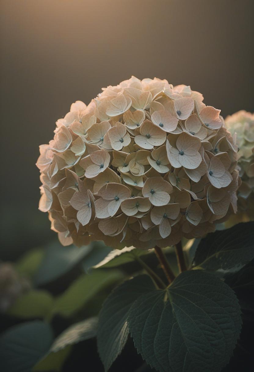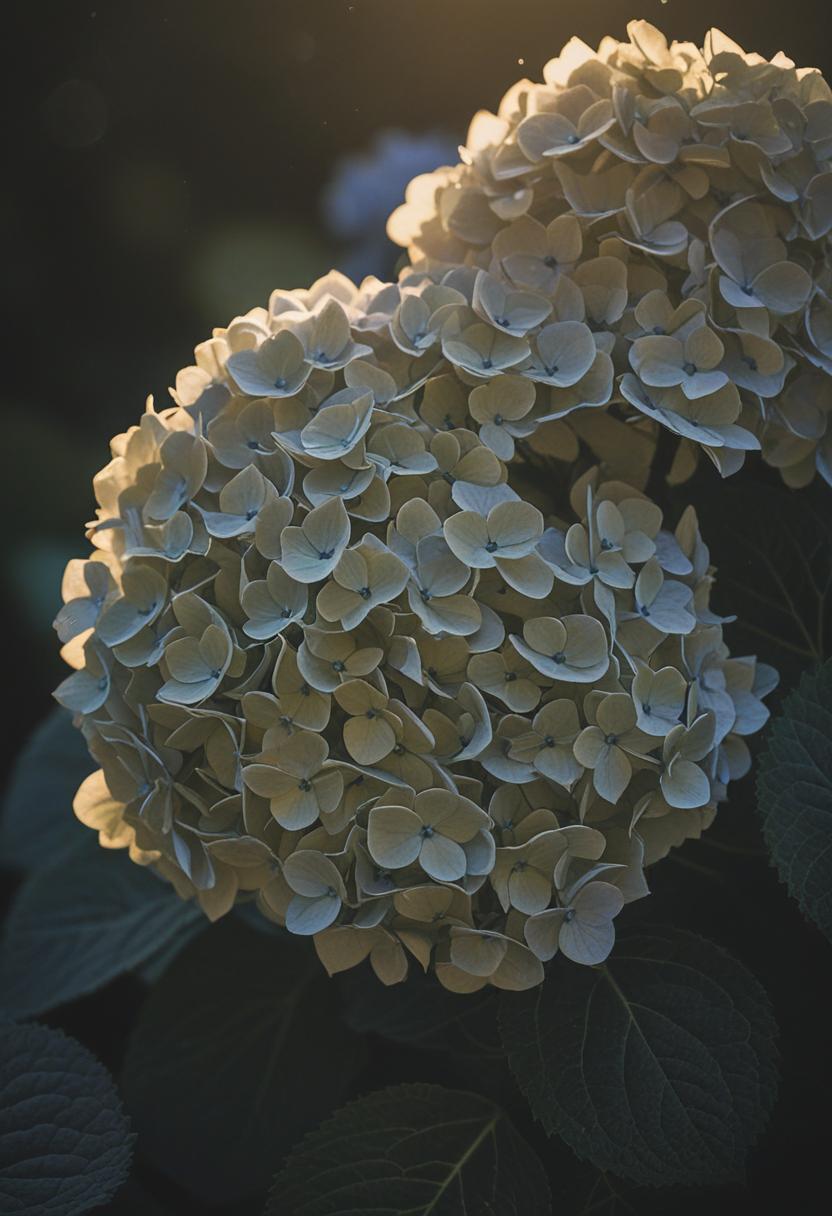 44. A dramatic close-up of a hydrangea in golden hour light, showcasing soft petals and rich hues, evoking a serene, elegant, and nostalgic floral aesthetic.