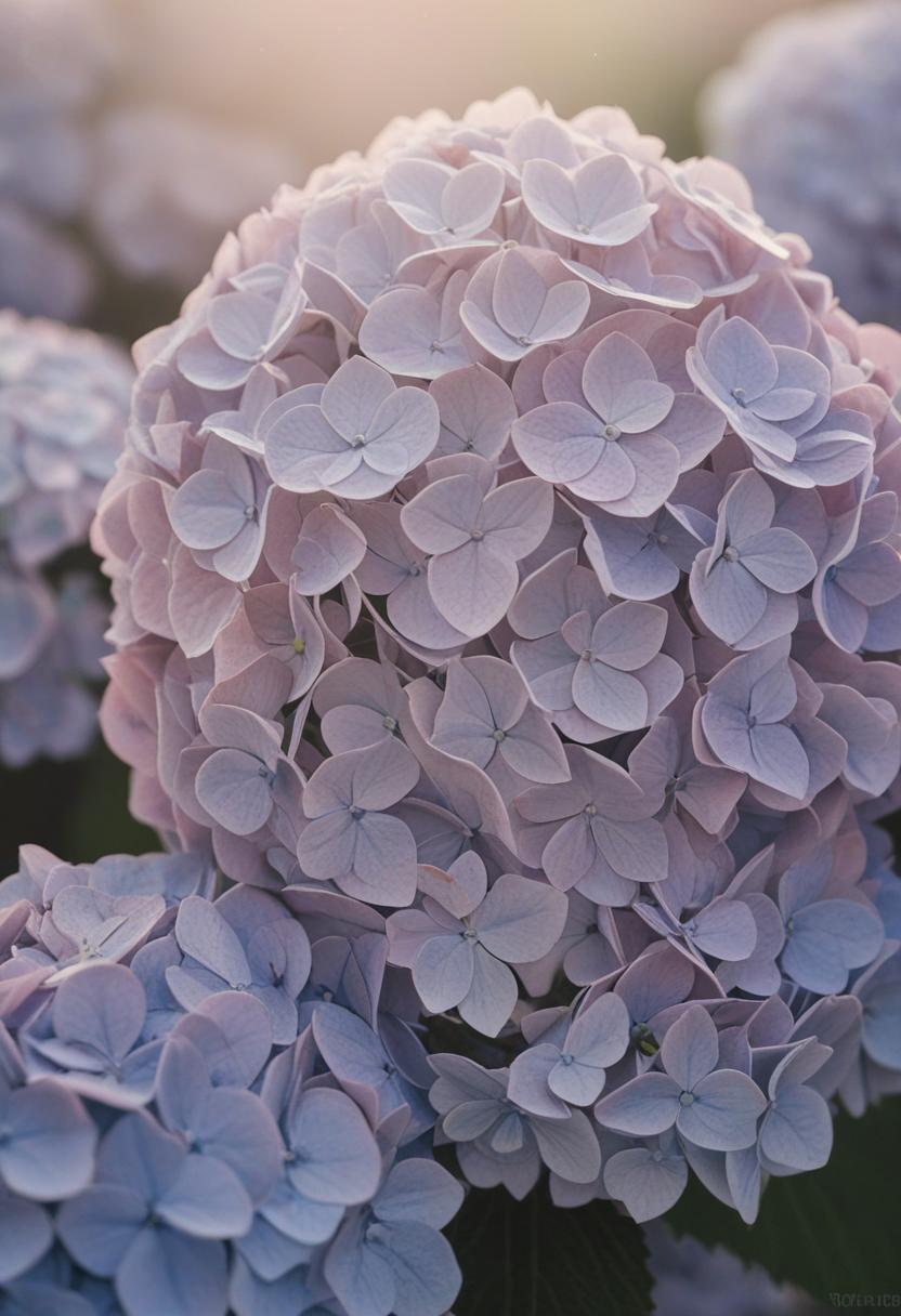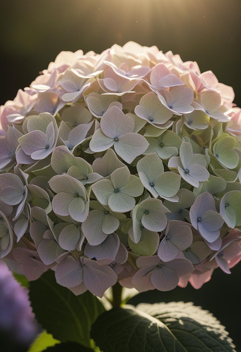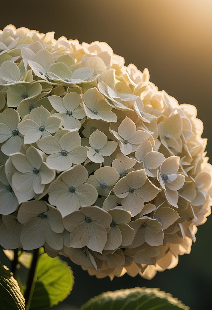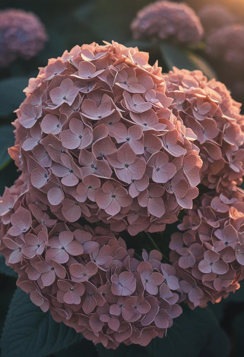 44. A dramatic close-up of a hydrangea in golden hour light, showcasing soft petals and rich hues, evoking a serene, elegant, and nostalgic floral aesthetic.