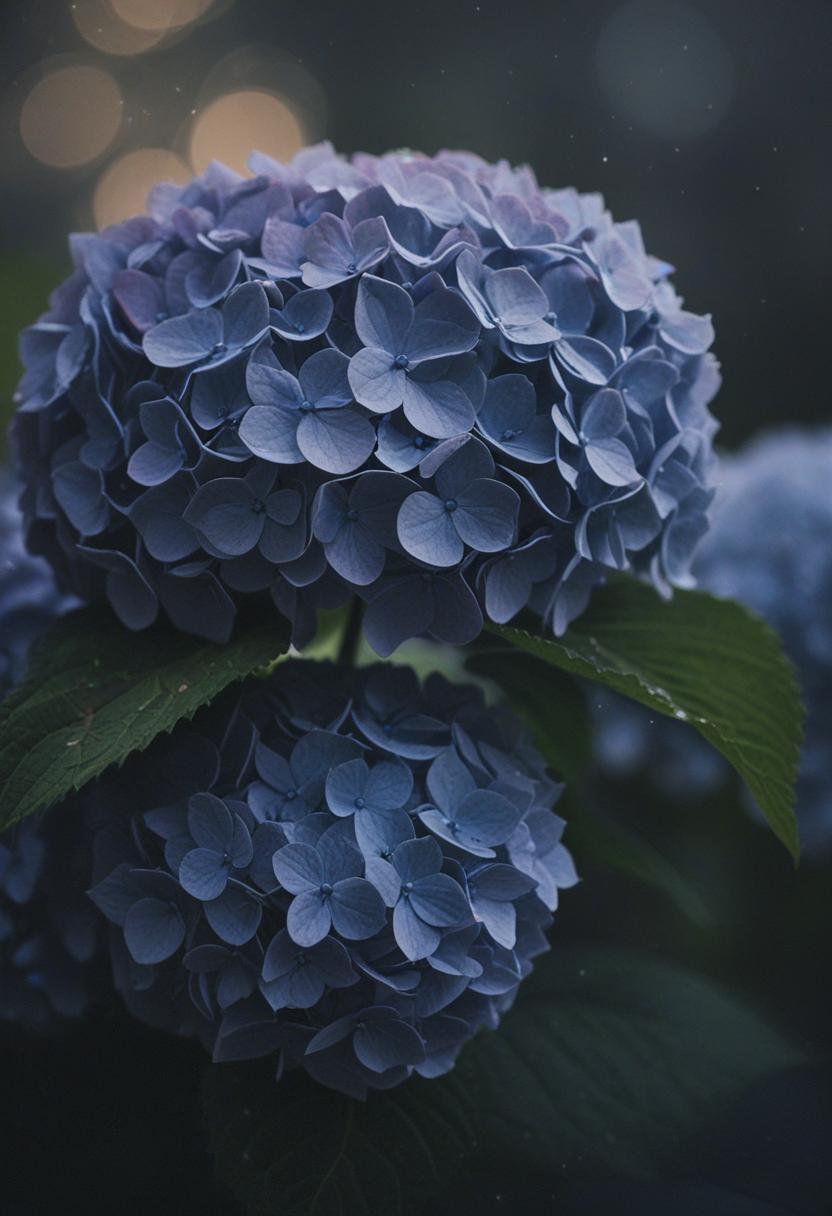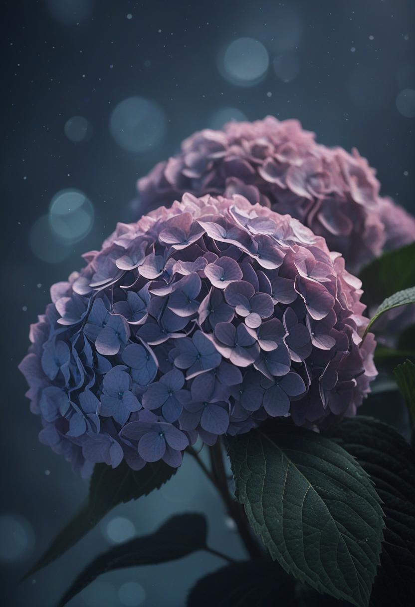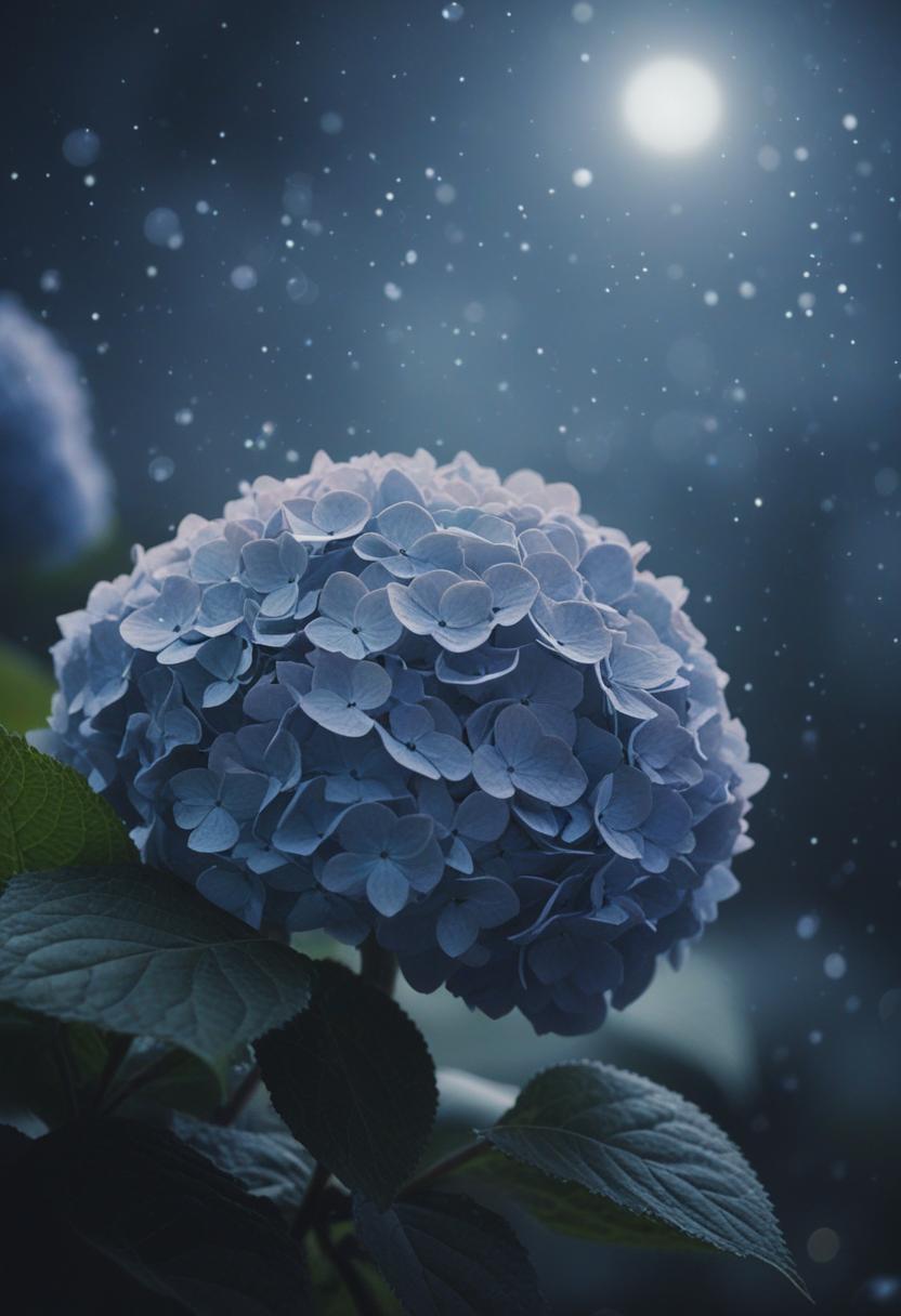 8. A moody midshot of a hydrangea under starlit skies, capturing a dreamy, ethereal hydrangea aesthetic with soft lighting and deep shadows.
