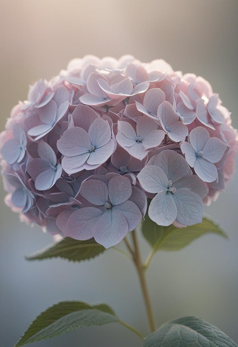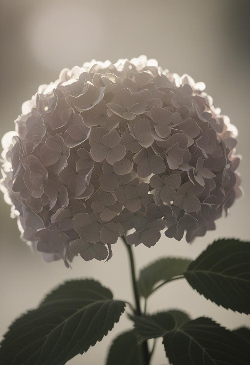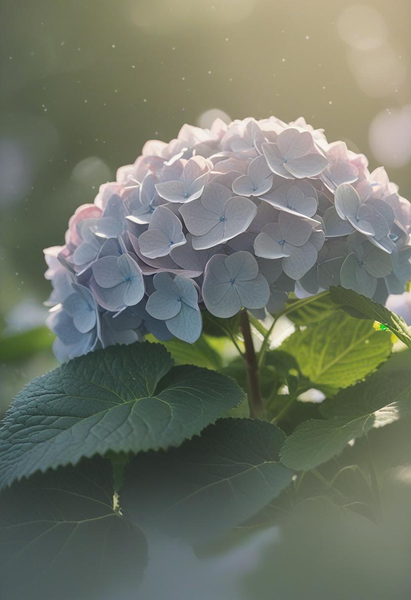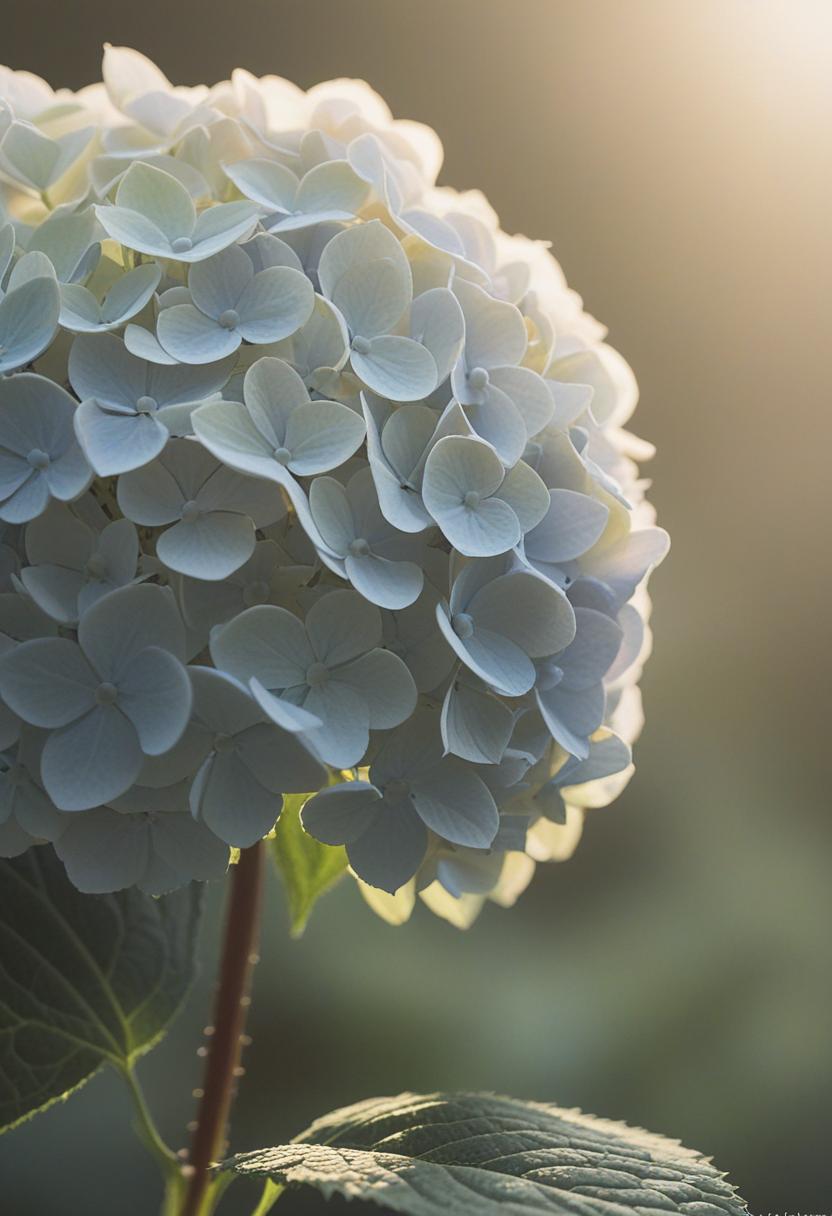 35. A soft hydrangea blooms under gentle morning light, glowing softly from the side, capturing a serene and dreamy aesthetic.