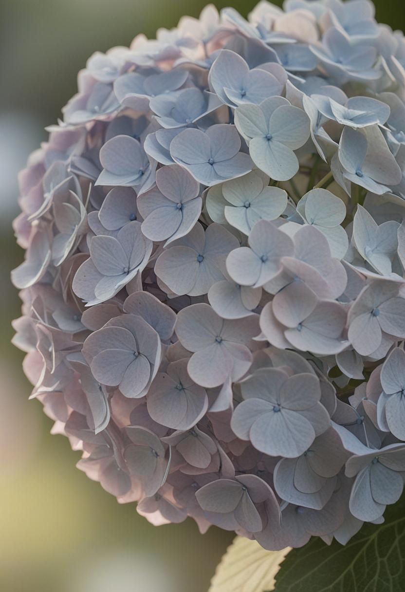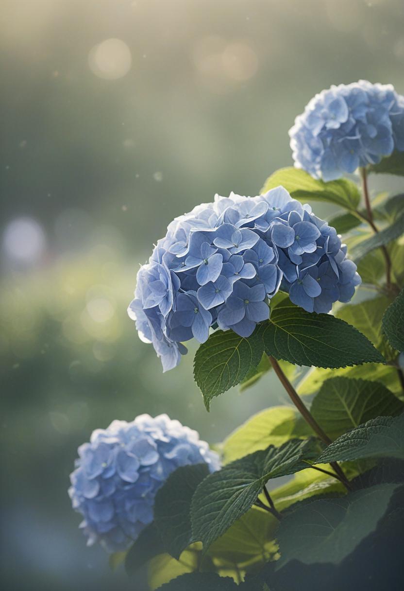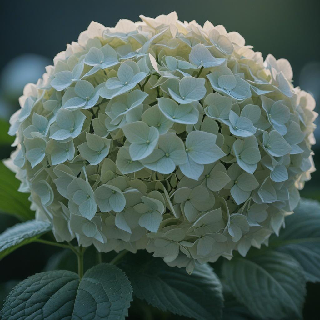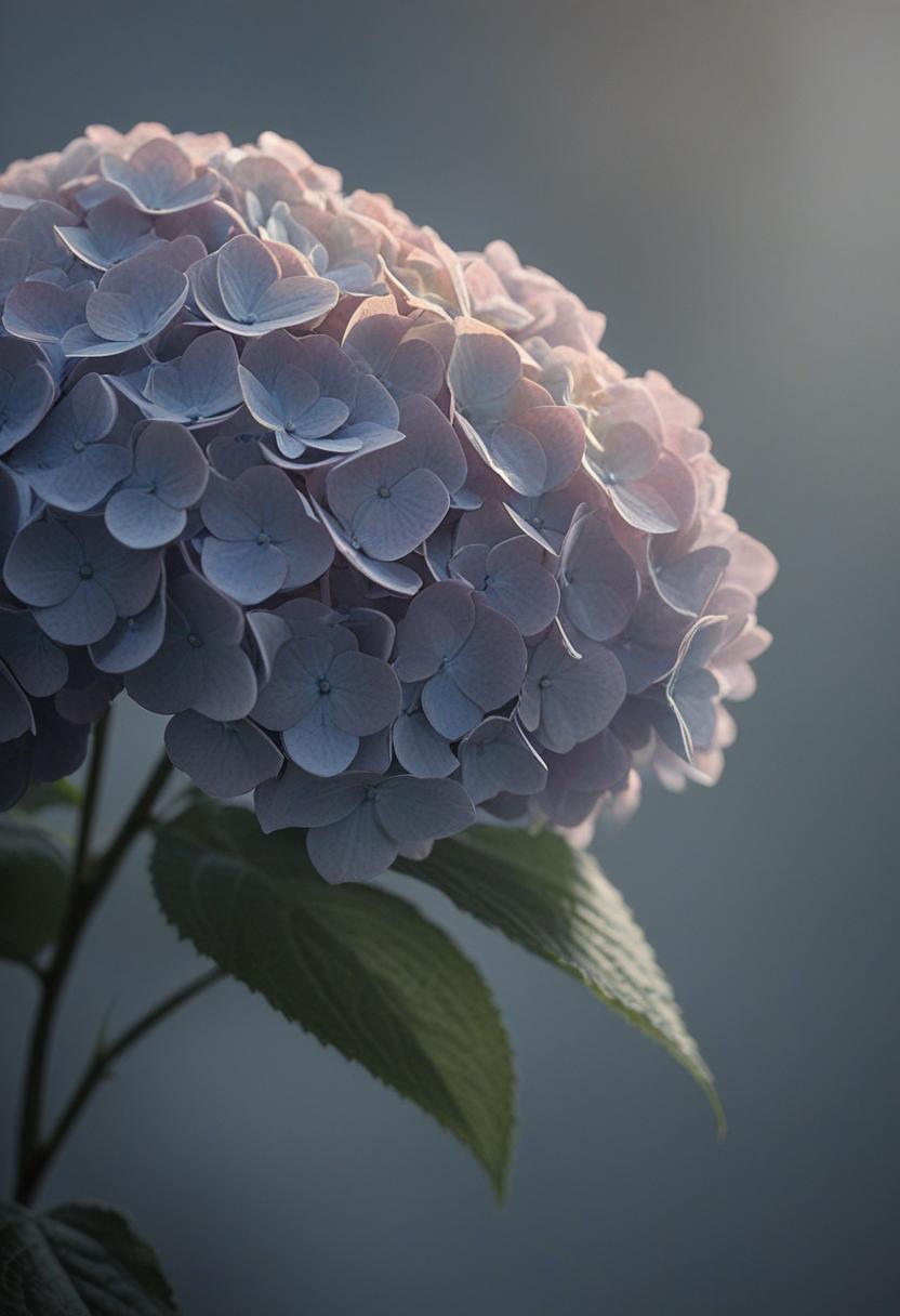 35. A soft hydrangea blooms under gentle morning light, glowing softly from the side, capturing a serene and dreamy aesthetic.