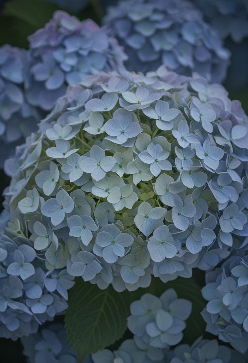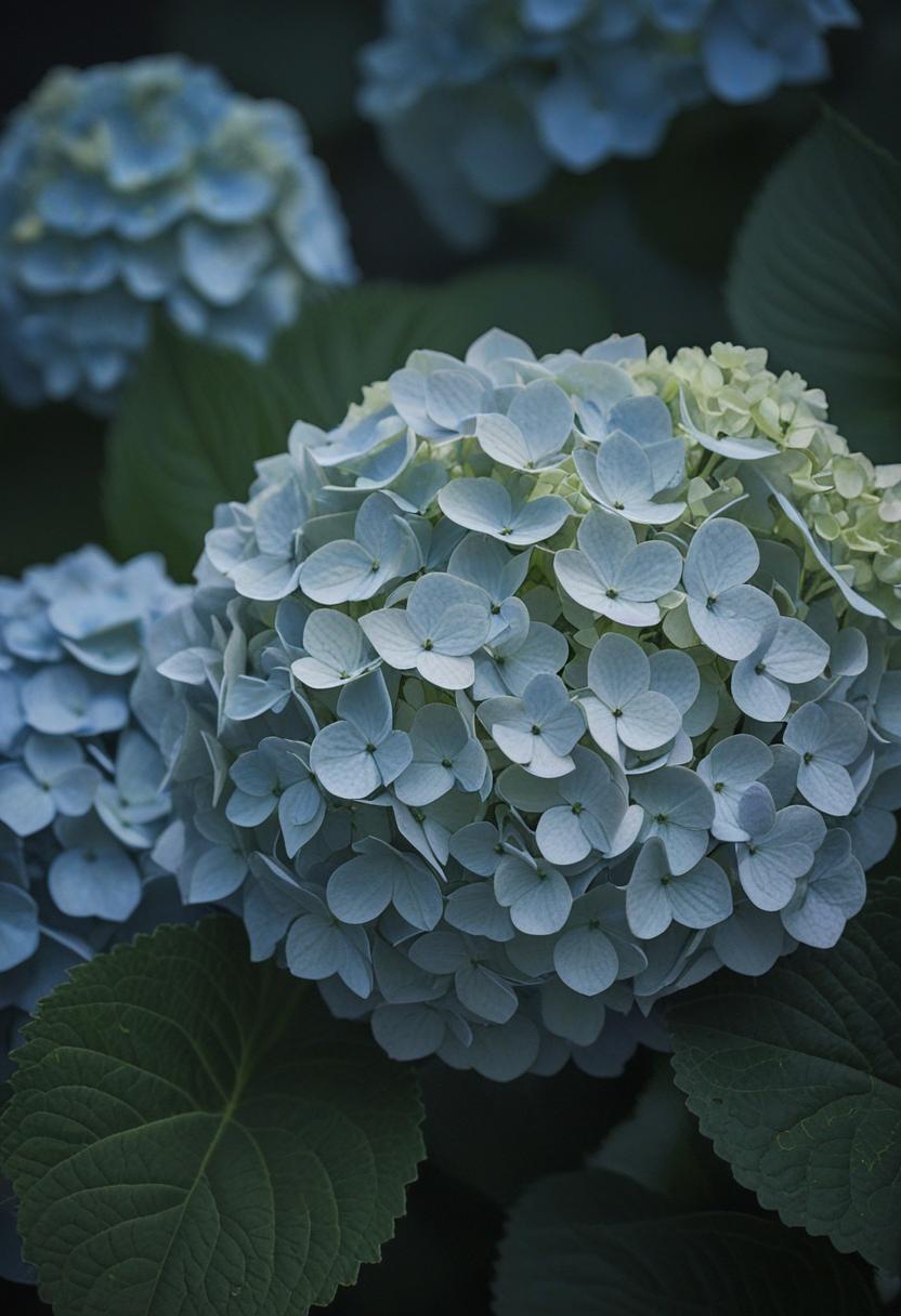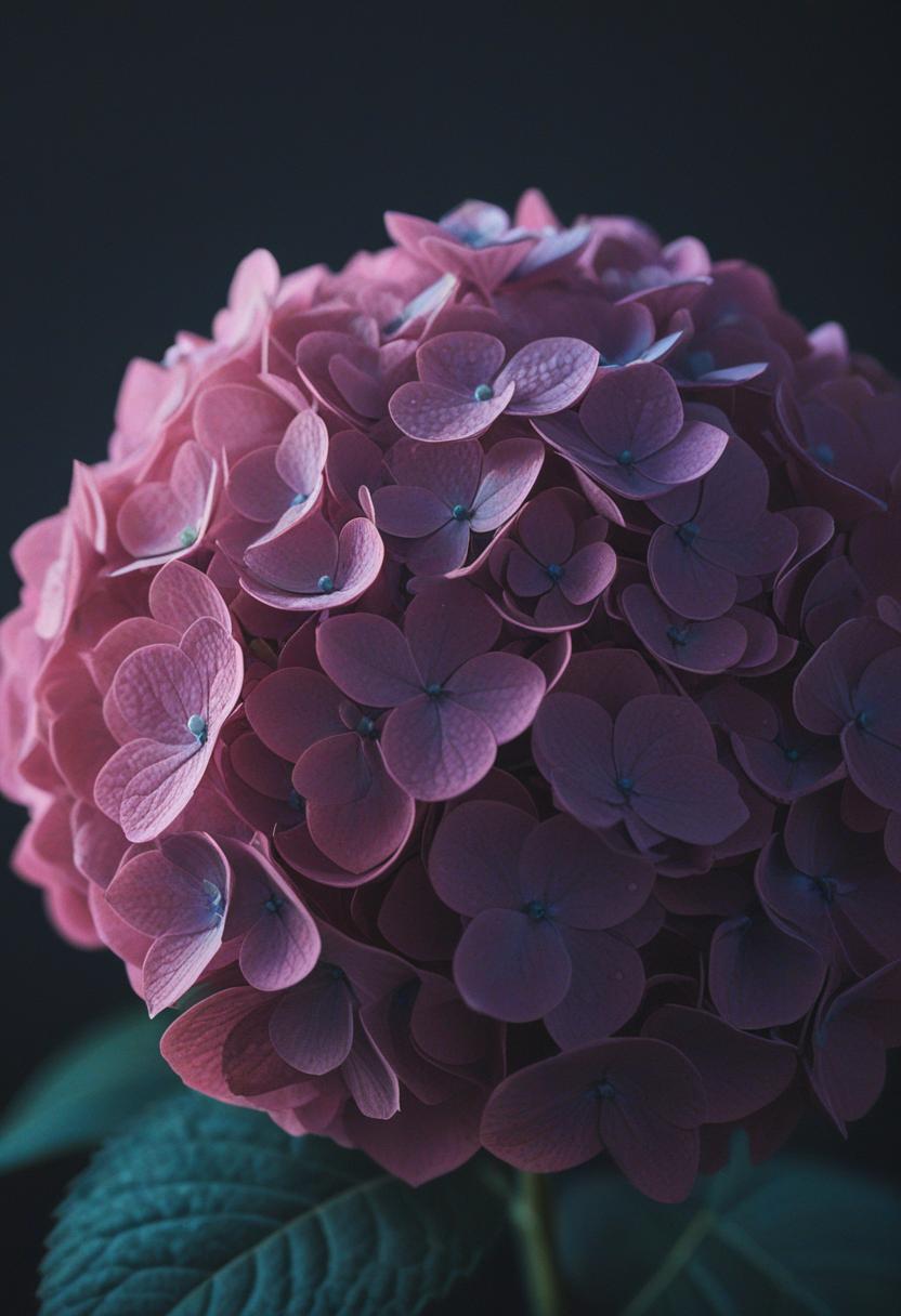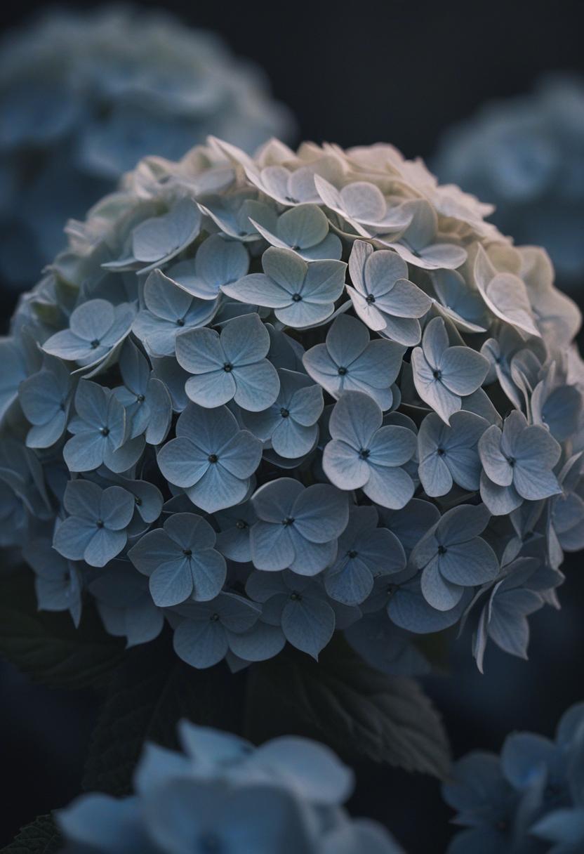 28. A moody close-up of a hydrangea under starlight, capturing soft shadows and delicate petals in a dreamy, ethereal atmosphere.