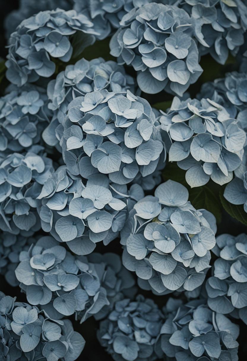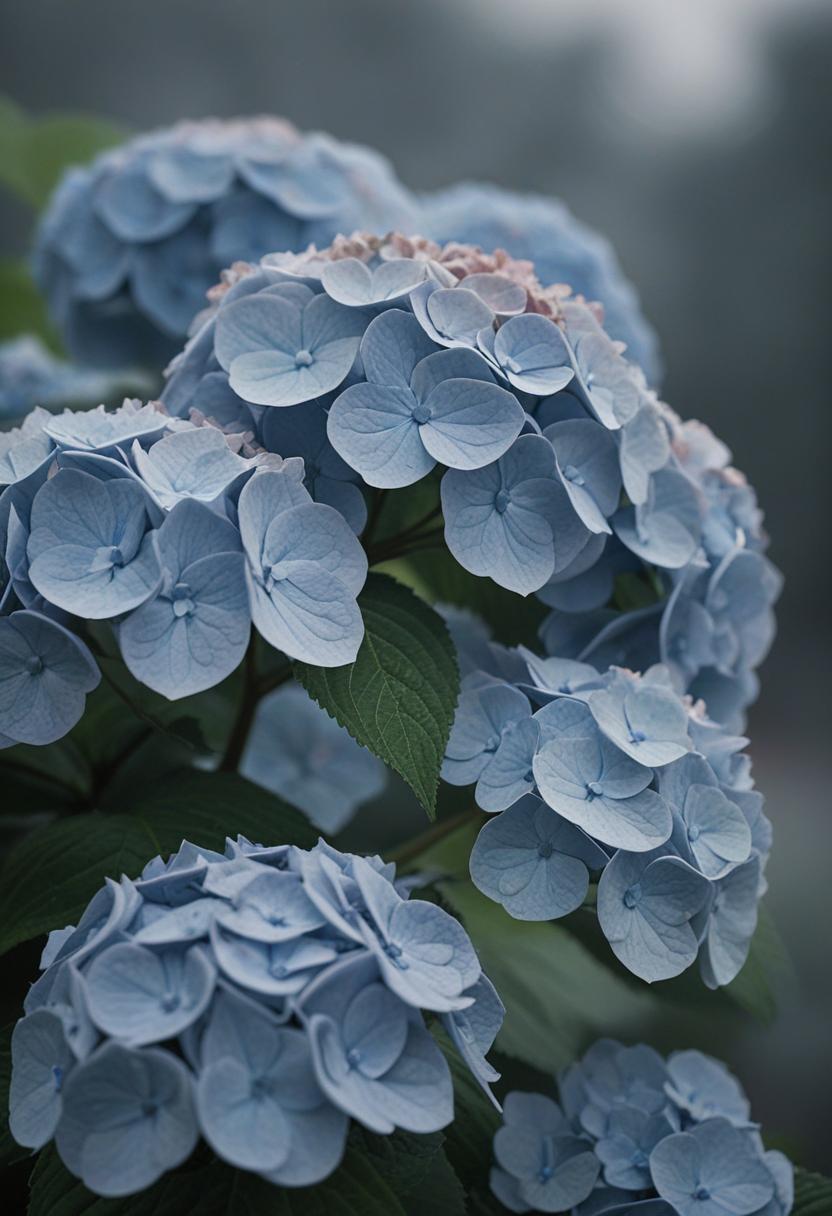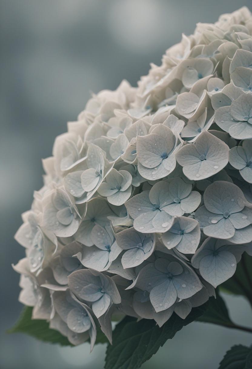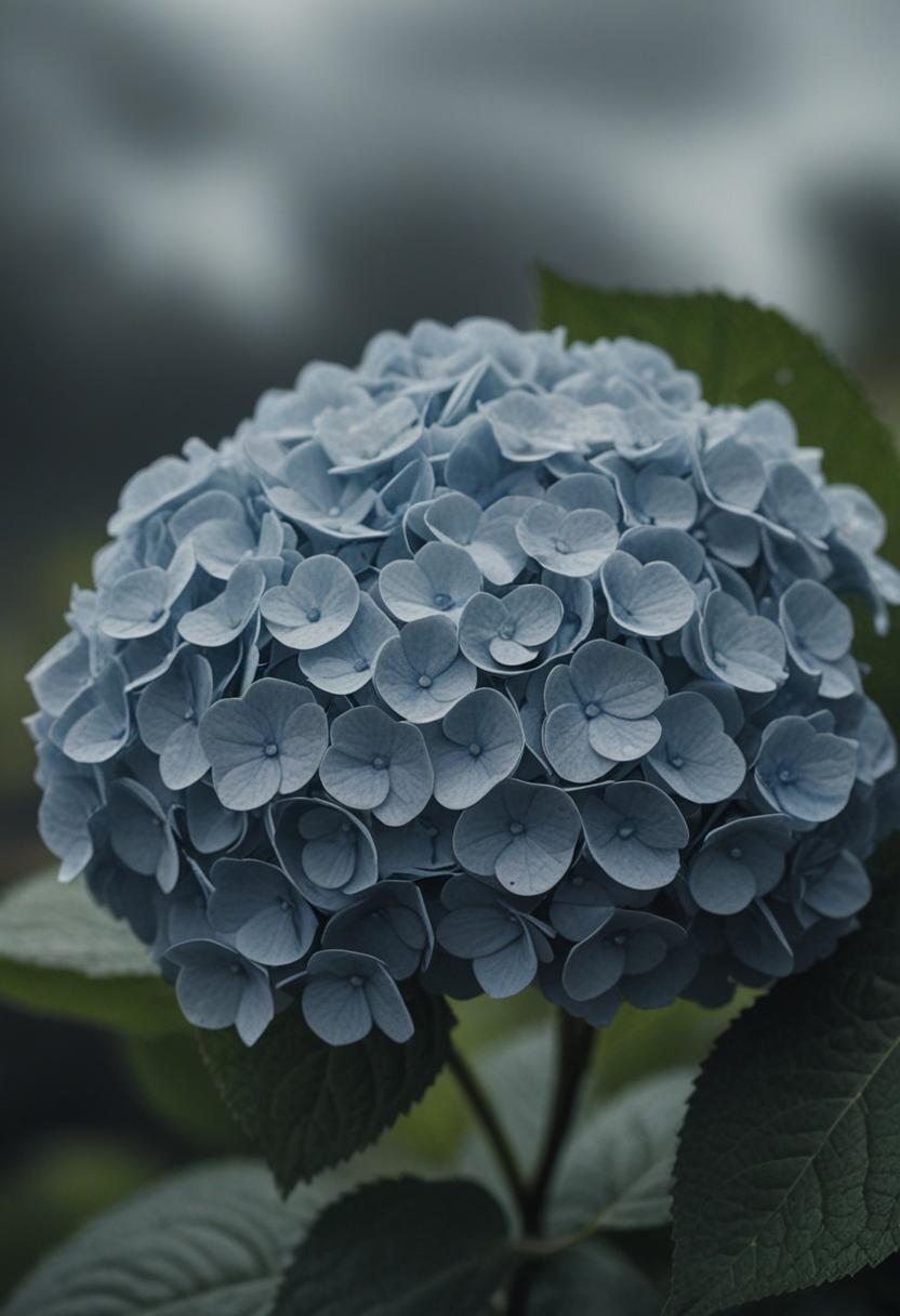 66. A moody close-up of a hydrangea under cloudy, overcast skies, capturing soft shadows and muted tones in a serene, ethereal hydrangea aesthetic.