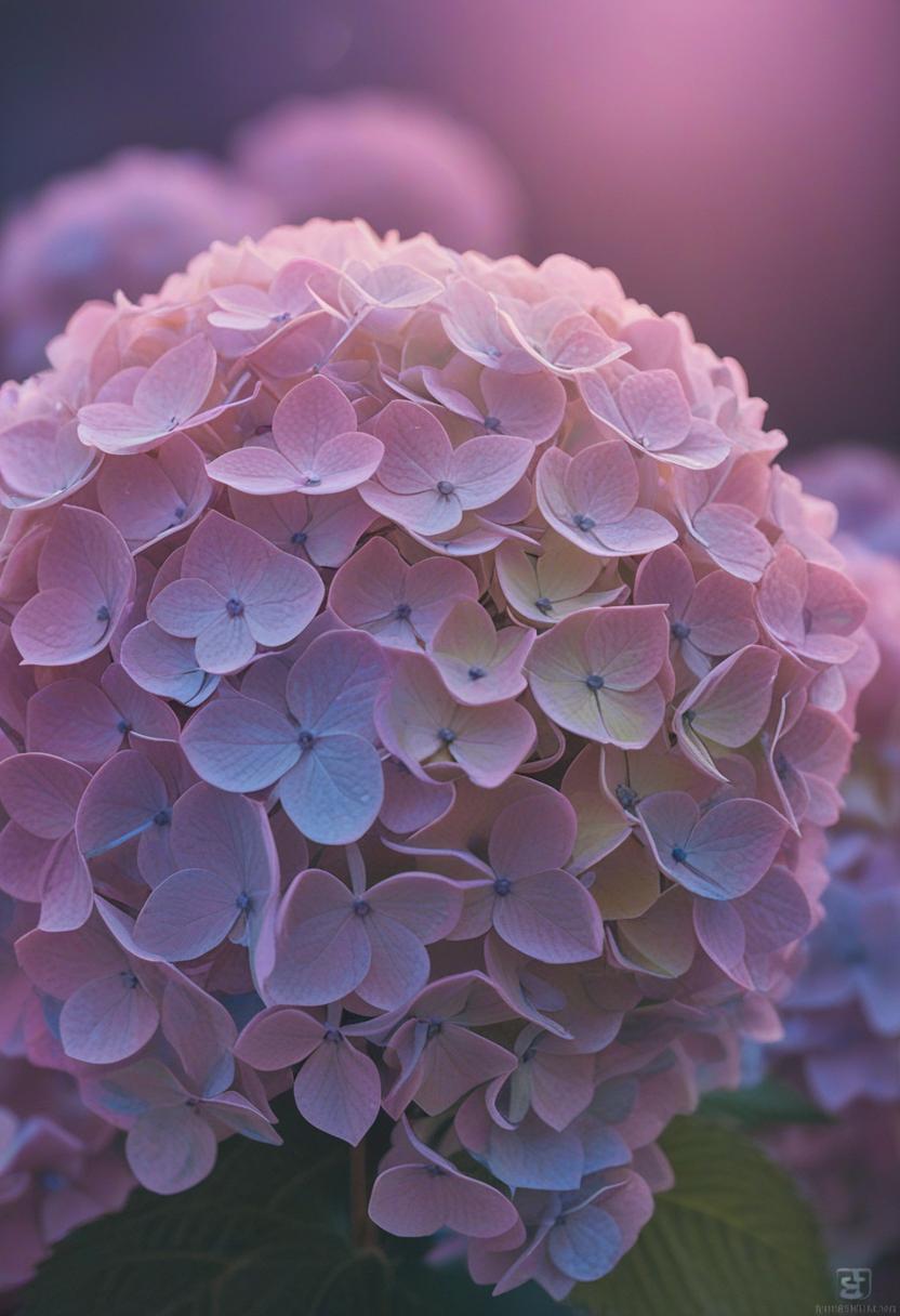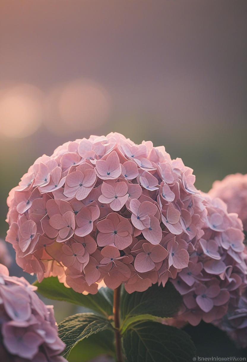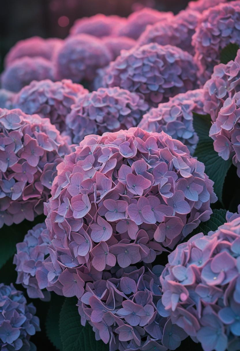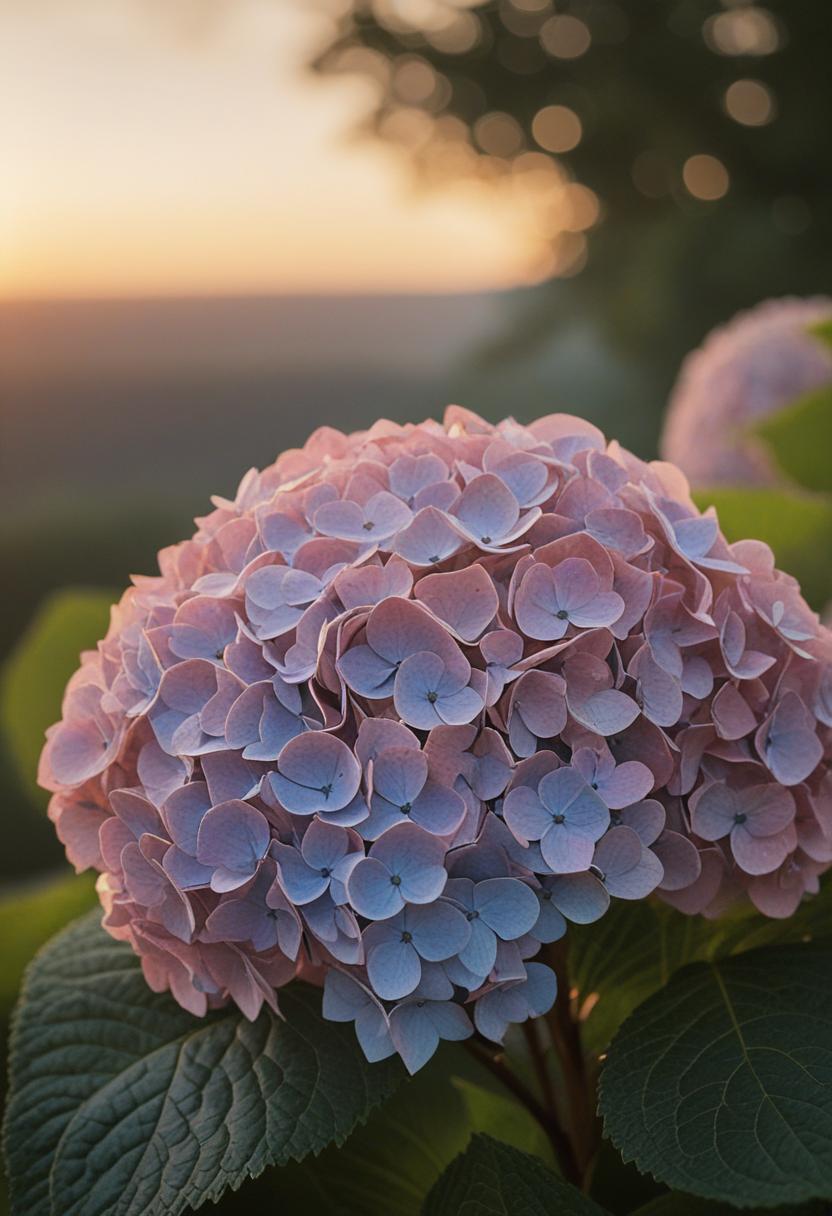 11. A midshot of a hydrangea under a vibrant sunset, blending soft pink and purple hues, creating a dreamy, fantasy-like atmosphere with a calming, aesthetic glow.